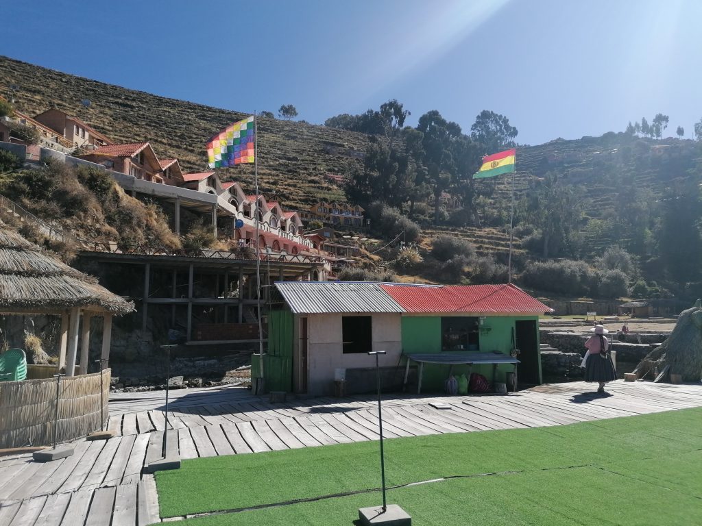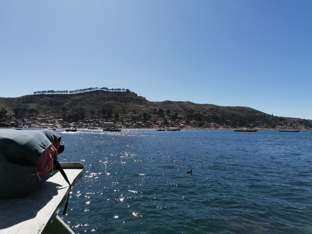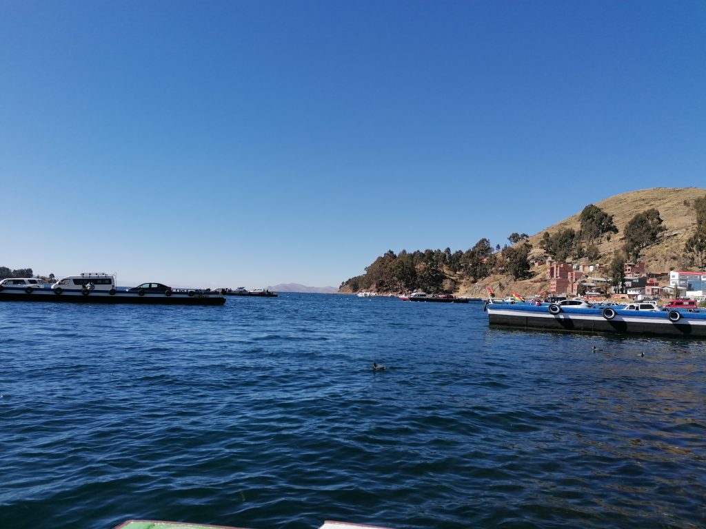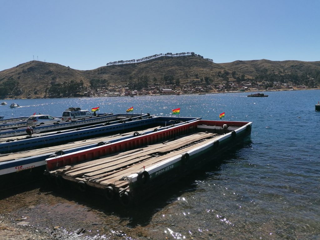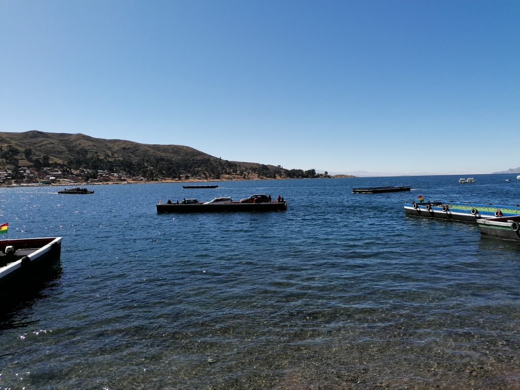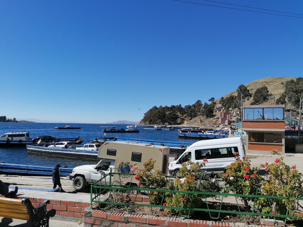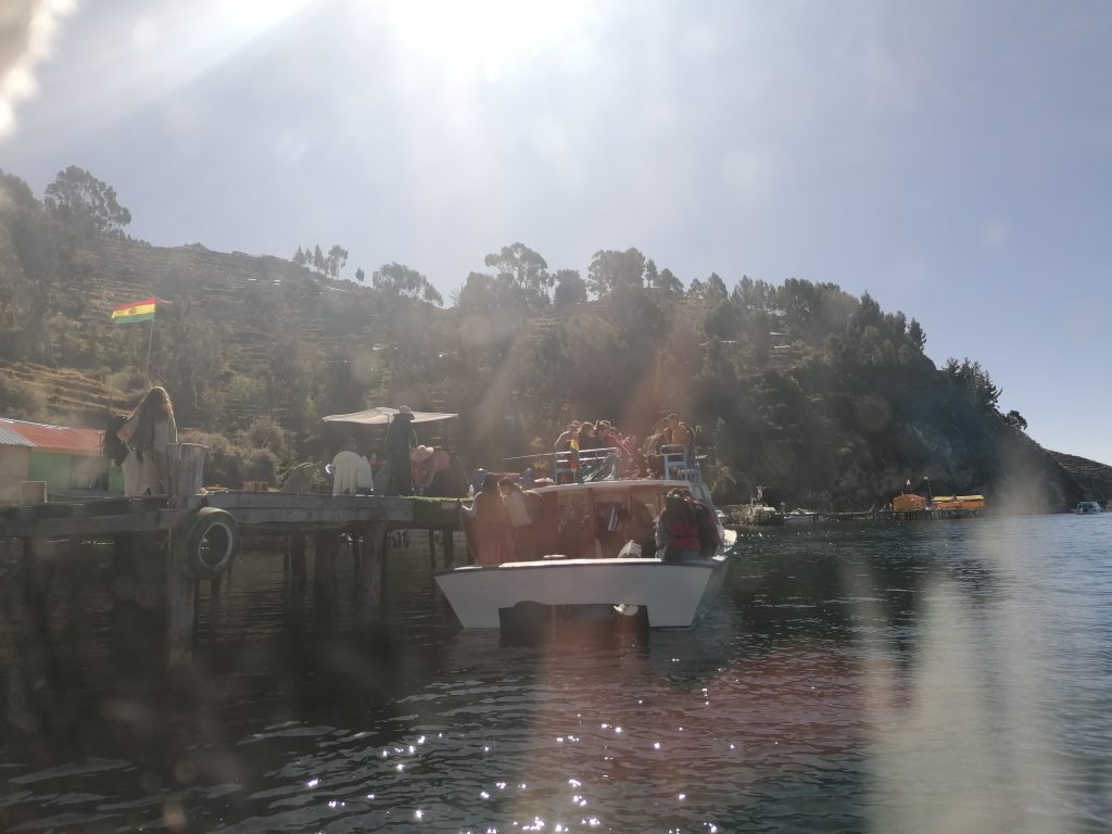 Nach einer Ewigkeit kommt auch der Bus nach, wir steigen wieder ein und fahren das restliche Stück bis Copacabana. Der Bus hält direkt vor einer Firma, wo wir unsere Weiterfahrt nach Peru kaufen können, sowie ein Ticket für das Boot, das uns auf die Sonneninsel bringen soll. Praktisch. Auch unsere Rucksäcke können wir dort abstellen, sodass wir noch kurz was in der Stadt essen können. Das Restaurant ist so mittel, familiengeführt und ein kleines Mädchen will ständig unterhalten werden. Viel Zeit bleibt uns aber sowieso nicht, wir holen unsere Rucksäcke ab und bekommen unser Ticket für’s Boot. Als sie uns den Weg zum Ablegeort erklärt, wird mir mulmig… das ist nämlich ganz am anderen Ende des Hafens. Bis wir dort hingedackelt sind, ist es schon zu spät. Wir beeilen uns, fragen am Hafen nach dem Boot und kommen gerade noch rechtzeitig. Puh, erstmal durchatmen.