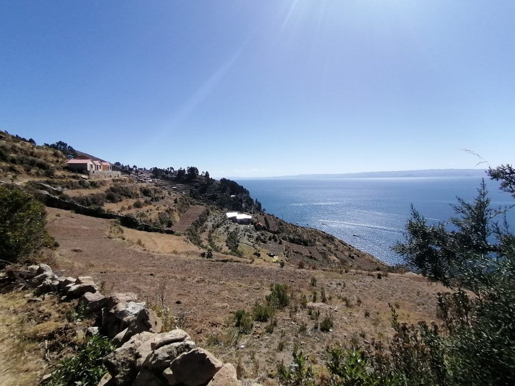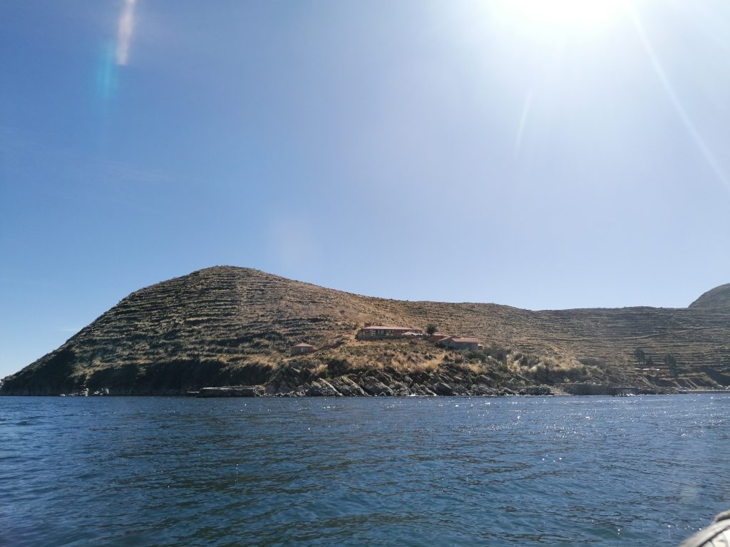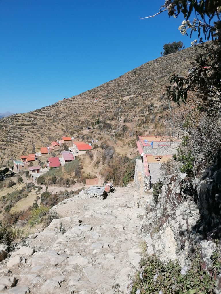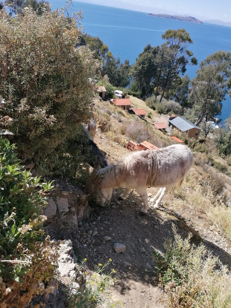 Die Insel ist traumhaft, hat aber ein Problem… es ist ein einziger Berg… und unsere Unterkunft liegt so ziemlich auf dem Gipfel. Es gibt nur Pfade, keine Autos, keine Straßen… es gäbe Esel, aber die gehören natürlich jemandem, sowas wie ein Eseltaxi gibt es nicht… es hilft alles nichts, wir müssen unser tonnenschweres Gepäck dort hoch schleppen. Unterwegs treffen wir allen Ernstes Almut nochmal, sagen aber nur kurz Hallo, sie ist mit einem anderen deutschen Mädel unterwegs und wir wollen es so schnell wie möglich hochschaffen, damit wir Ruhe haben. Wir müssen regelmäßig stehen bleiben, durchschnaufen, Rucksack absetzen. Es ist echt hart, die Sonne knallt auch runter… und es hilft nicht, dass wir auf über 4000 Metern Höhe sind. Zu allem Übel verlaufen wir uns auch noch, weil es keine wirkliche Route auf Google Maps bin.