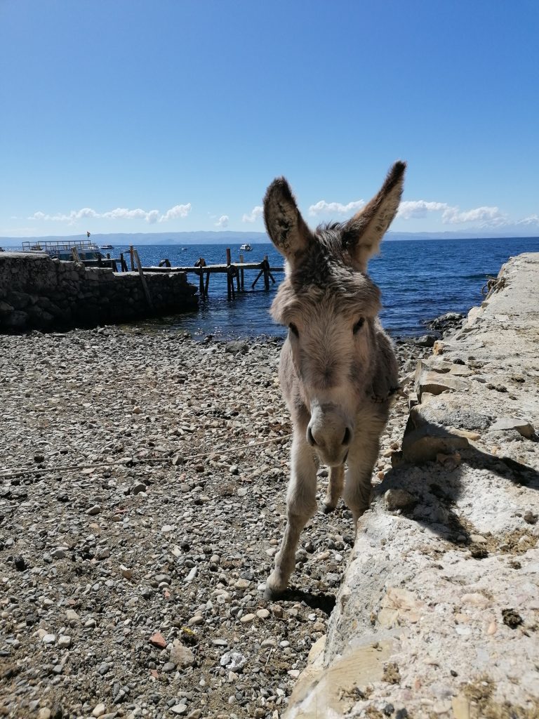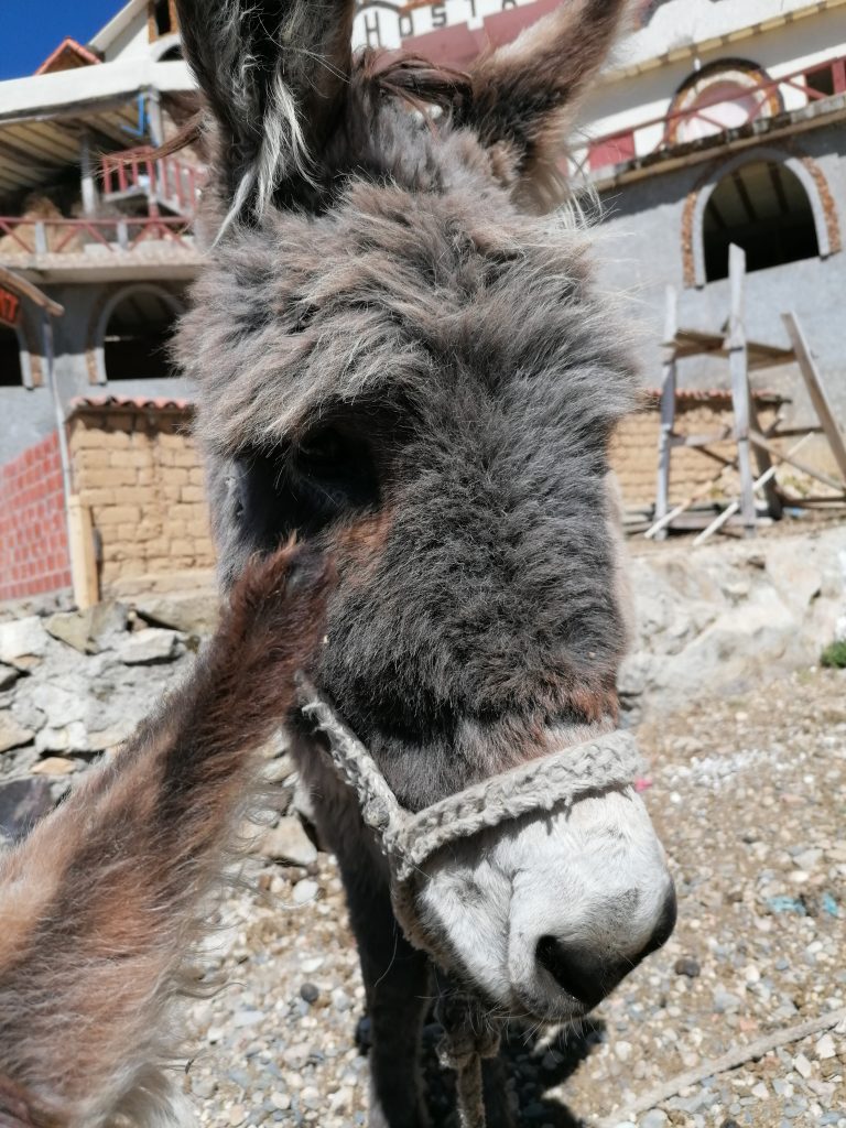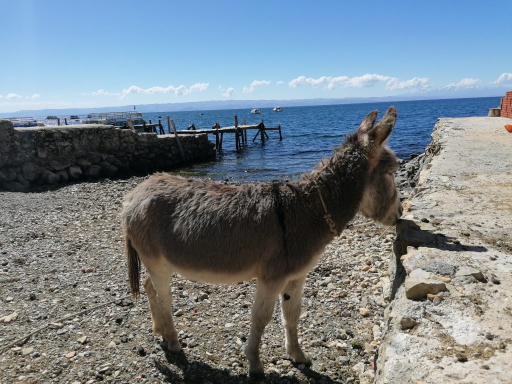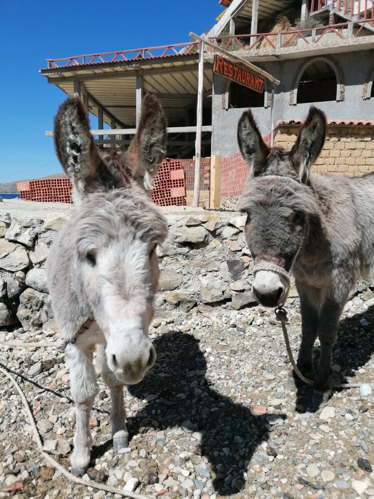 Unterwegs fragen wir nach Restaurants, doch noch hat nichts offen, wir sind noch zu früh. Das einzige, das offen hat, ist das direkt an der Anlegestelle, das wir bei der Ankunft schon bemerkt haben. Dort kann ich auch Trucha (Forelle) essen, für die der Titicacasee berühmt ist. Leider ist meine nicht so der Hammer. Nach dem Essen haben wir immer noch Zeit totzuschlagen. Am Ufer stehen ein paar Esel, da muss ich doch mal hinschauen. Ich streichle die beiden ein bisschen, die das wohl nicht allzu häufig spüren, denn sie freuen sich richtig.