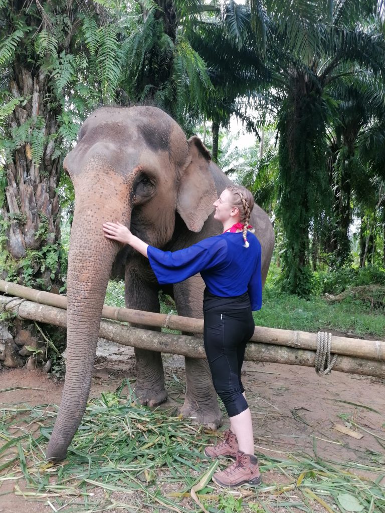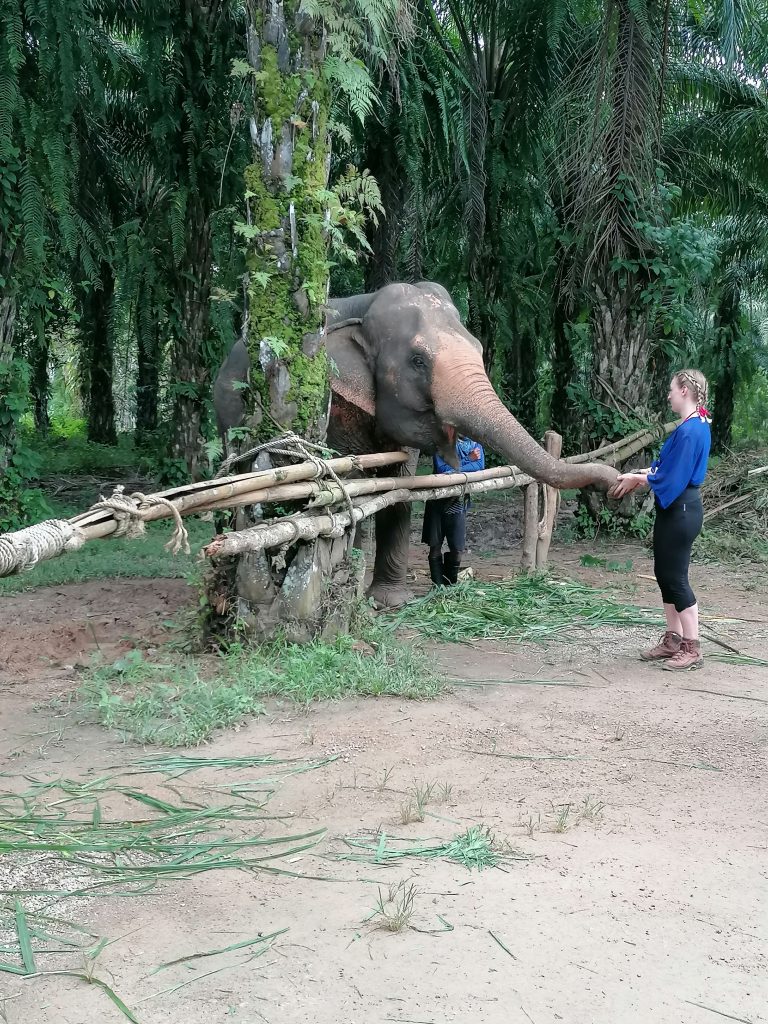 Mir war bei meiner Wahl wichtig, dass die Elefanten im Freien leben und nicht angebunden oder unwürdig behandelt werden. (Heißt übrigens Krabi Elephant Love&Care) Als ich nachfrage, erfahre ich, dass es hier ca. 60 Elefanten gibt, die auf einem großen Waldterritorium leben. Sie holen jeden Tag drei „neue“ Elefanten, sodass nicht immer dieselben den Touristen ausgesetzt sind. Diese machen drei Mal die kleine Tour und dürfen dann wieder für ein paar Wochen Pause machen. Das war für mich der Mittelweg zwischen „Dem Tier geht es gut“ und „Will anfassen“ – Bin halt auch keine Heilige. Denn der Moment, als ich zum ersten Mal in meinem Leben einen Elefanten anfassen darf, ist absolut magisch. Die raue, trockene Haut und die dicken Borsten sind ein Gefühl, dass ich mit nichts anderem vergleichen könnte. Am ehesten noch mit einem Schwein, aber auch das kommt kaum ran.