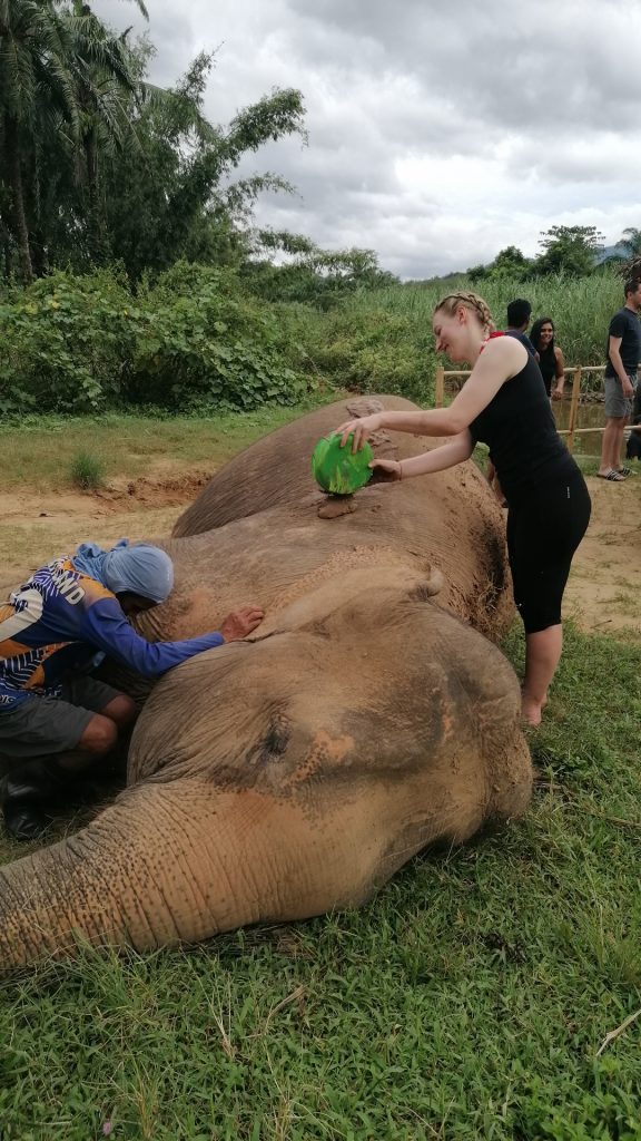 Nach etwa 15 Minuten kommen wir an einem breiten Bach an. Dort haben die Touristen kurz Zeit, in Badekleidung zu wechseln, wenn sie wollen. Der Guide fragt nach, wer den Zusatz gebucht hat, dem Elefanten ein Matschbad zu geben: ICH NATÜRLICH!!! Und ich bin die Einzige! Boah, aber die paar Baht mehr haben sich voll gelohnt. Während die anderen beiden Elefanten schonmal in Richtung Fluss gelotst werden, bringt einer der Elefantenführer sein Tier dazu, sich hinzulegen. Ich bekomme einen Eimer mit Matsch in die Hand gedrückt und dafür drücke ich dem Guide mein Handy in die Hand. Der Mann bittet mich mehrfach in die Kamera zu schauen, aber ich denk gar nicht dran. Ich bin so vertieft darin, den Matsch auf der rauen Elefantenhaut zu verteilen, dass ich alles um mich herum vergesse. Hoffentlich kann der Elefant das auch ein bisschen genießen, für mich ist es einfach genial.