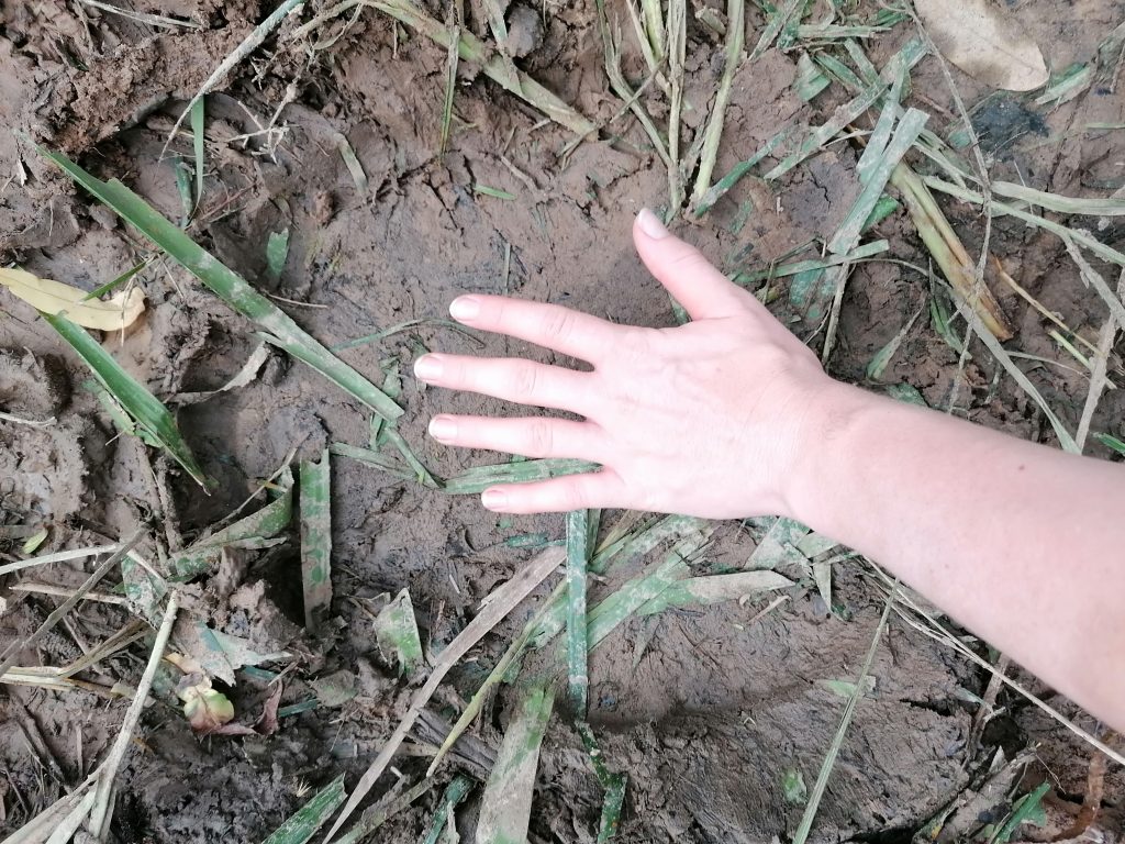 Während ich meine frischaufgelegte Matschschicht wieder von der Elefantenhaut schrubbe, fällt mir ein, dass Elefanten ja nach „Kuh“ und „Bulle“ benannt sind… als so wie Kühe. Und mit Kühen kenne ich mich ja aus. Bei uns zuhause im Stall, wenn eine Kuh beim Melken nervös ist, dann kratzen wir sie ein bisschen am Schwanzansatz… ein Genuss für Kühe, der mit einer Massage für Menschen im Schulterbereich vergleichbar ist. Meine Hände wandern also den Elefantenrücken entlang bis nach hinten zum Schwanzansatz und beginnen dort zu kratzen.