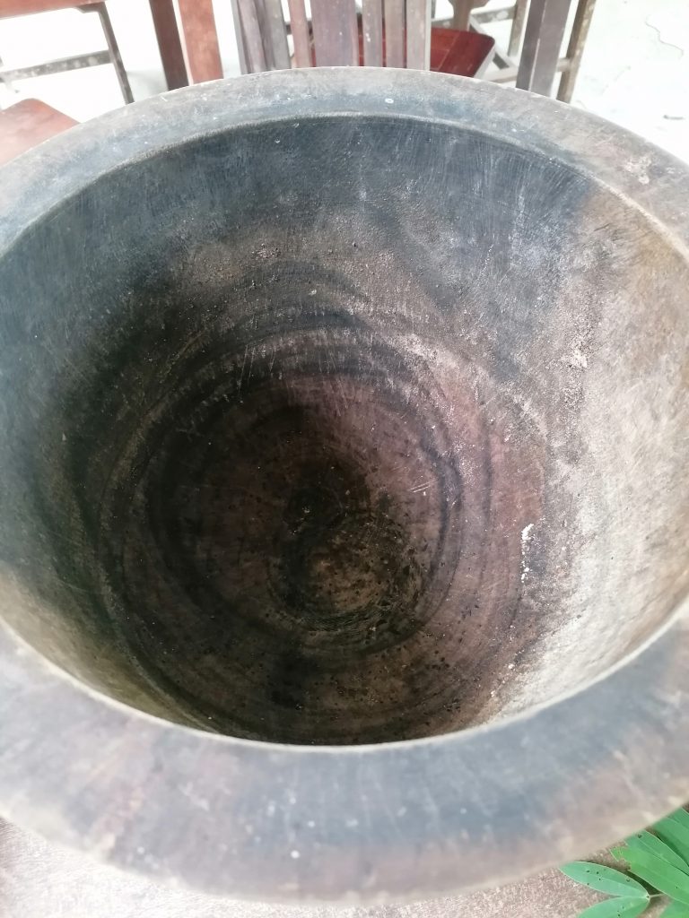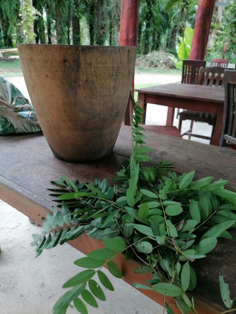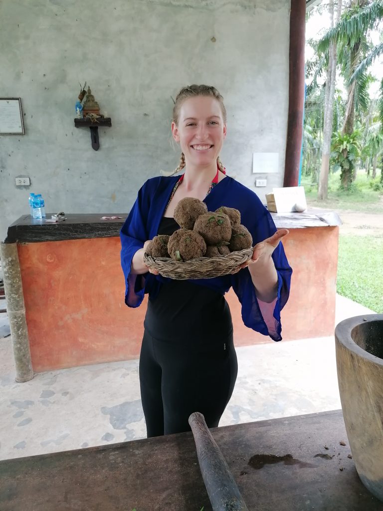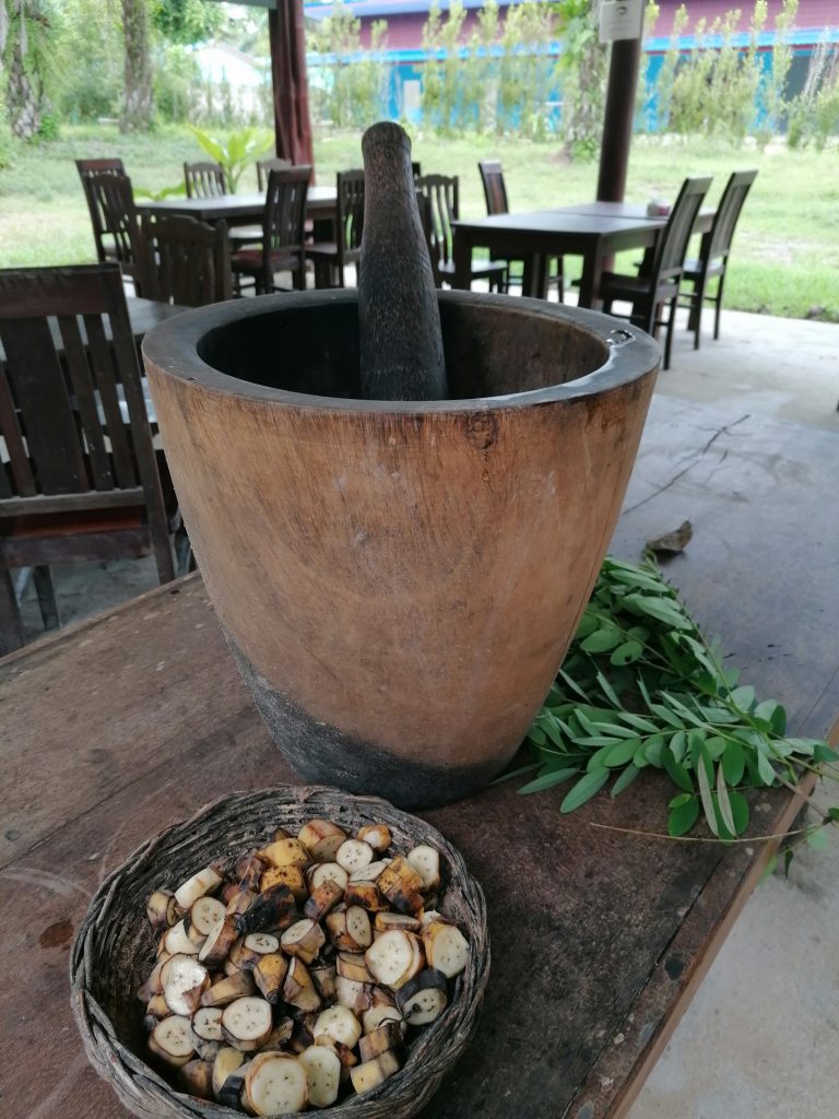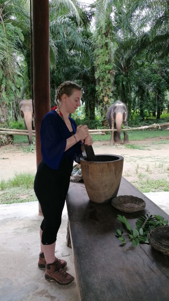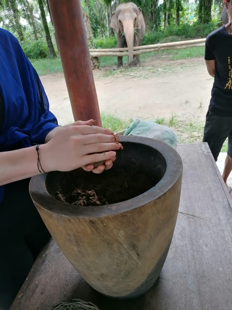 Ich lasse mich nicht aus der Ruhe bringen. Als nächstes geht es nämlich ans Futter kochen. Da die anderen beiden auf heißen Kohlen sitzen, sehen sie mir dabei zu. Der Guide stellt ein hohes Holzgefäß vor mich hin und gibt mir einen Stampfer in die Hand. In das Gefäß kommen getrocknete Früchte, Bananen und eine Kräutermischung: Das darf ich jetzt ordentlich stampfen und mischen. Als alles ein schöner Brei ist, werden Knödel geformt… ich mache der Familientradition halber auch einen eckigen Knödel.