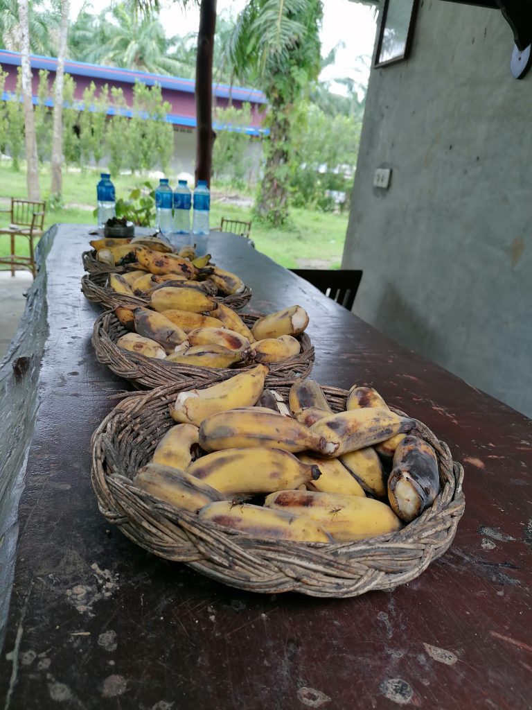 Am nächsten Morgen fühle ich mich ausgeruht, frühstücke im Hostel und warte dann darauf für meine Tour abgeholt zu werden. Werde ich dann auch bald. In den Kleinbus steigen außer mir noch zwei andere Touristen, dann geht es los. Wir verlassen den Strandort und fahren landinwärts. Ich beobachte, wie die tropische Landschaft vorbeifliegt. Etwa eine Stunde später rollt das Auto tiefer hinein in den Dschungel und hält schließlich mitten im Wald, wo nur ein paar einfache Betonhäuser mit Strohdach stehen. Meine Augen suchen die ganze Zeit die Umgebung ab, das innere Kind ist voller Vorfreude und Neugier, auf das was kommt.