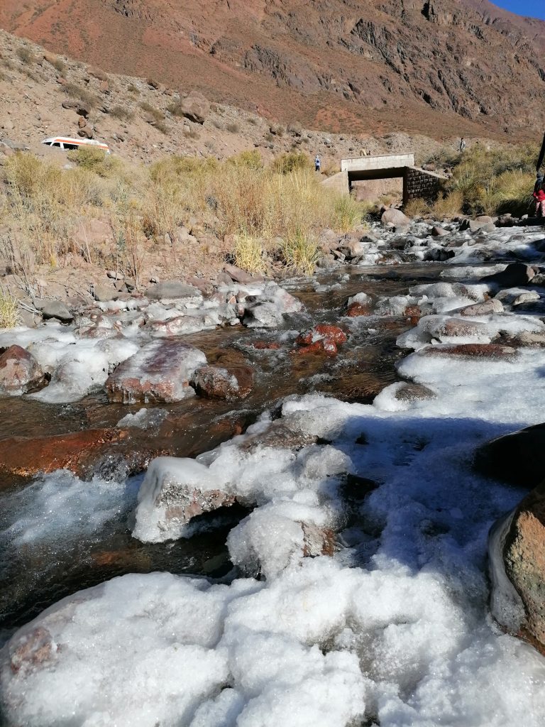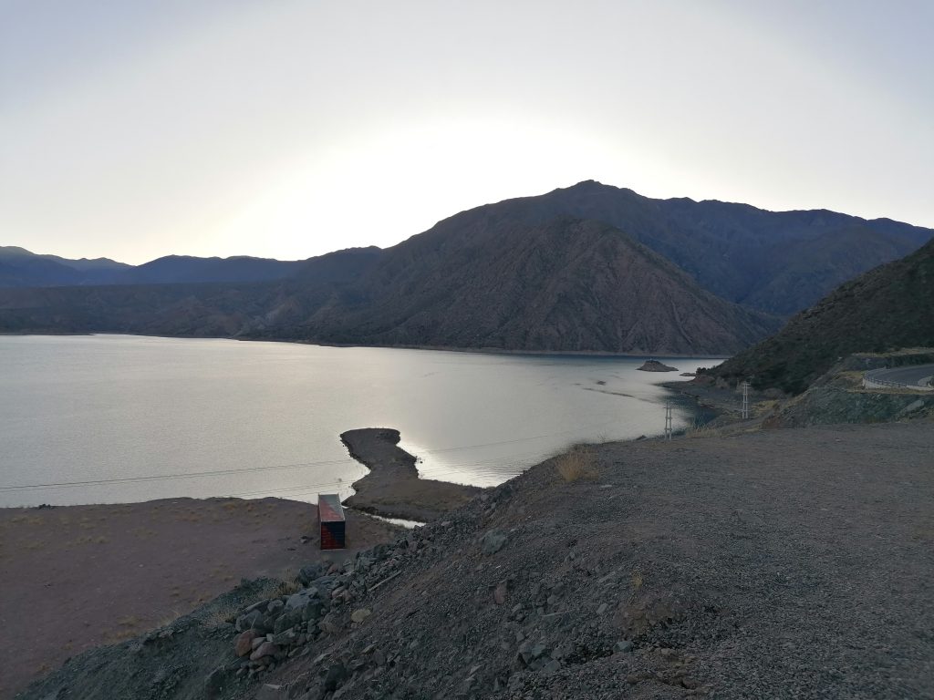 Wir fahren raus aus der Stadt und ich beobachte, wie die Sonne die schneebedeckten Berge zartrosa einfärbt. Dann schlafe ich erstmal wieder ein. Erster Stopp ist ein Schnellrestaurants, wo die Gruppe nochmal frühstücken/Tee/Kaffee trinken/sich erleichtern kann. Danach fahren wir erst in die „Pre-Anden, durch einen Tunnel, auf dessen anderer Seite wir von einer traumhaften Aussicht über einen See überrascht werden. Wir dürfen aussteigen und Fotos machen. Es ist sehr kalt… aber herrlich schön.