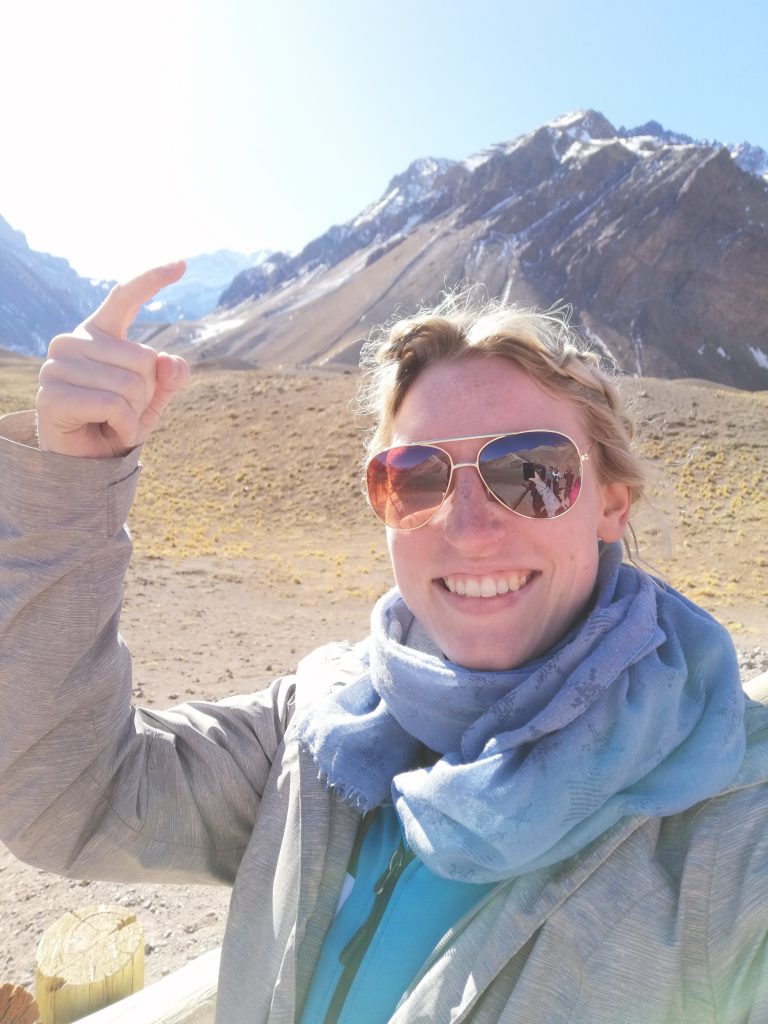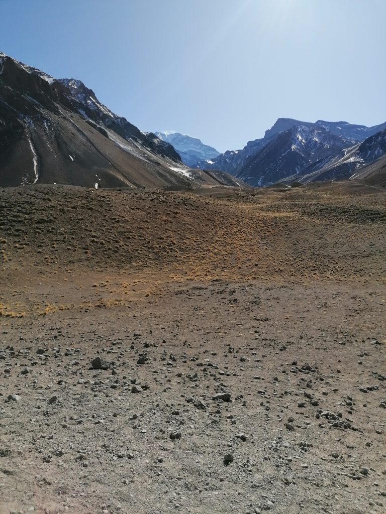 Nach dem Essen geht es endlich zum heißersehnten Ziel: Dem Aussichtspunkt auf den höchsten Berg Südamerikas. Wir steigen aus… und es wimmelt vor Touristen. Na klar! Der Weg zum Aussichtspunkt ist 400m, leichte Steigung, damit man auch ein echtes Wandererlebnis hat. Und dann sind wir da.