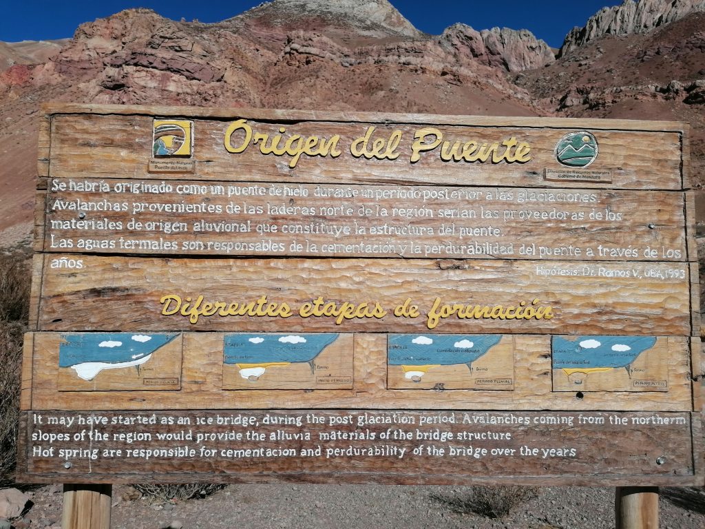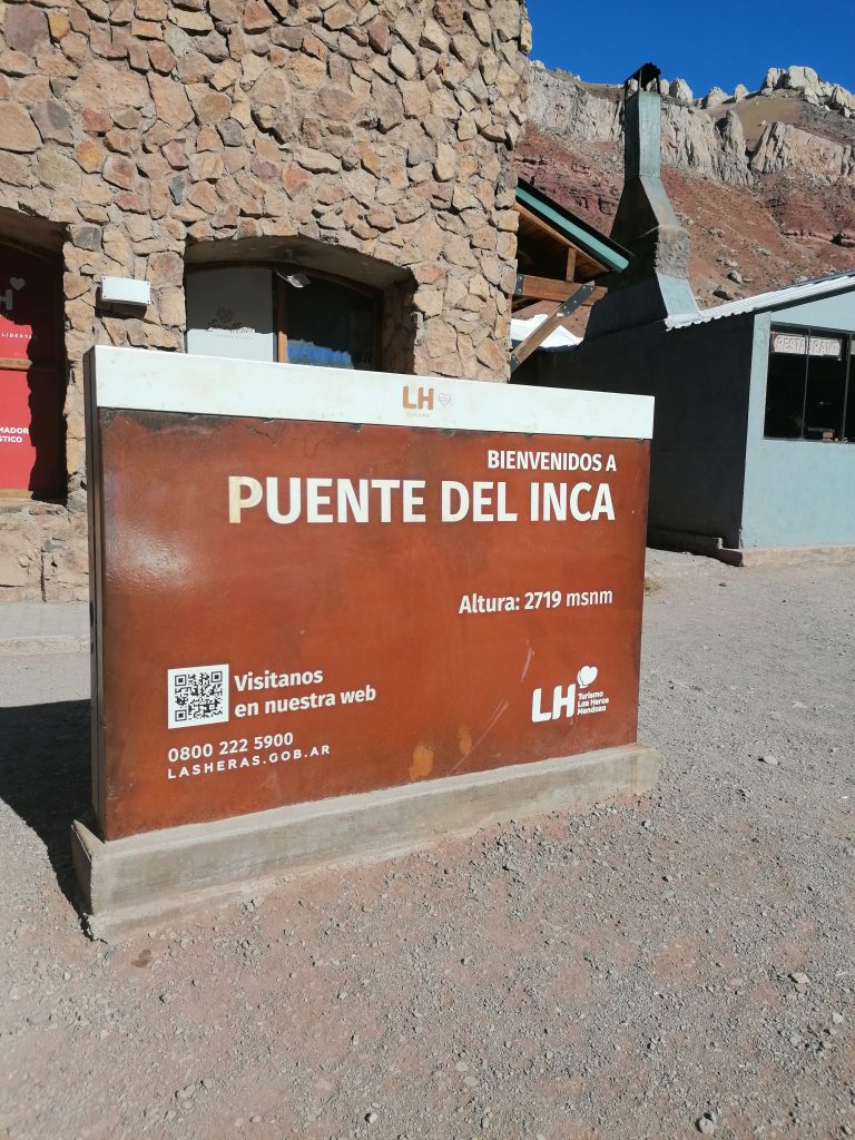 Es handelt sich hierbei um eine natürliche Brücke über dem Fluss „Cuevas“, der an dieser Stelle heiße und heilende Thermalquellen bildet. Ursprünglich soll es eine Brücke aus Eis gewesen sein aus der Zeit kurz nach den Gletschern. Später haben Lawinen die verschiedenen erdeigenen Materialien zusammengetragen und die Hitze im Frühling hat sie für ewig stabilisiert. Im frühen 20. Jahrhundert wurde ein Kurhotel über die heißen Quellen gebaut, jedes Zimmer hatte ein eigenes Thermalbad. Das Hotel wurde später von einer Lawine zerstört, die Überreste sind noch erkennbar. „Inka-Brücke“ heißt es, weil die Inkas die ersten waren, die die Thermalbäder dort für sich genutzt haben. Die Brücke besteht aus verschiedenen Sedimenten und diversen Salzen. Die Brücke war einst Teil des andinen Straßensystems, was viel von ihrer natürlichen Form zerstört hat, weshalb man sie heute nur noch anschaut und nicht mehr überquert.