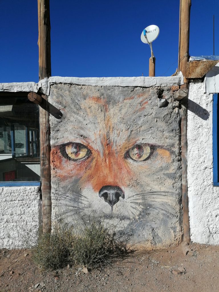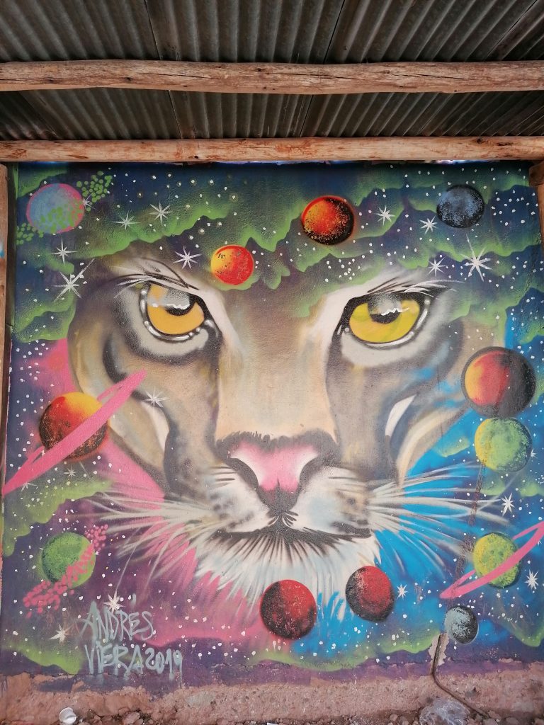 Wir halten an einer kleinen Häusersammlung, die hauptsächlich Handwerkskunst verkaufen. Bei der Hinfahrt fällt mir ein tolles Bild an der Wand auf, dass ich später suche und abfotografiere: