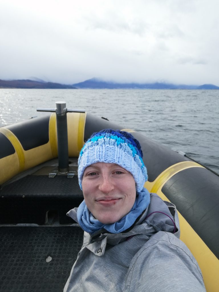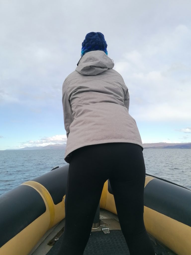 Vorne in der Spitze des Bootes gibt es eine metallene Vorrichtung, sodass man hochsteigen und aufstehen kann… ein bisschen als würde man Wasserski fahren. Nach und nach probieren wir es aus… fühlt sich super an, aber nach ein paar Minuten rinnen einem die Tränen übers Gesicht vor lauter Windstärke und Kälte.