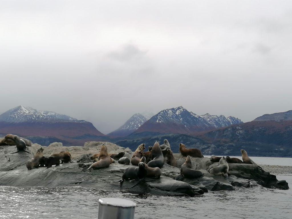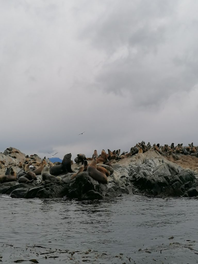 Nächste Station ist eine kleine Insel auf der sich Seelöwen tummeln… was, schon wieder Seelöwen?? Ja, aber so nahe war ich noch nie dran. Auf den Aussichtspunkten der Loberías ist man normalerweise hunderte Meter weit weg, diesmal könnte ich sie fast berühren, wenn ich mich aus dem Boot lehne (was ich nicht tue, ich will nicht mit ihnen schwimmen). Das ist nochmal eine richtig tolle neue Erfahrung mit den Tieren, sie ganz aus der Nähe zu sehen, wie sie im Wasser spielen und neugierig hin und her schwimmen, wie sie sich in der Sonne auf den Felsen räkeln oder sich gegenseitig ankeifen. Und ja, es stinkt mal wieder gewaltig!!! Es ist der Geruch am Ende der Welt 😉