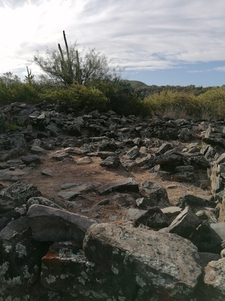 Einem der Gebäudereste fehlt eine Tür. Der Guide weist auf eine Stelle in der Mauer, wo zu erkennen ist, dass es die Tür schon gab, aber dass sie zugemauert wurde… Das Volk hat seinen Ort also aus irgendeinem Grund verlassen, aber mit der Intention zurückzukommen… was nie geschah.