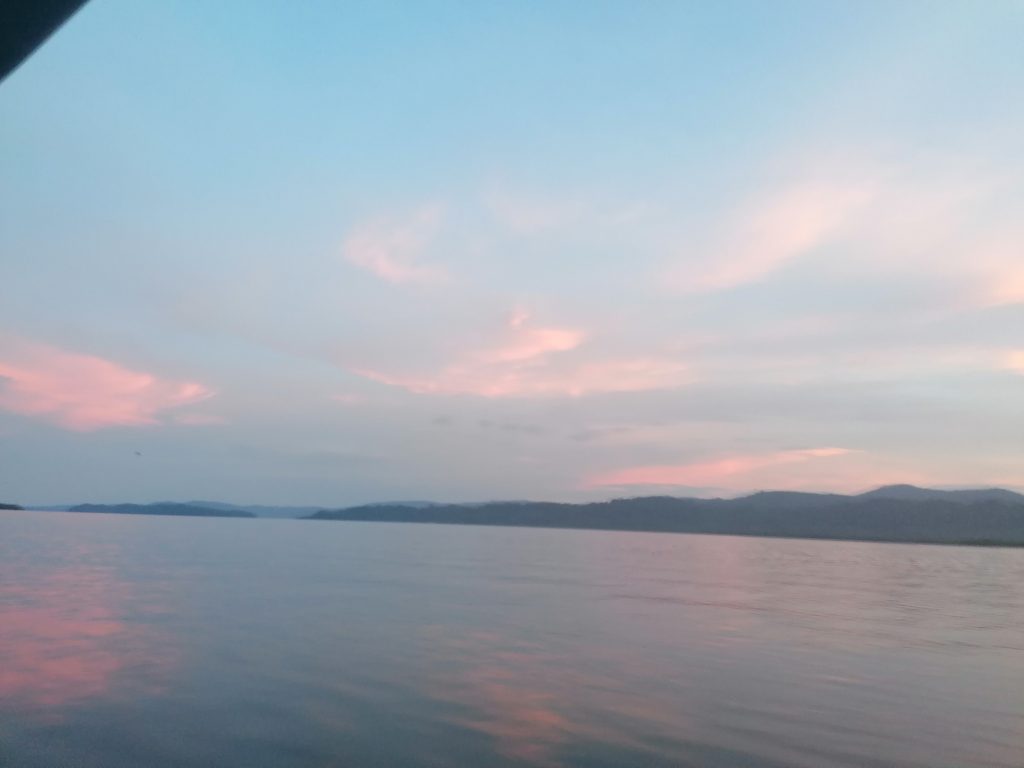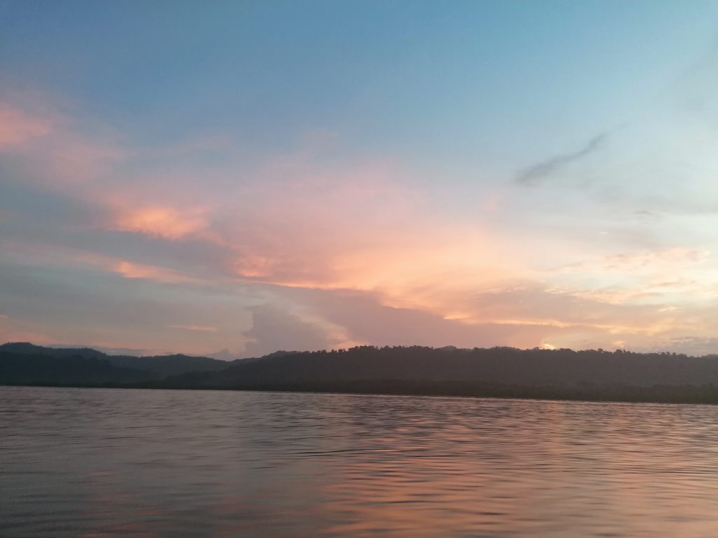 Dann fährt mich der Bus zurück durch die schöne Landschaft, ich steige in Soña wieder nach Santiago um, fahre von dort nach David und von dort nach Bocas del Toro, DEM Karibikort von Panama. Von Almirante aus bringt uns eine Fähre, die wir (die beiden Backpacker, die ich im Bus kennengelernt habe) gerade noch erwischen auf die Inselgruppe, genauer gesagt auf die Hauptinsel Colón. Dabei können wir einen tollen Sonnenuntergang beobachten.