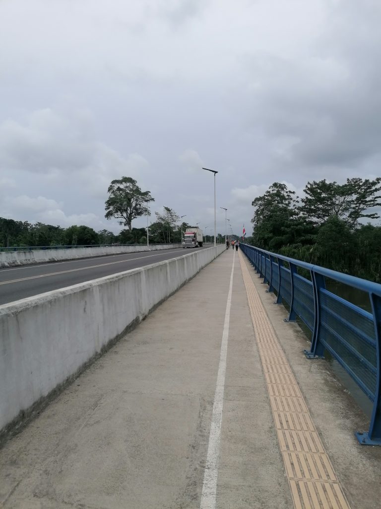 Der Rückweg wird brutal. Es ist zehn Uhr vormittags, aber die Hitze ist unerträglich. Das letzte Stück spaziere ich langsam zurück, aus Sorge vor einem Hitzeschlag. Vor dem Checkout genieße ich noch eine lange, verdiente Dusche und bin froh, doch noch etwas gemacht zu haben, was mein Budget erlaubt. Ich bleibe noch ein bisschen im Hostel, unterhalte mich noch ein bisschen mit den Barkeepern und trete gegen Nachmittag die Rückreise aufs Festland an. Die Bootsfahrt ist entspannt, trotz Regen. Am Ufer will ich mit dem öffentlichen Bus zur Grenze, lasse mich dann aber doch noch von einem Shuttlefahrer überreden, diesen Weg zu wählen, wenn auch teurer. Im Nachhinein wäre der Bus sicher kein Problem gewesen, ich war einfach zu bequem. Das Shuttle bringt mich direkt vor die Grenze, dort muss ich zahlen, um von Panama ausreisen zu können… Wahrheit oder Fake, jedenfalls bin ich wieder vier Dollar leichter. Ich bekomme den Ausreisestempel von Panama und muss dann über die Brücke einen Fluss überqueren, der die Landesgrenze markiert.