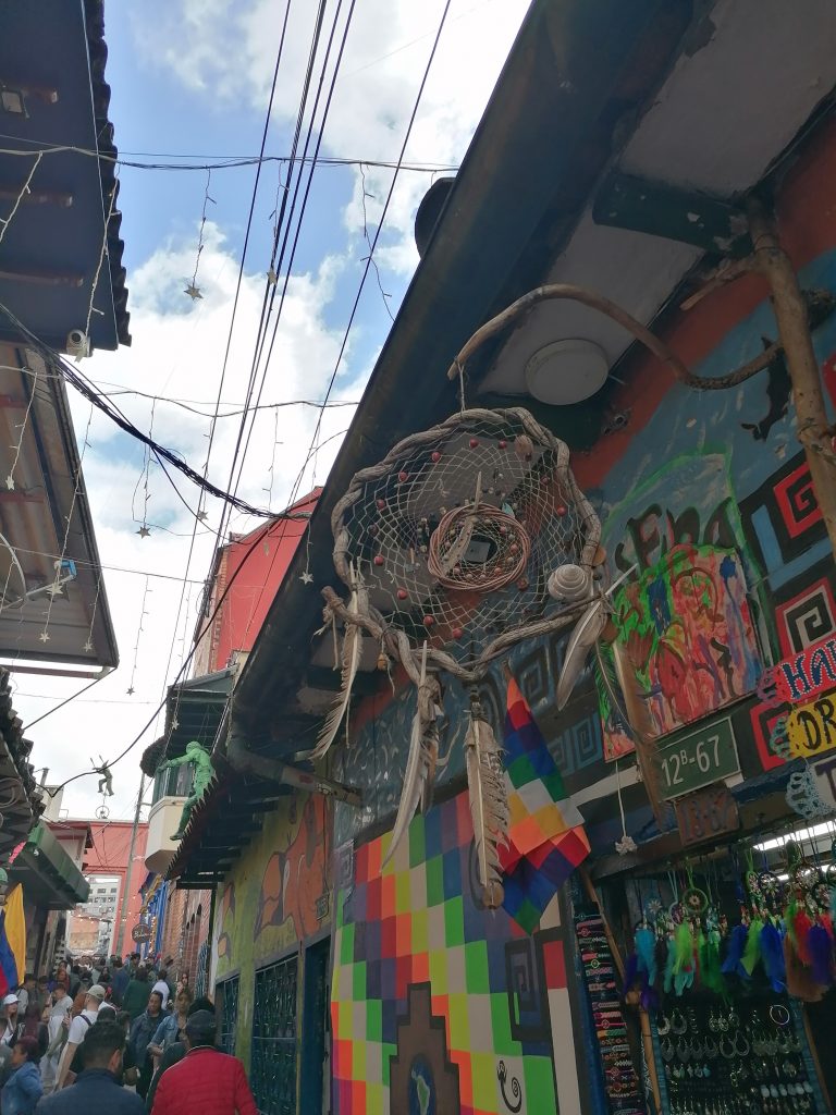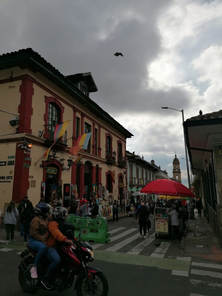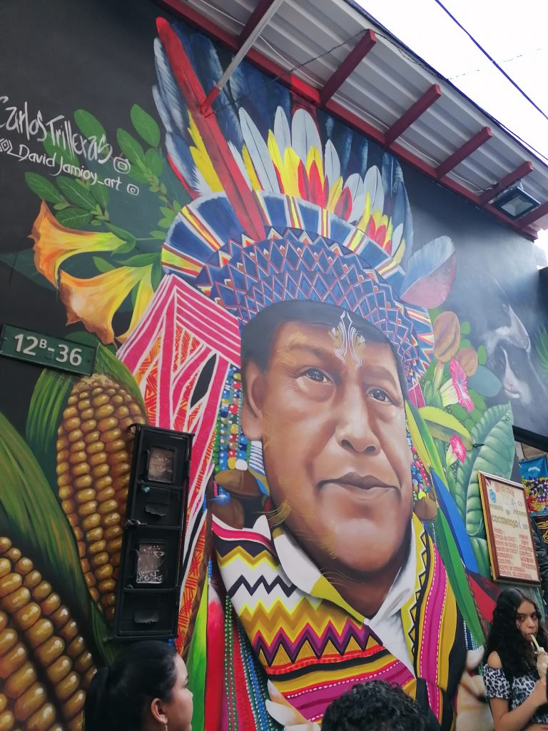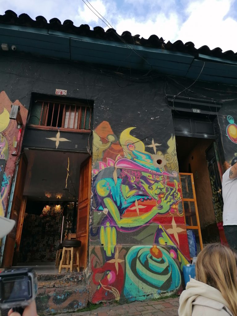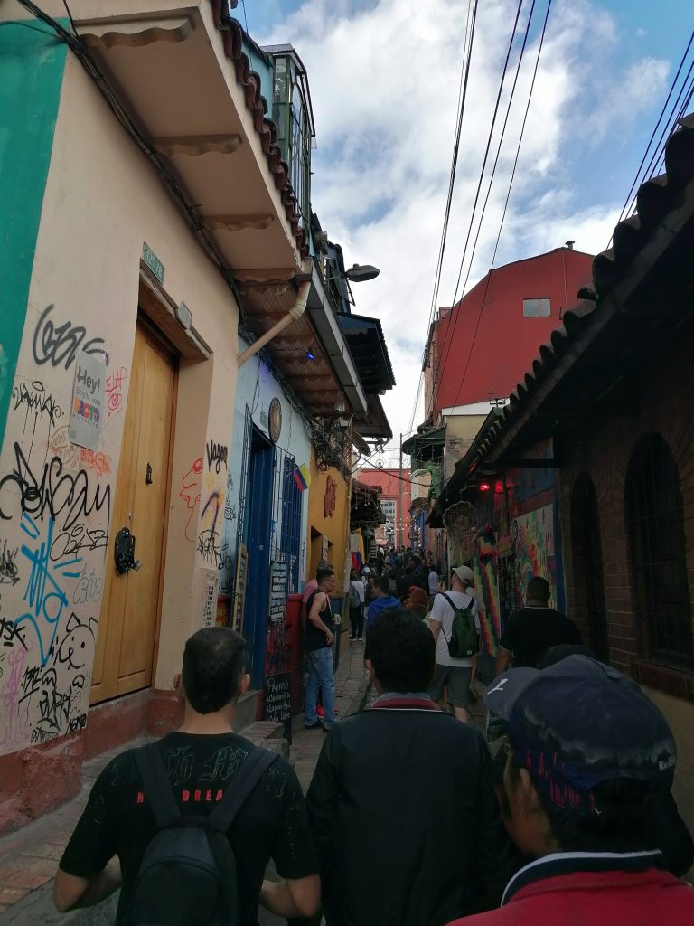 Wir laufen zum großen Markt, dort haben wir Zeit uns umzuschauen, uns einen Saft zu kaufen oder ähnliches. Ich hole mir kolumbianische Schokolade, jetzt kenne ich mich ja ein bisschen aus. Danach gehen wir in den Stadtteil „El Candelaria“, der einzige Stadtteil, wo man noch den kolonialen Stil findet, der die Unruhen 1948 überlebt hat. Außerdem ist das Bar- und Künstlerviertel der Stadt. Hier findet man einheimische Getränke, Zirkus, Stand-up-Comedy, Handwerkskunst, Musiker, Kulinarik und natürlich wieder ganz viel tolles Graffiti. Wir laufen die schmale, aber dicht bevölkerte Straße nach oben, die im 16. Jahrhundert gebaut wurde.