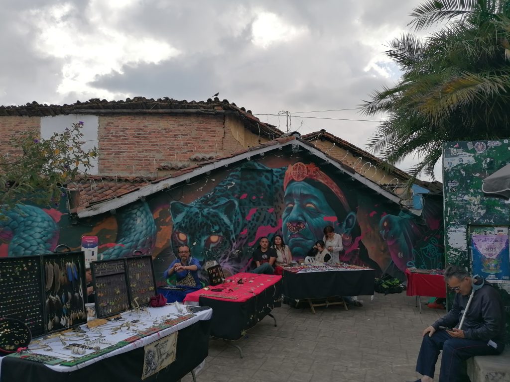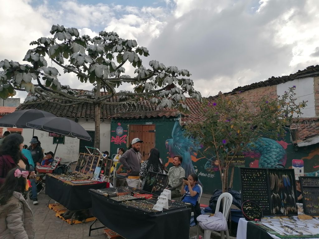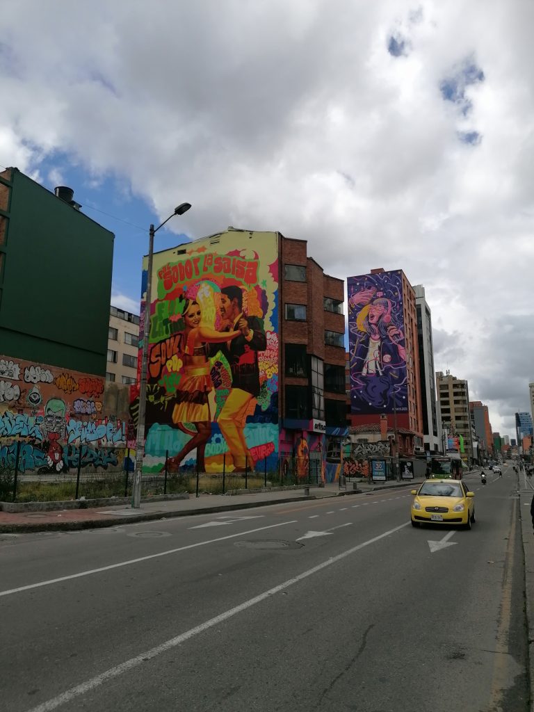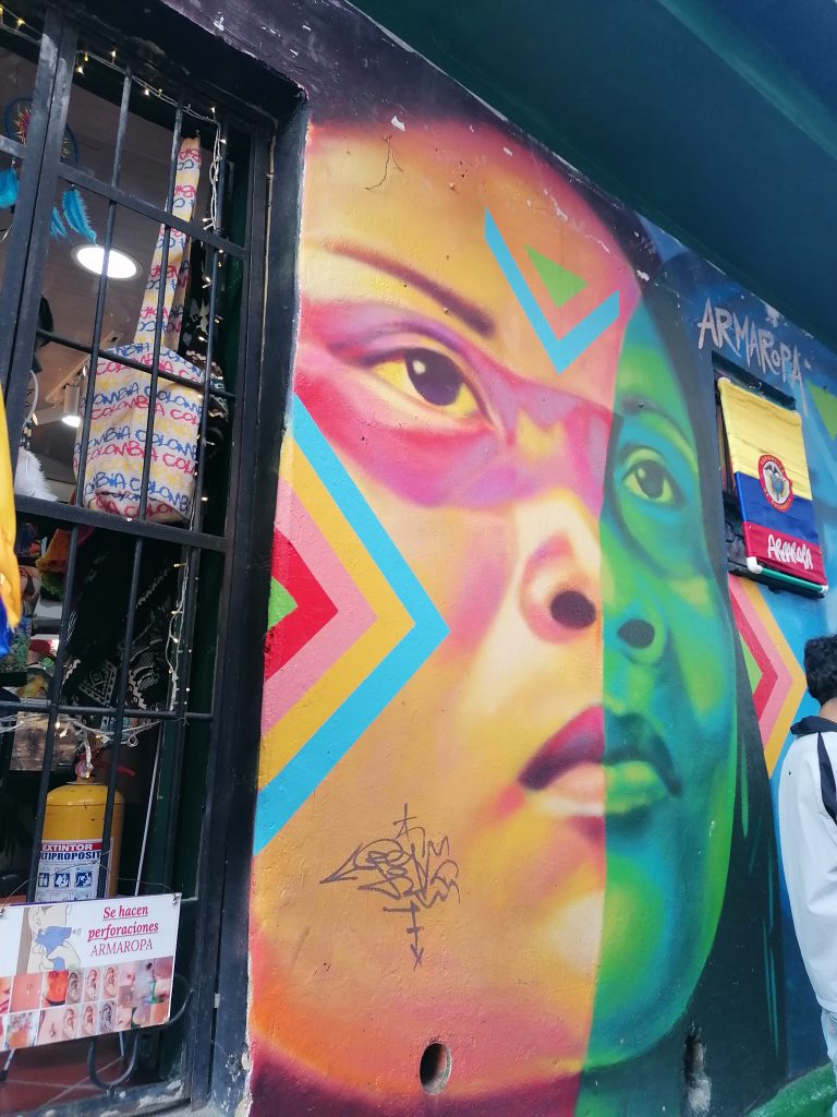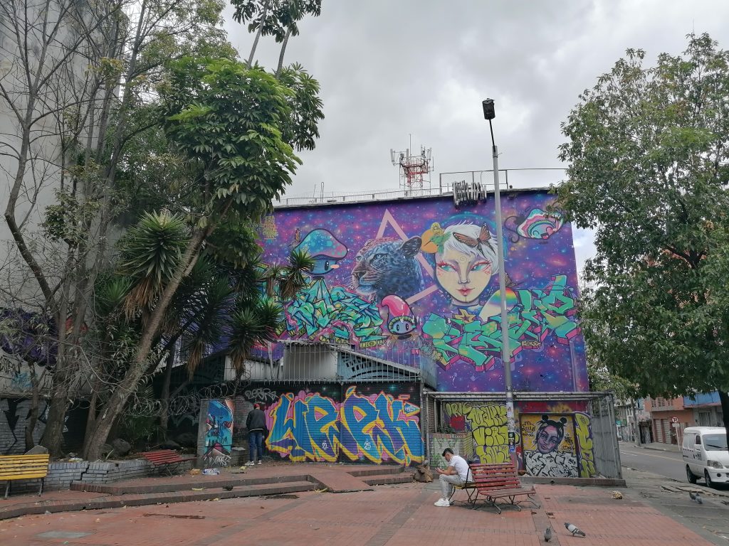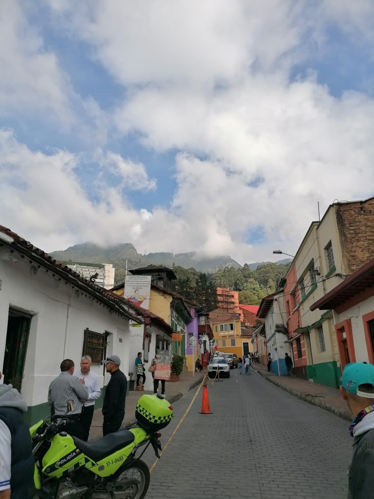 Wir laufen zum großen Markt, dort haben wir Zeit uns umzuschauen, uns einen Saft zu kaufen oder ähnliches. Ich hole mir kolumbianische Schokolade, jetzt kenne ich mich ja ein bisschen aus. Danach gehen wir in den Stadtteil „El Candelaria“, der einzige Stadtteil, wo man noch den kolonialen Stil findet, der die Unruhen 1948 überlebt hat. Außerdem ist das Bar- und Künstlerviertel der Stadt. Hier findet man einheimische Getränke, Zirkus, Stand-up-Comedy, Handwerkskunst, Musiker, Kulinarik und natürlich wieder ganz viel tolles Graffiti. Wir laufen die schmale, aber dicht bevölkerte Straße nach oben, die im 16. Jahrhundert gebaut wurde.