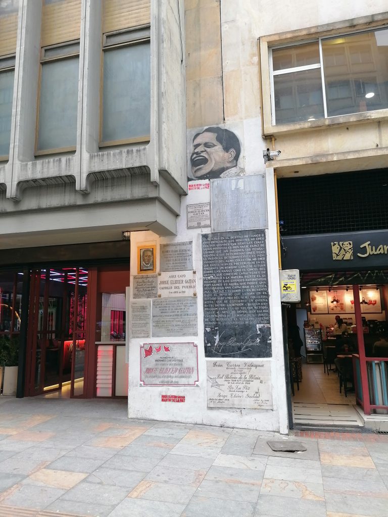 Wir gehen weiter in die Innenstadt an eine belebte Kreuzung. Dort erzählt uns der Guide etwas von der kürzlichen Geschichte. Im Jahr 1948 wurde zum ersten Mal ein sozial-liberaler Präsidentschaftskandidat gewählt: Jorge Eliécer Gaitán. Sein Wahlspruch war: Vom Volk – für’s Volk (mehr oder weniger). Kurz vor der Wahl wurde der Mann hier an dieser Kreuzung am hellichten Tag erschossen… und die Stadt versinkt im Chaos. Die Menschen gehen auf die Straße, es kommt zu Gewaltausbrüchen, Vandalismus und großen Unruhen überall in der Stadt. Unser Guide zeigt auf die umliegenden Gebäude… alle relativ neu, oder? Das liegt daran, dass in diesen vier Tagen der Unruhen die halbe Innenstadt niedergebrannt wurde. Das war der Ursprung für die Guerrilla-bewegung, die bis heute in Kolumbien aktiv sind.