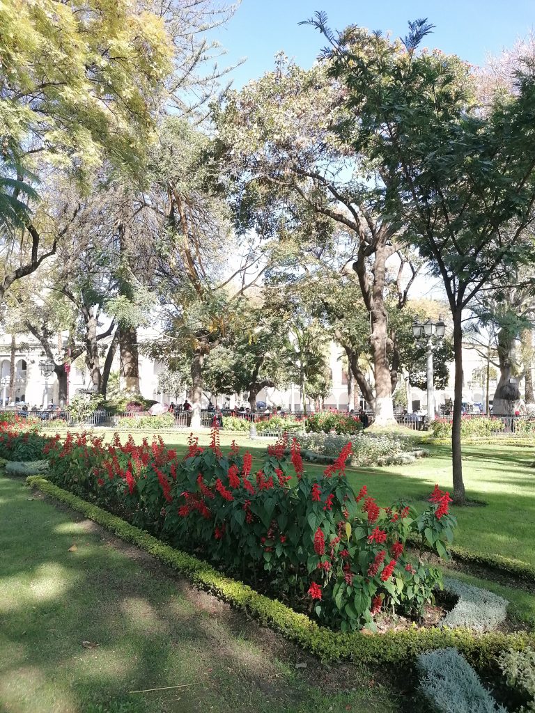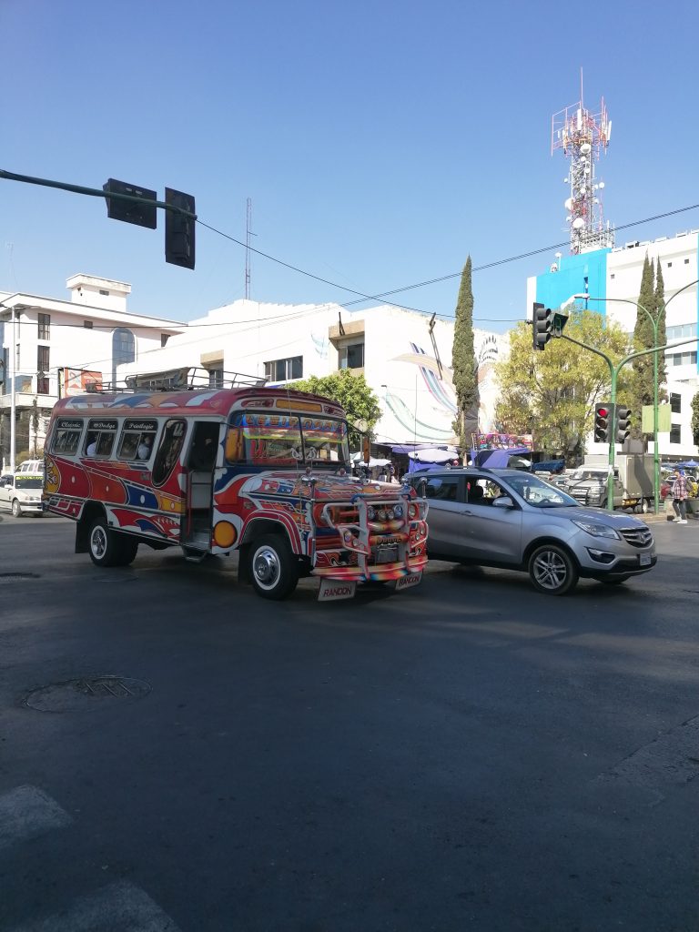 Dann wird es Zeit, unser Tageshauptziel in Angriff zu nehmen. DIE Attraktion Cochabambas ist …. Trommelwirbel… eine Christusstatue auf einem Berg! Der Cristo de la Concordia steht hoch über der Stadt und man kann mit einer Seilbahn hochfahren. Das klingt nach einem guten Ziel für den Sonnenuntergang. Da es in Sucre so gut geklappt hat, versuchen wir auch hier wieder mit dem Stadtbus hinzufahren. Wir fragen, welche Linie uns zur Seilbahn bringt. Als wir die Linie anhalten hat der Typ keine Ahnung wovon wir reden. Ich versuche es ihm etwas genauer zu erklären, sodass er schließlich nicht, aber ich habe das Gefühl, er hat mir kaum zugehört. Ich verfolge unsere Strecke auf Google Maps und zuerst sieht es auch ganz gut aus, aber dann biegen wir ab und wir entfernen uns von unserem Ziel. Ich sehe schon ein Desaster wie damals in Catamarca kommen, deshalb beschließen wir auszusteigen. Wir sprechen noch einen anderen Bus an, der laut Internet auch dort hinfahren würde, doch wieder hat der Busfahrer keine Ahnung und wirkt wie benebelt. Ale zieht mich weg, der hat keine Ahnung wovon du redest, lass uns laufen. Ich stimme zu und bin mal wieder fassungslos. Es ist die Hauptattraktion der Stadt und keiner hat eine Ahnung wovon ich rede? Die wirken auch alle irgendwie besoffen oder bekifft, da ist es besser, man macht alles zu Fuß. Also laufen wir. Die Sonne sinkt tiefer und tiefer, aber wir kommen noch rechtzeitig an der Seilbahn an… man kann nur keine Tickets mehr kaufen. Alles weg. Und an der Seilbahn wartet schon eine riesige Menschenmenge. Keine Chance, wir kommen da nicht mehr hoch. Wir denken kurz drüber nach, zu Fuß zu gehen, entscheiden uns dann aber dagegen. Die Sonne ist schon fast weg. Die Aktion war auch ein Fail… Wow. Das finden wir jetzt beide ziemlich doof. Wir spazieren ein bisschen betrübt zurück, aber ein Kolibri in einem Hibiskusbaum hebt die Laune gleich wieder.