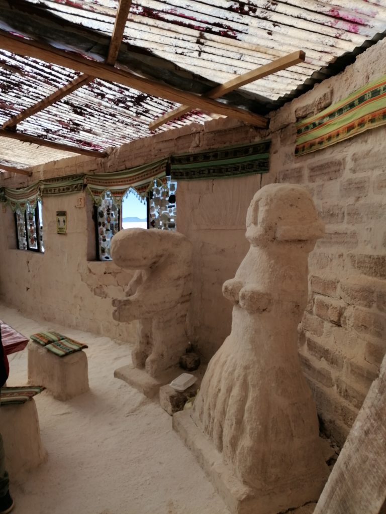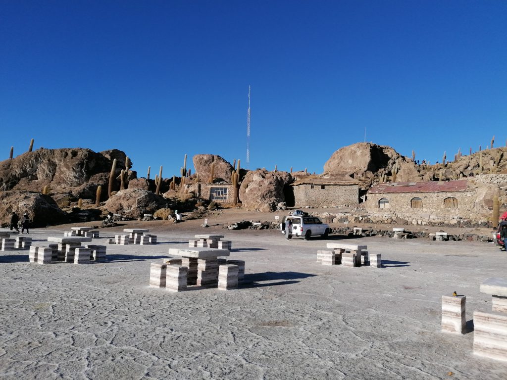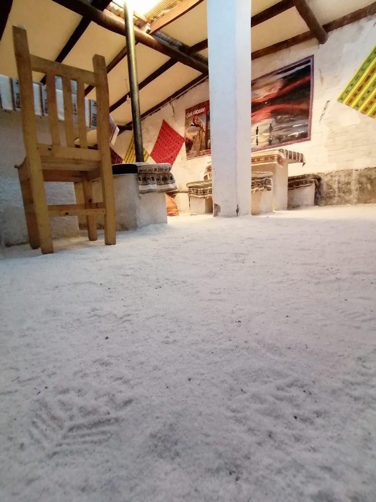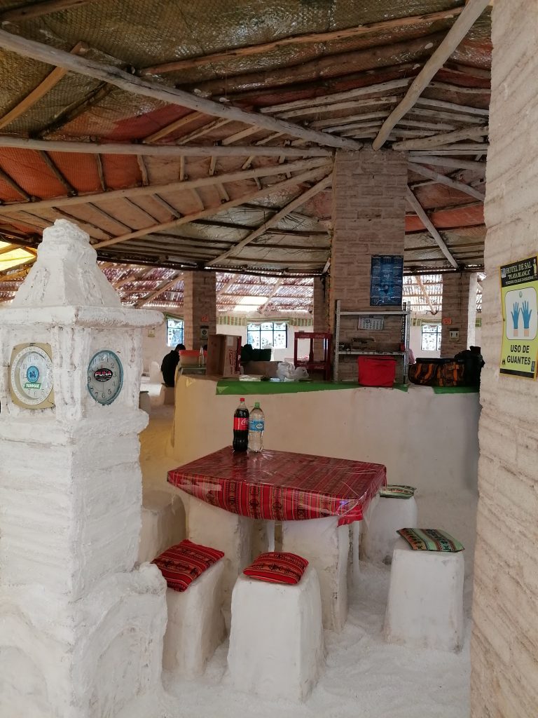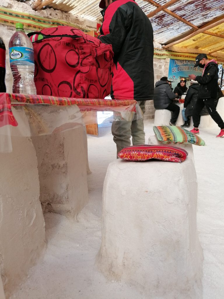 Wir fahren weiter, jagen über die weiße Ebene, zusammen mit vielen anderen Jeeps. Die Landschaft ist surreal, man kann es nicht wirklich vergleichen. Nächster Halt ist dann unser Mittagessen. Dafür fahren wir in DAS Salzhotel. Es gibt mehrere, aber das ist DAS eine. Der Name ist Programm, alles ist aus Salz, Tische, Stühle, Wände, die Bar, der Boden ist Salz, wie Schnee. Nur das Klo ist normal, schätze, das geht mit Salz nicht.