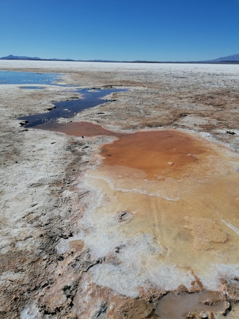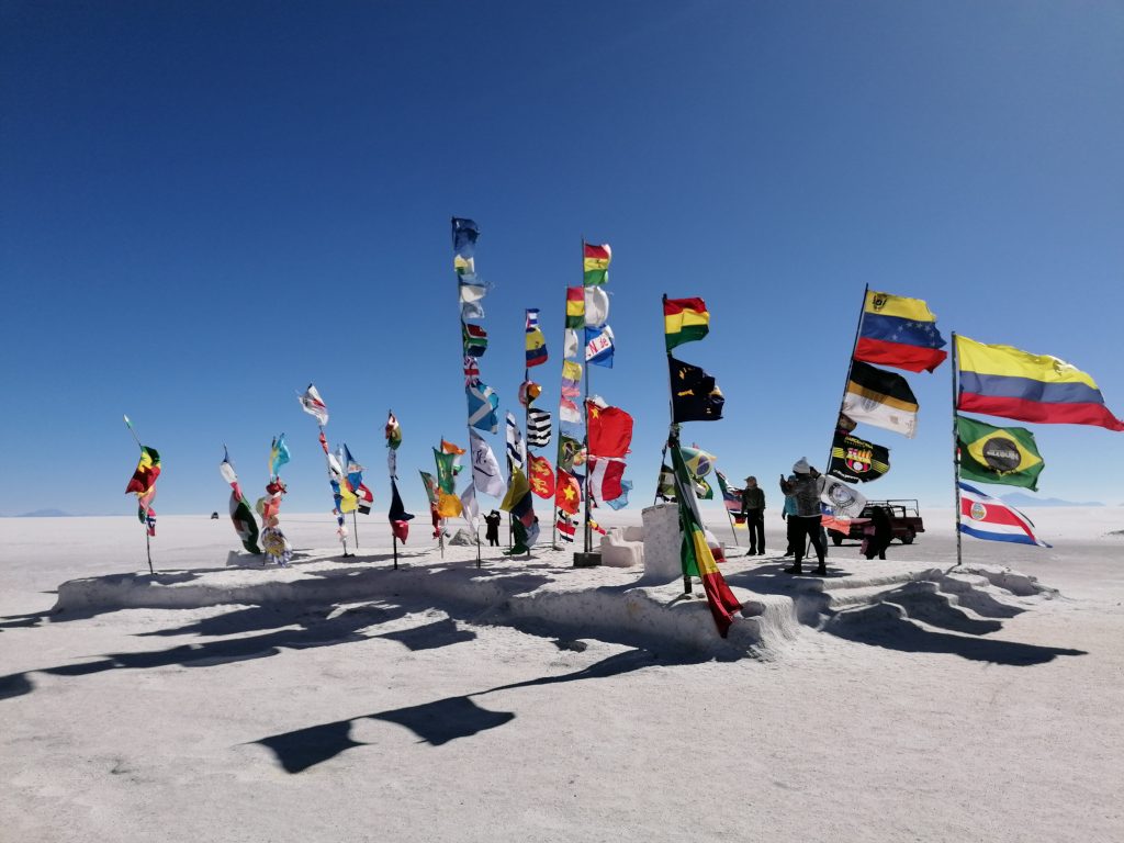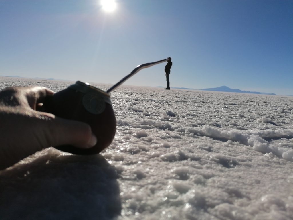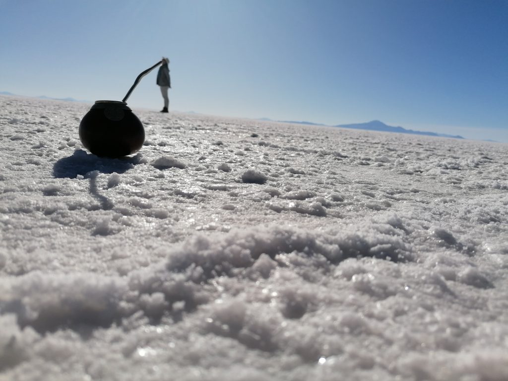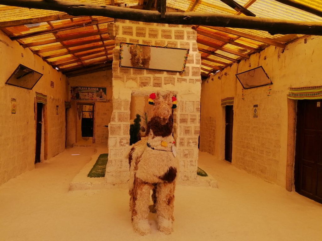 Wir fahren weiter, jagen über die weiße Ebene, zusammen mit vielen anderen Jeeps. Die Landschaft ist surreal, man kann es nicht wirklich vergleichen. Nächster Halt ist dann unser Mittagessen. Dafür fahren wir in DAS Salzhotel. Es gibt mehrere, aber das ist DAS eine. Der Name ist Programm, alles ist aus Salz, Tische, Stühle, Wände, die Bar, der Boden ist Salz, wie Schnee. Nur das Klo ist normal, schätze, das geht mit Salz nicht.