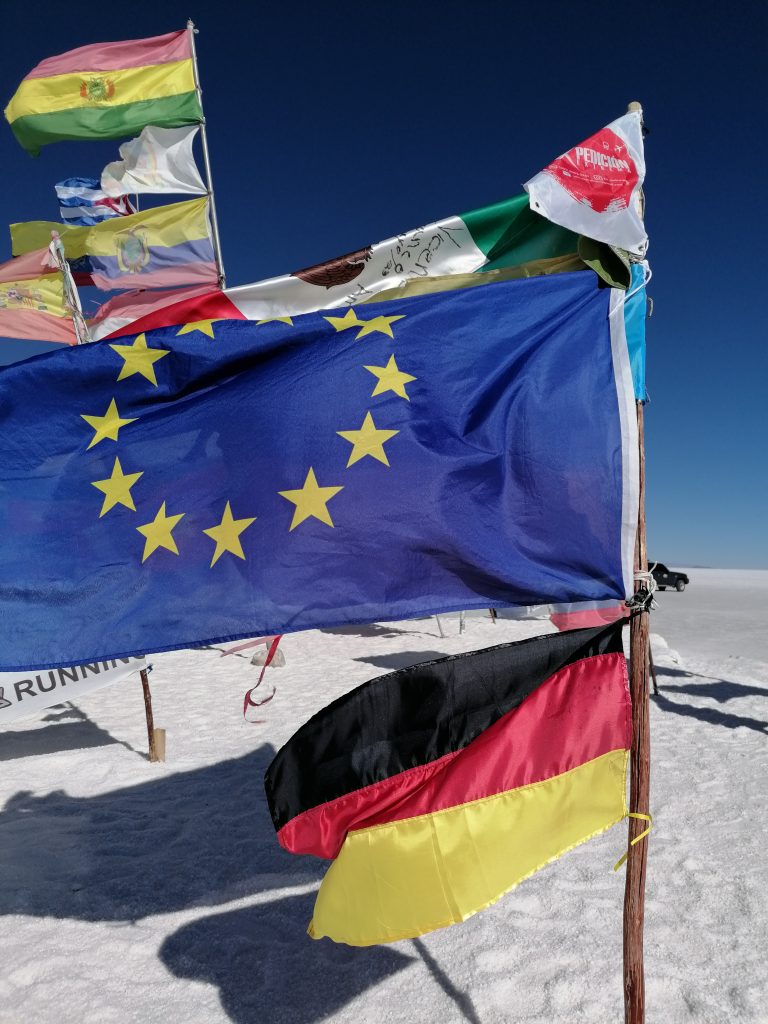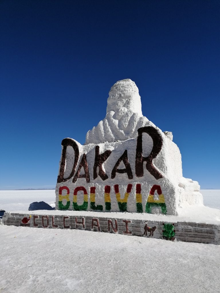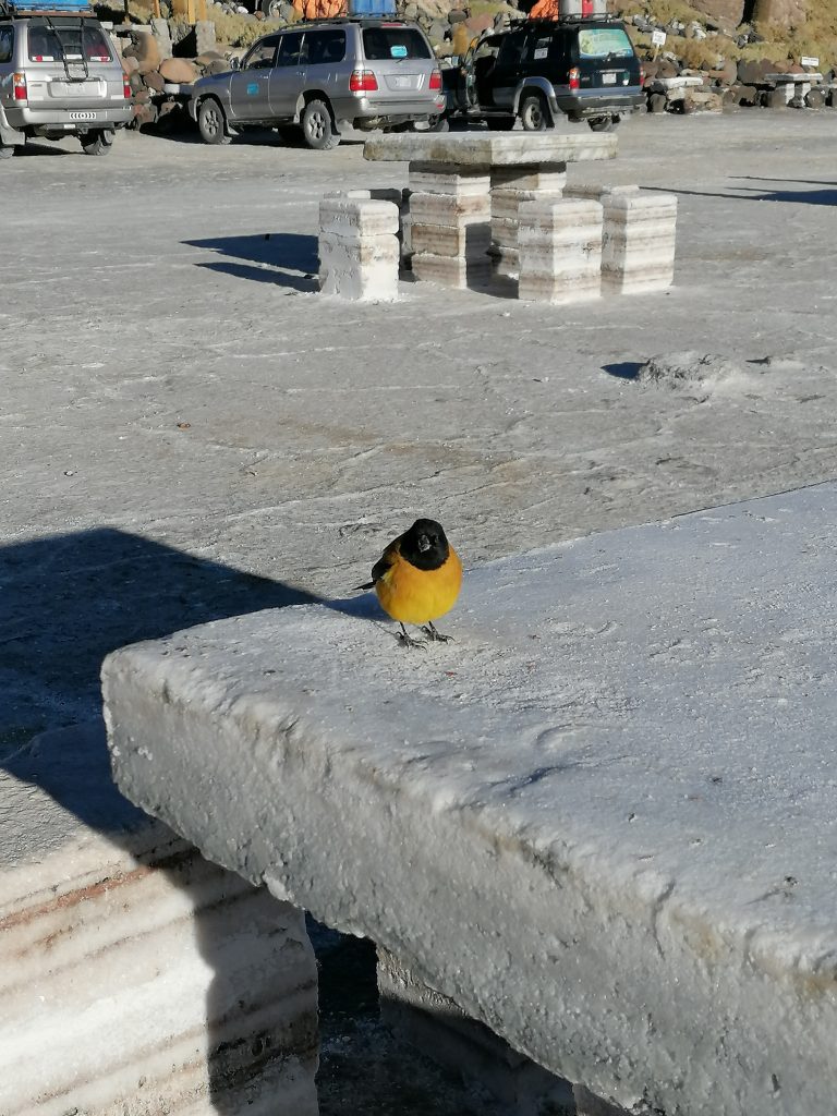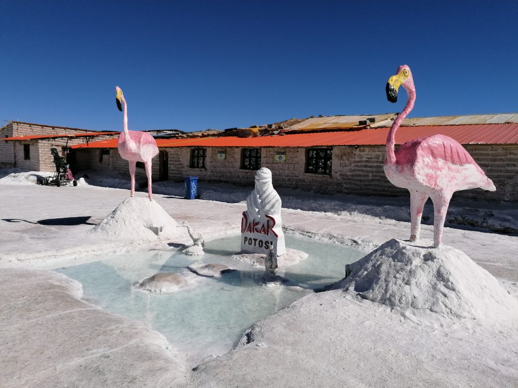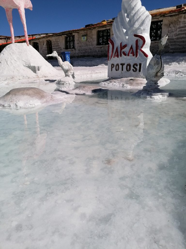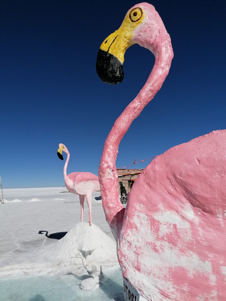 Das Essen hat der Fahrer heute früh eingesteckt, trotz Wärmeboxen ist es eher lauwarm und dann schnell kalt. Aber nicht schlecht, es gibt Reis, gekochtes Gemüse, Fleisch, Tomaten und Gurken. Man wird auf jeden Fall satt. Draußen gibt es Salzflamingos und eine riesige Salzskulptur, die man oft auf den Fotos findet. Jetzt auch auf meinen: