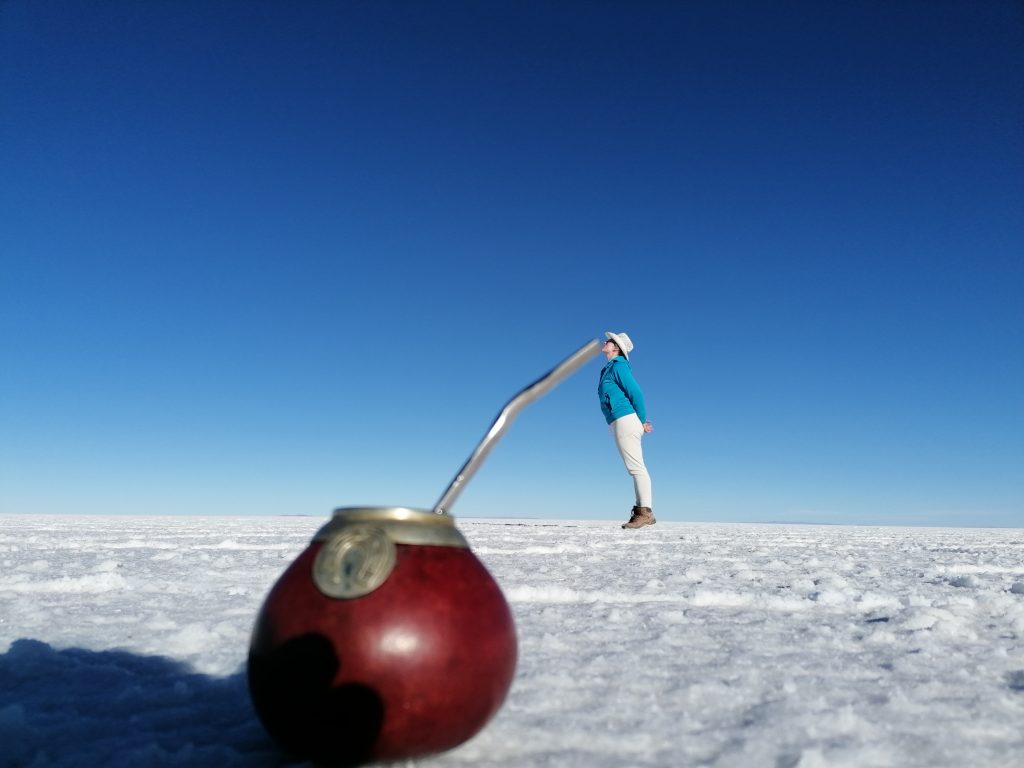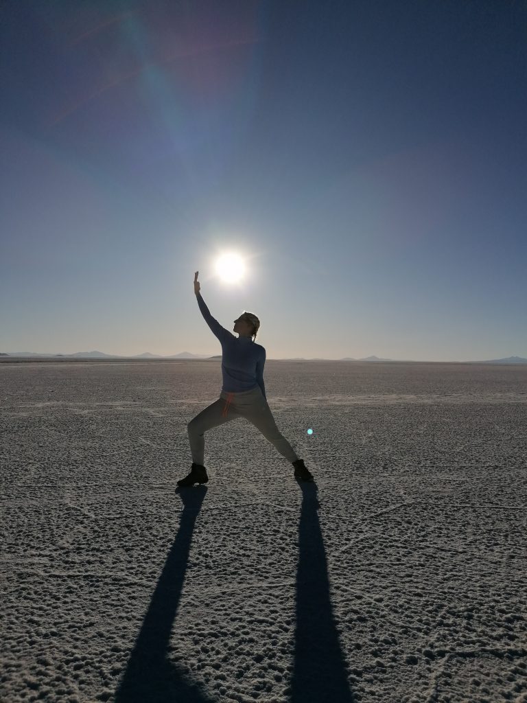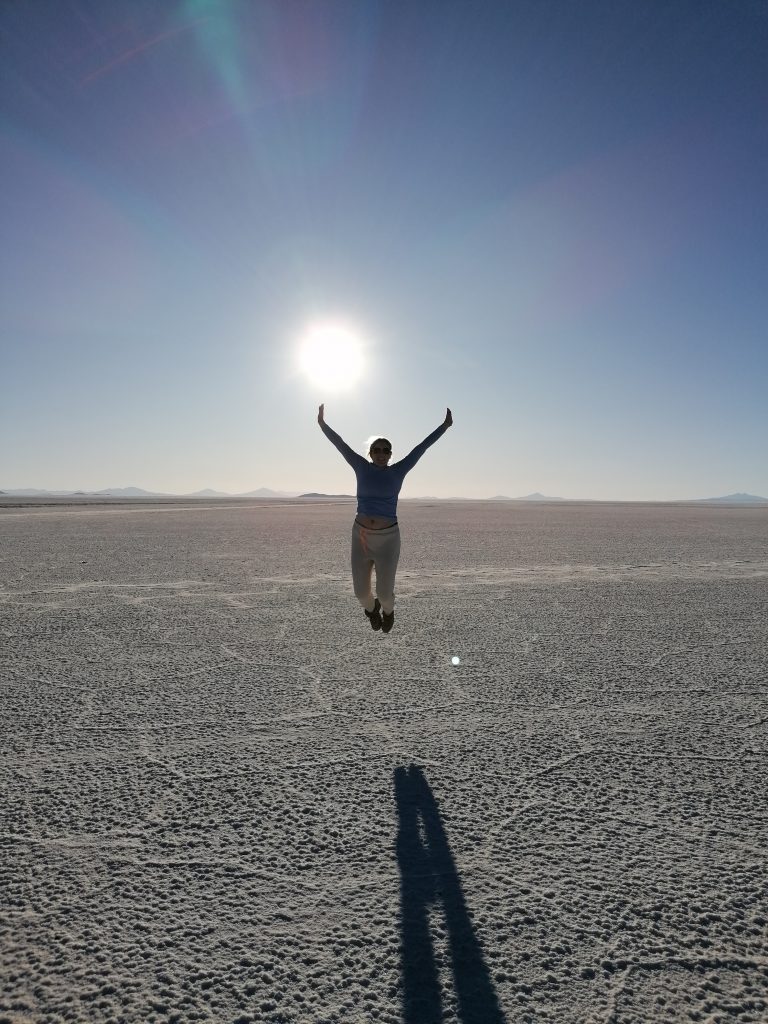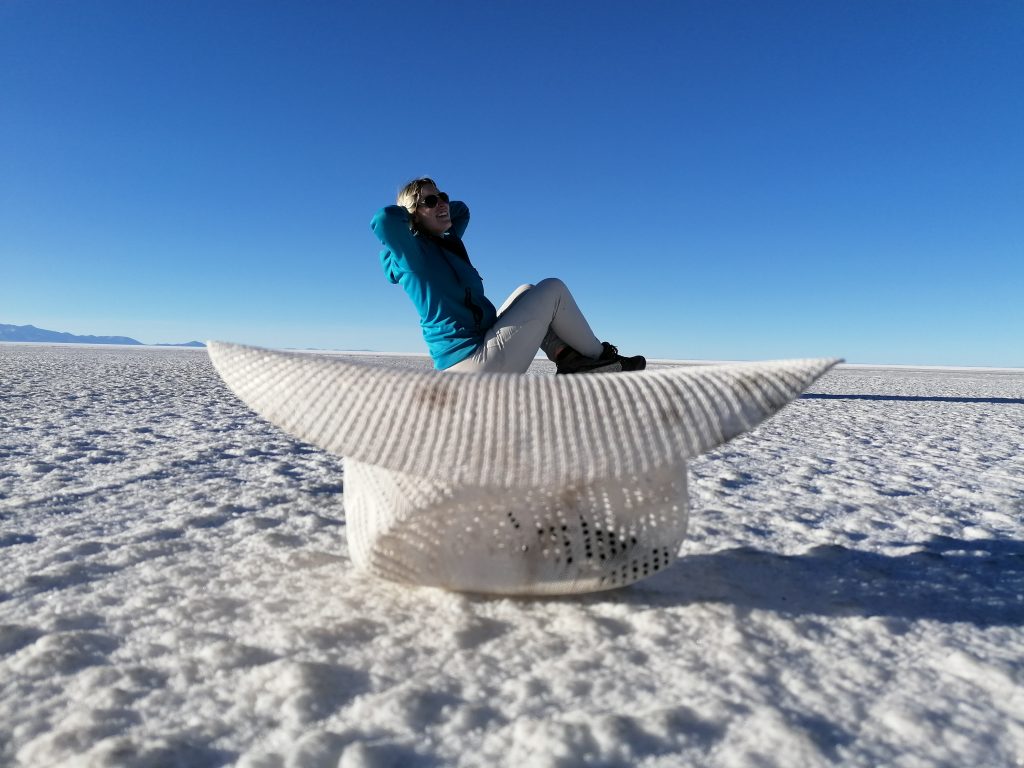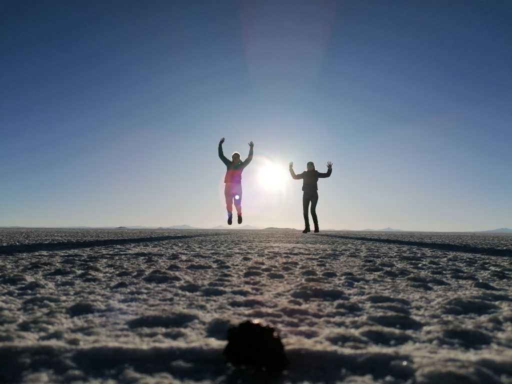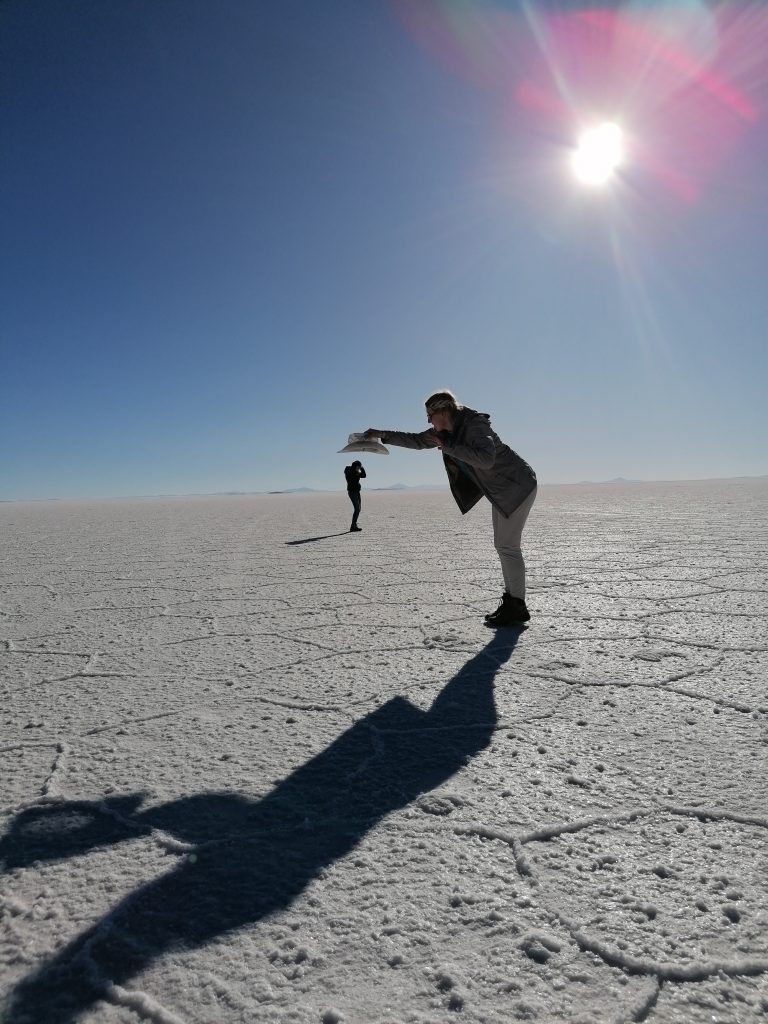 Dann fahren wir weiter raus in die Wüste, halten an, entfernt von anderen Jeeps, es wird Zeit für das, was alle hier wollen: lustige Salzwüsten Fotos.