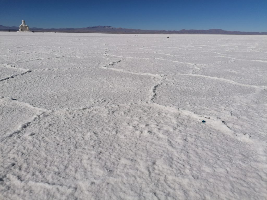Wir fahren durch den Eingang und schon bald wird die Landschaft weiß. Und auf dem Boden sieht man die typischen Sechs- oder Mehrecke, über die der Jeep hinwegschwebt. Ich frage Nelson, unseren Guide, wieso das so ist. Er antwortet, die Pools bilden sich wegen des Regens. Das sind nichts anderes als aneinandergereihte Pfützen. Rätsel gelöst. In der Regensaison (Januar bis März) verwandelt sich die Salzwüste in eine einzige Spiegelwelt. Das muss auch sehr schön sein.