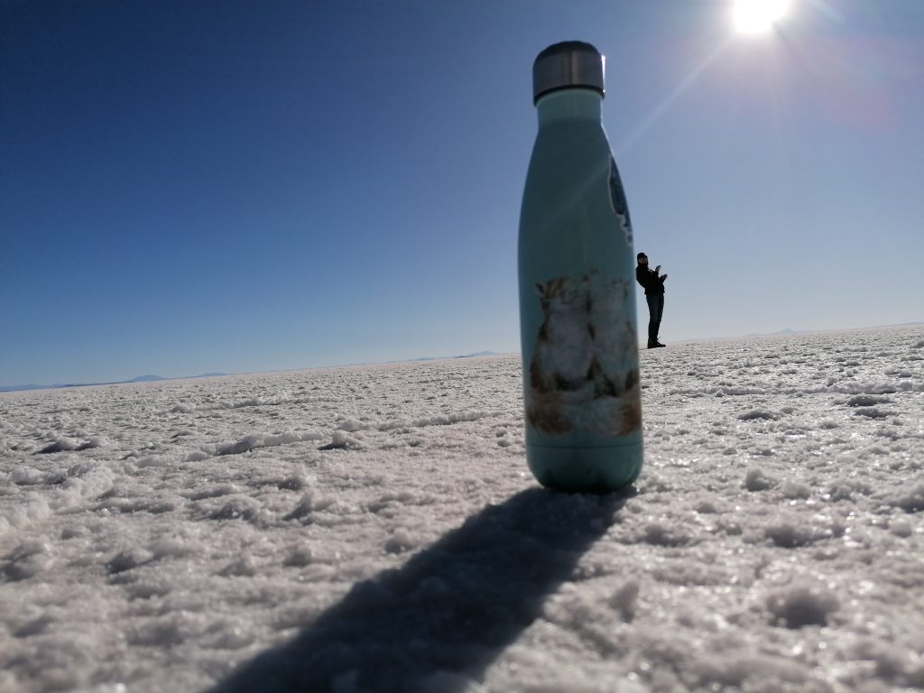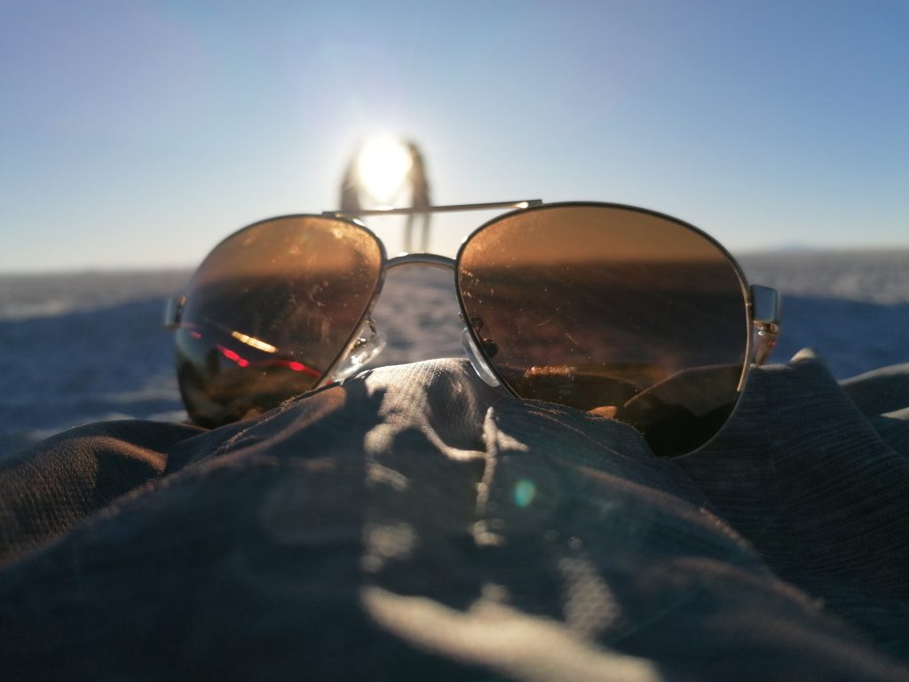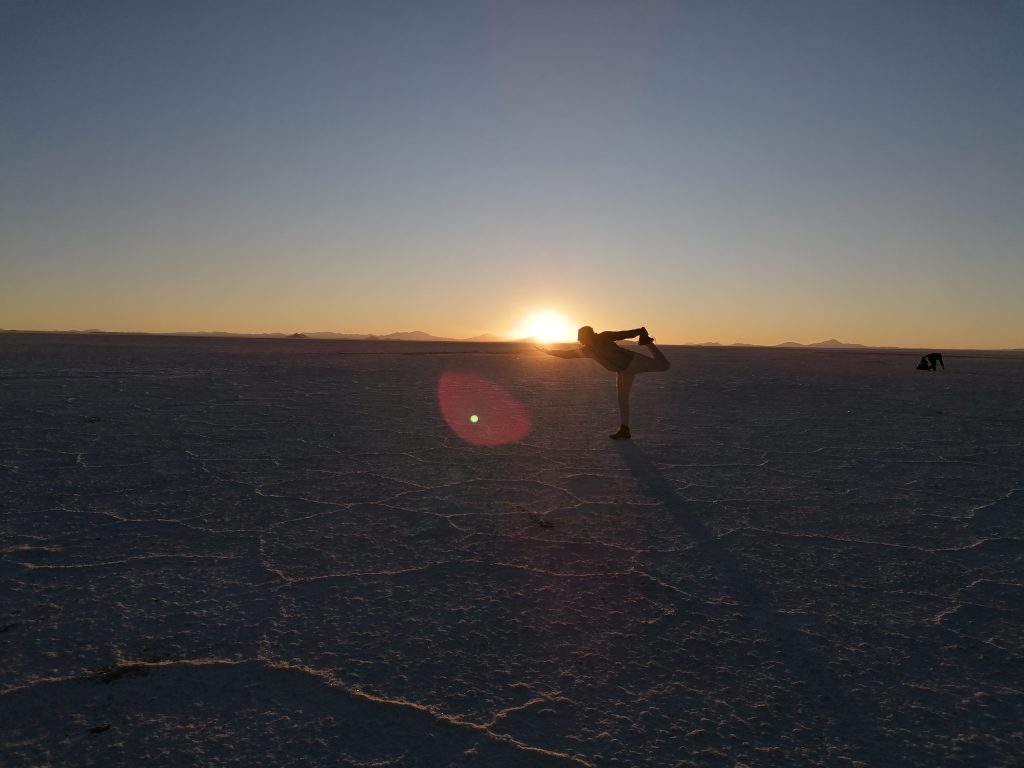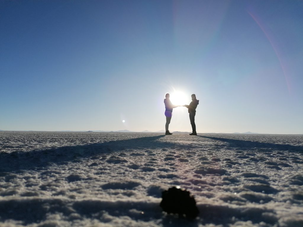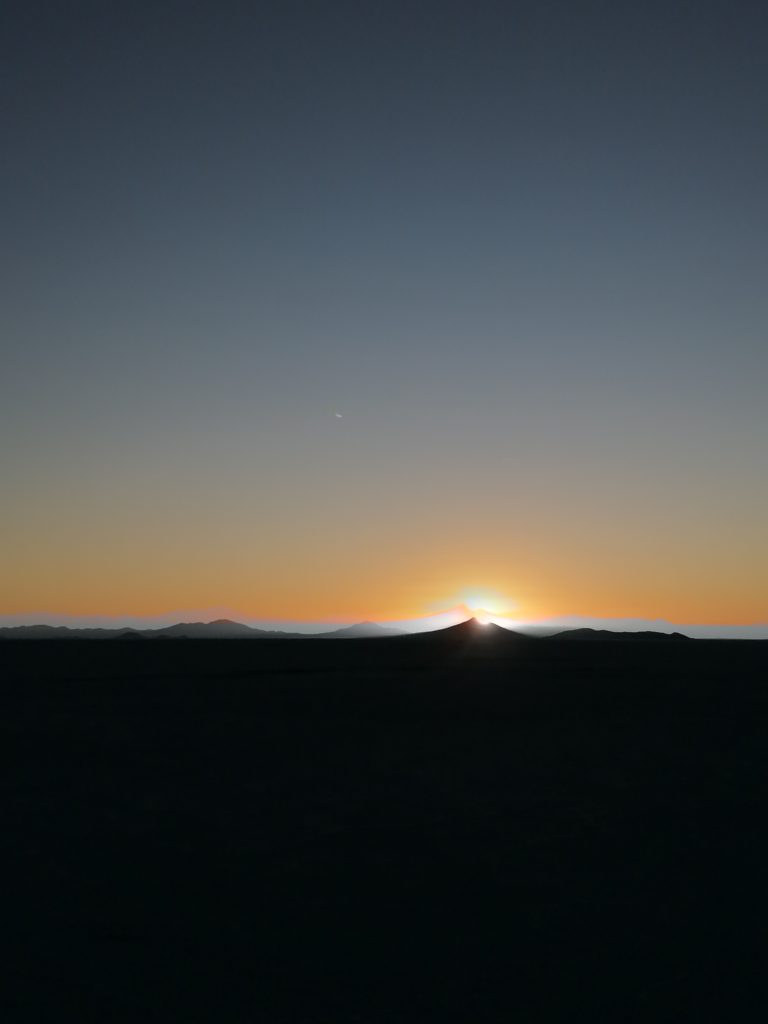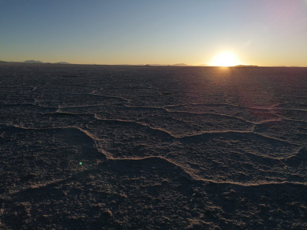 Es wird spät, die Sonne sinkt immer tiefer und wir sehen uns einen wunderschönen Sonnenuntergang in der Salzwüste an.