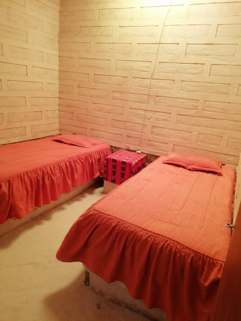 Sobald die Sonne unten ist, startet der Jeep und wir fahren zu unserer Unterkunft. Ziemlich lange sogar. Es geht raus aus der Salzwüste, das war nur der erste Tag. Es bleibt zwar stellenweise weiß, das Salz ist überall in der Region, nur dort war die höchste Konzentration. Der Weg wird holpriger, Teer haben wir längst hinter uns gelassen, aber Nelson scheint statt des regulären Wegs oft einen Nebenweg zu wählen, der viel holpriger und gefährlicher ausschaut, als der andere. Wir werden ordentlich durchgeschüttelt und müssen oft den Kopf einziehen, damit es uns nicht gegen die Decke dängelt, aber so ist die Reise auch ein echtes Abenteuer. Er weiß schon, was er tut. Etwa eine Stunde später kommen wir bei der Unterkunft an, ebenfalls ein Salzhotel. Bänke, Tische, Wände, Boden … und Betten aus Salz.