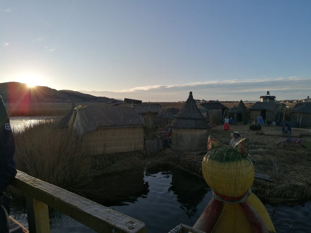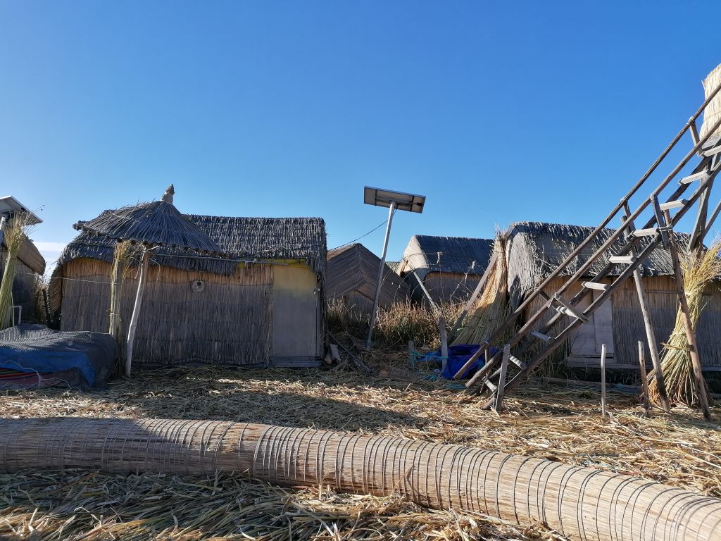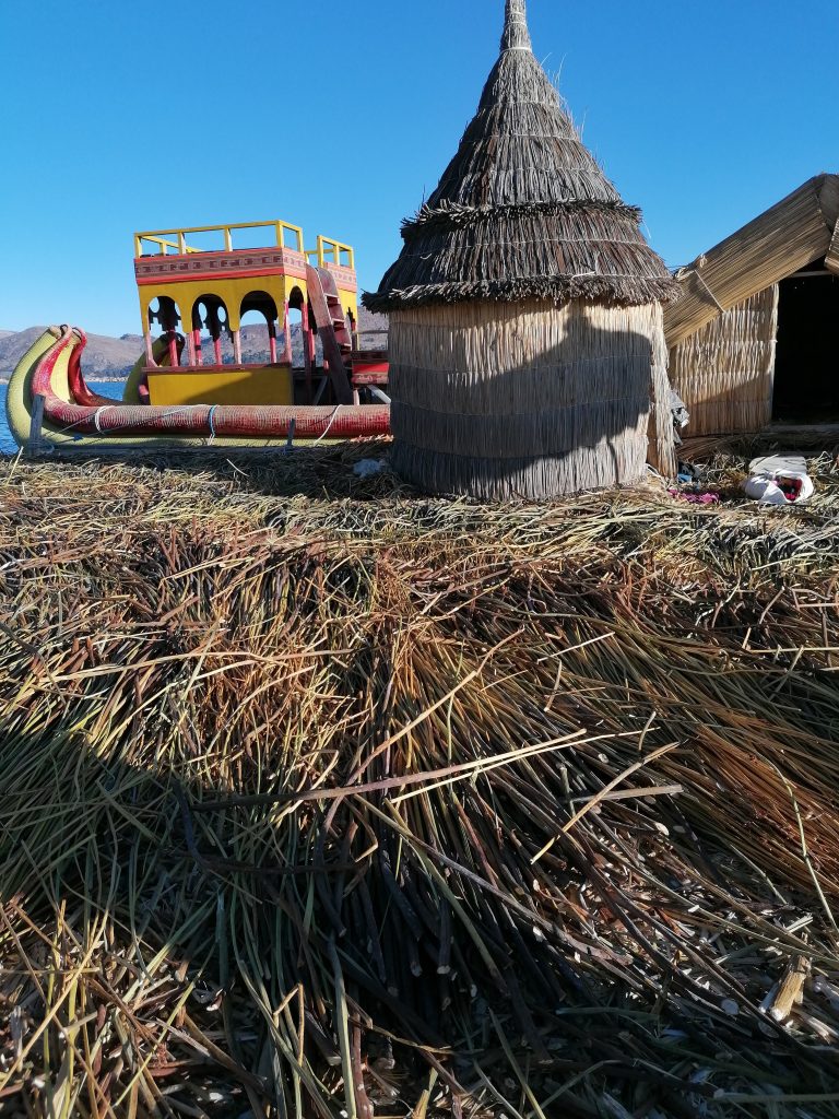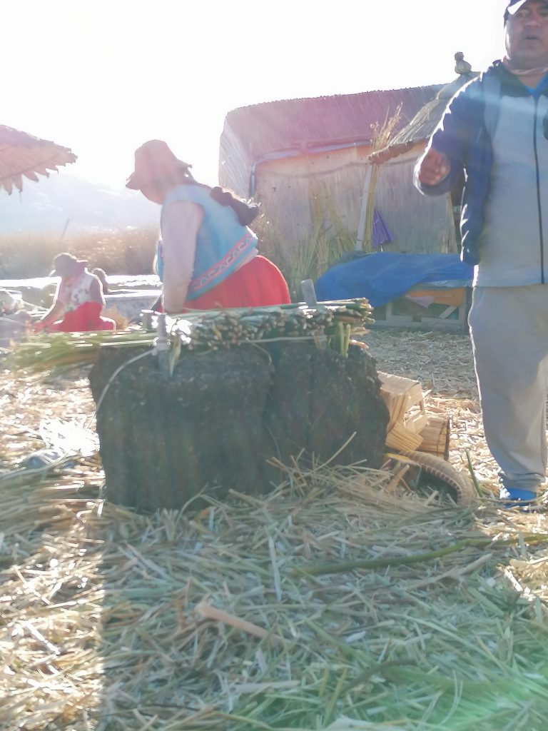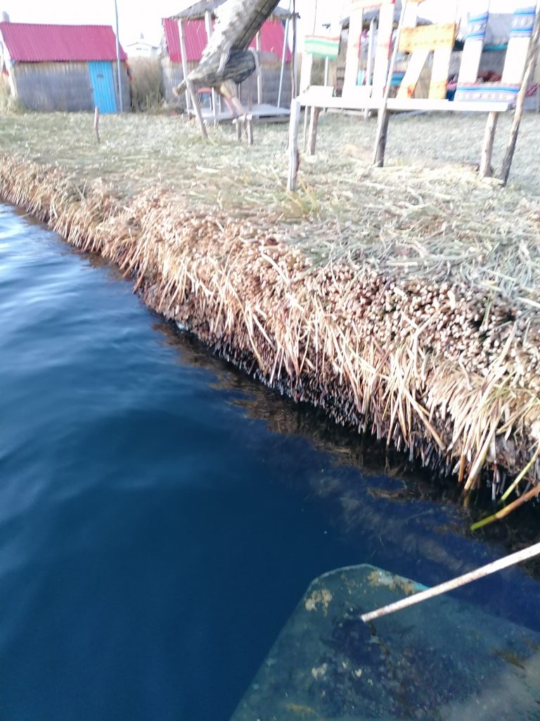 Unser Guide erklärt uns, wie die Inseln aufgebaut sind und wie es kommt, dass sie schwimmen, obwohl das Wasser hier elf Meter tief ist. Das Gras hat einen Erduntergrund von etwa anderthalb Meter, darüber ist die Seegrasschicht ebenfalls etwa anderthalb Meter. In der Erde bildet sich Sauerstoff… dieser lässt die Inseln schweben. Man hat die Seegrasfelder zu einem großen zusammengebunden… und nach 1-2 Monaten sind sie zu einem großen Feld zusammengewachsen, das stabil genug war, um ein Dorf darauf zu errichten. In der Regenzeit ist der Wasserspiegel etwa drei Meter höher. Alle 10-15 Tage muss man Schilf nachlegen, damit das Wasser nicht durchsickert.