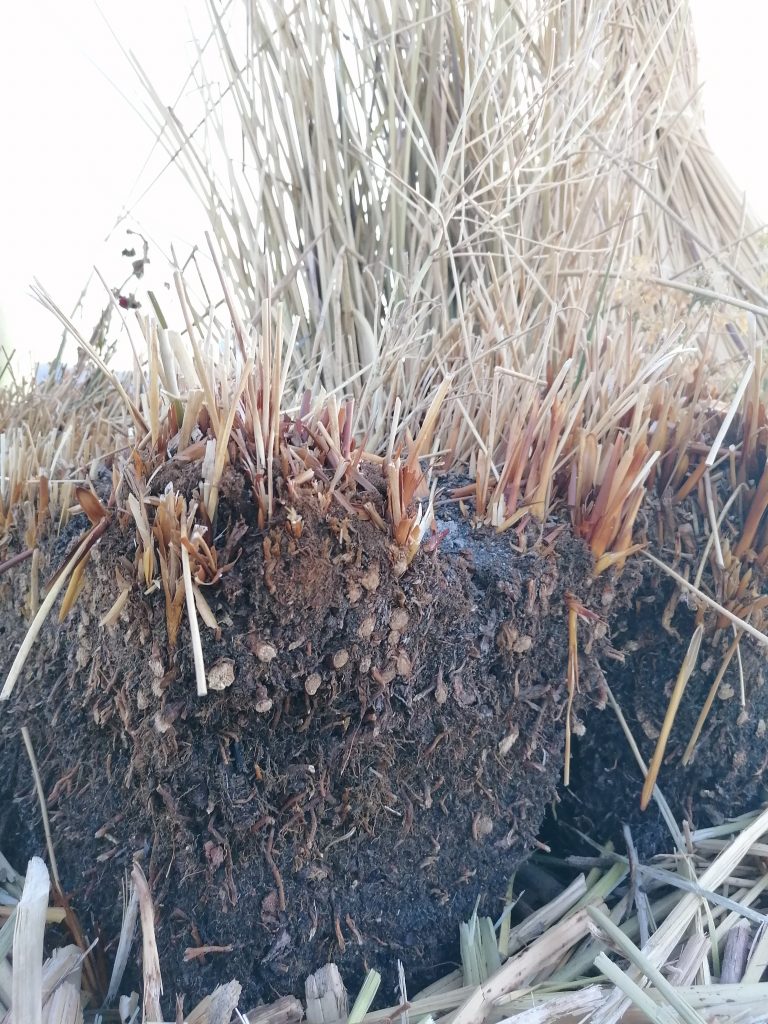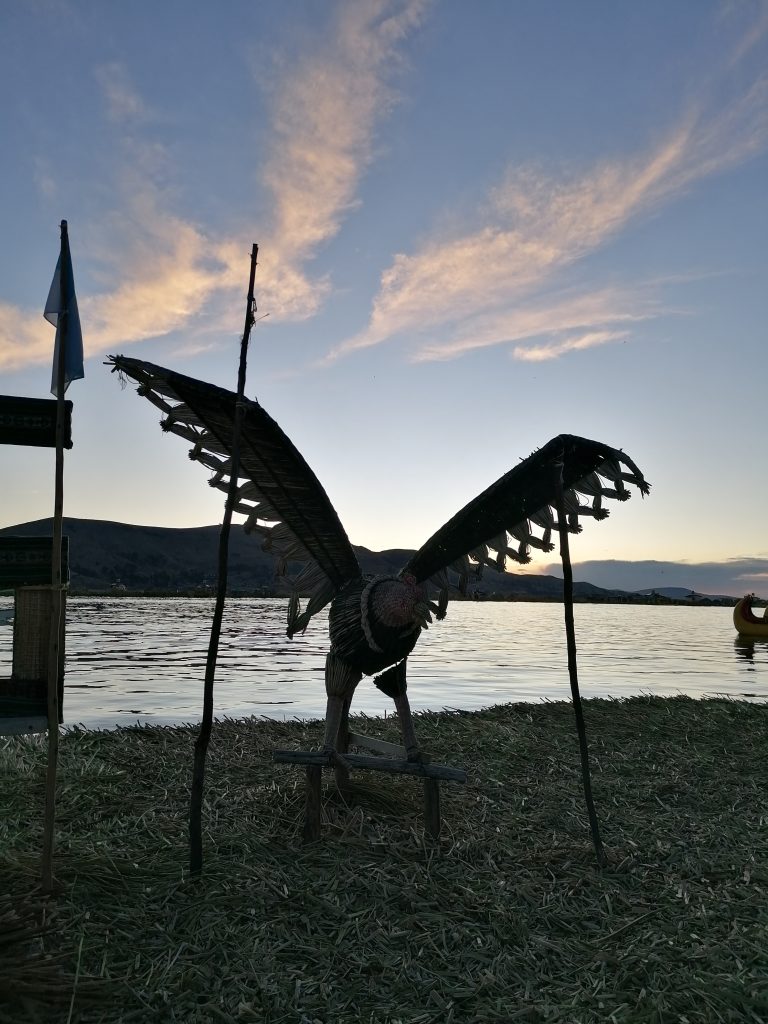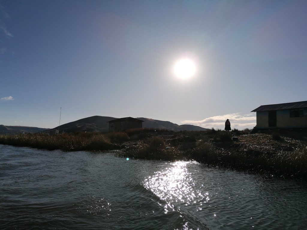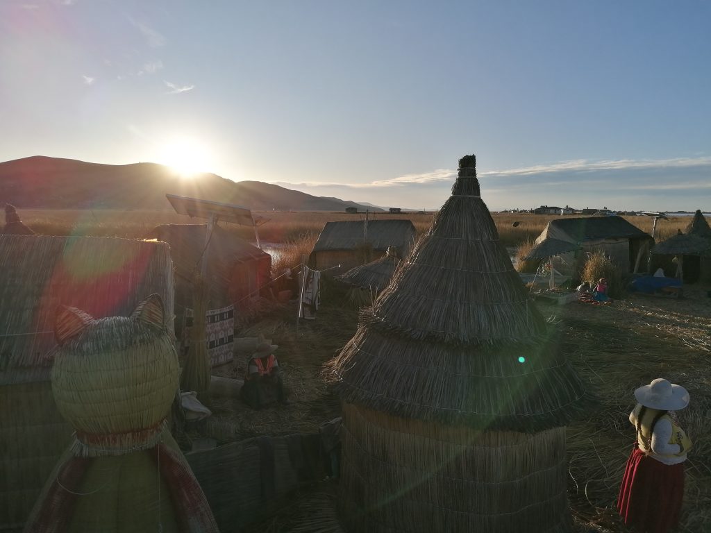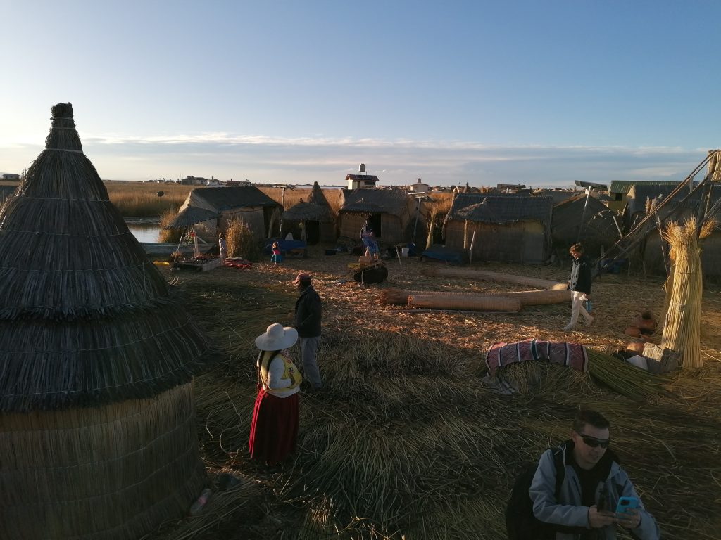 Unser Guide erklärt uns, wie die Inseln aufgebaut sind und wie es kommt, dass sie schwimmen, obwohl das Wasser hier elf Meter tief ist. Das Gras hat einen Erduntergrund von etwa anderthalb Meter, darüber ist die Seegrasschicht ebenfalls etwa anderthalb Meter. In der Erde bildet sich Sauerstoff… dieser lässt die Inseln schweben. Man hat die Seegrasfelder zu einem großen zusammengebunden… und nach 1-2 Monaten sind sie zu einem großen Feld zusammengewachsen, das stabil genug war, um ein Dorf darauf zu errichten. In der Regenzeit ist der Wasserspiegel etwa drei Meter höher. Alle 10-15 Tage muss man Schilf nachlegen, damit das Wasser nicht durchsickert.