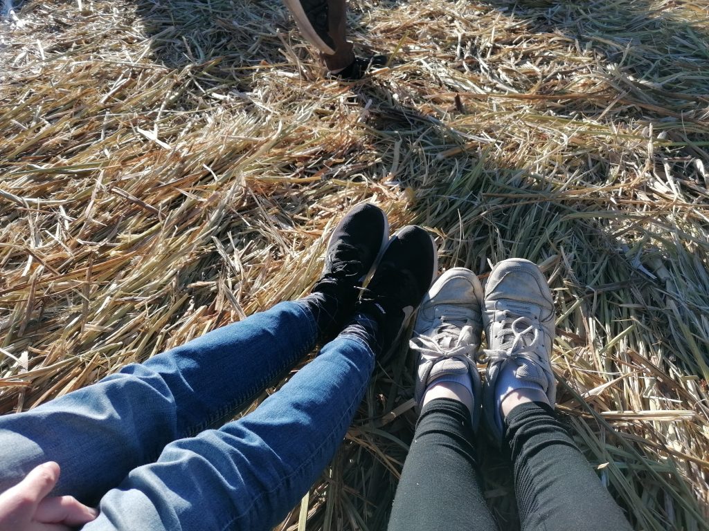 Etwa 45 min Fahrt, dann kommen wir zu unserem Ziel: Den schwimmenden Inseln von Uros (Islas flotantes). Wir steigen ab… und die Füße sinken ins Seegras, das unter den Füßen kracht. Komisches Gefühl. Nach einem kurzen Rundgang im Dorf setzen wir uns im Dorfplatz auf die Bänke aus zusammengefasstem Seegras… alles ist hier aus diesem Material.