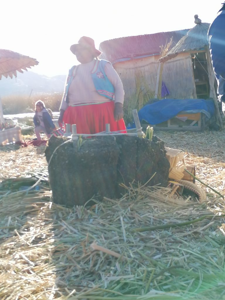 Während der Guide erzählt, kommen auf einem kleinen Boot ein paar Peruaner angefahren, springen schnell auf die Insel und bereiten ihre Verkaufsgüter vor. Zwar wurde uns schon gesagt, dass die Gemeinschaften hier heute fast ausschließlich vom Tourismus überleben, aber dann könnte man wenigstens pünktlich aus der Stadt zurück sein. Auch die „Präsidentin“ des Dorfes guckt die Ankömmlinge streng an. Dann wendet sie sich uns zu. Während der Guide erklärt hat, hat sie nebenbei an einem Modell demonstriert, wie die Inseln gebaut werden.