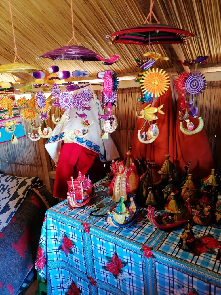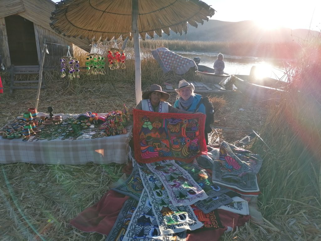 Draußen zeigt sie uns dann ihre Ware: Schmuck, Keramik und wunderschöne Webarbeiten, die sie selbst macht, Tischläufer und Kissenbezüge. Die Sachen sind wirklich schön und man merkt, dass sie uns gerne etwas verkaufen will, aber wie immer sind fast alles Backpacker, die nichts oder zumindest nichts großes mitnehmen wollen. Ich entdecke schließlich eine Kette mit einem Andenkreuz, die mir gut gefällt. Ale nimmt einen der Kissenbezüge mit, die wirklich schön sind. Auf meine Frage, wie lange die Gemeinschaften hier schon auf den Inseln leben, antwortet sie „schon immer“… also schon sehr sehr lange, bevor es Zahlen und Daten gab.