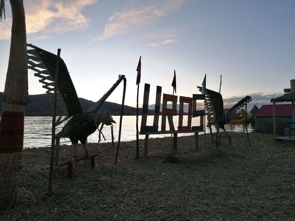 Dann halten wir noch kurz auf einer anderen Insel, wo wir Fotos mit dem Ortsnamen „Uros“ machen und einen Kaffee oder ähnliches kaufen können, wer will.