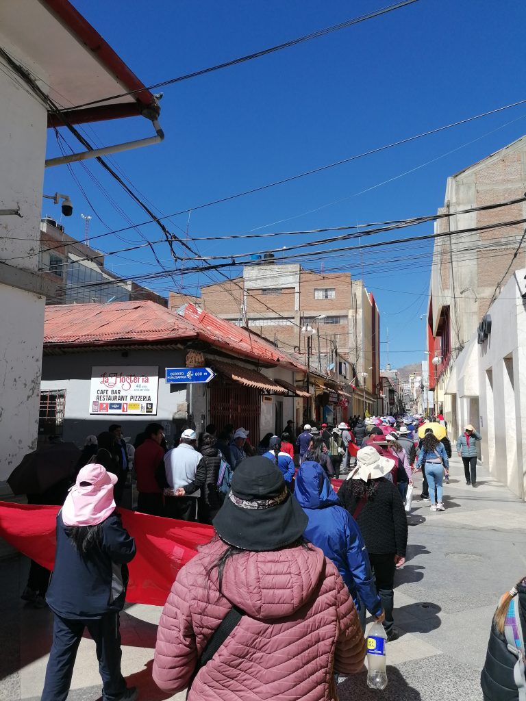 Am nächsten Vormittag machen wir eine Stadtrunde mit allen möglichen organisatorischen Sachen. Dabei laufen wir auch in die Proteste, die für den heutige Tag angesagt sind… die mal wieder nichts anderes sind als friedliche Proteste, ein Marsch, der mit Plakaten und Lautsprecheransagen durch die Straßen zieht. Puno ist eine schöne kleine Stadt, allerdings nichts, wo ich noch allzu viel Zeit verbringen wollen würde. Ich hoffe also, dass wir demnächst einen Bus finden.