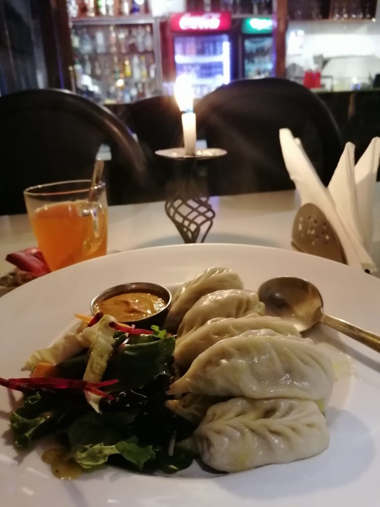 Im Restaurant angekommen bin ich der einzige Gast, was sicherlich an der Uhrzeit liegt. Es ist 19 Uhr, das ist eine sehr deutsche Zeit fürs Abendessen, hier essen die Leute sicher später. Ich bin zu müde, um lange zu überlegen, setze mich und bestelle nach kurzem Überfliegen der Karte einen Varation von Momos.