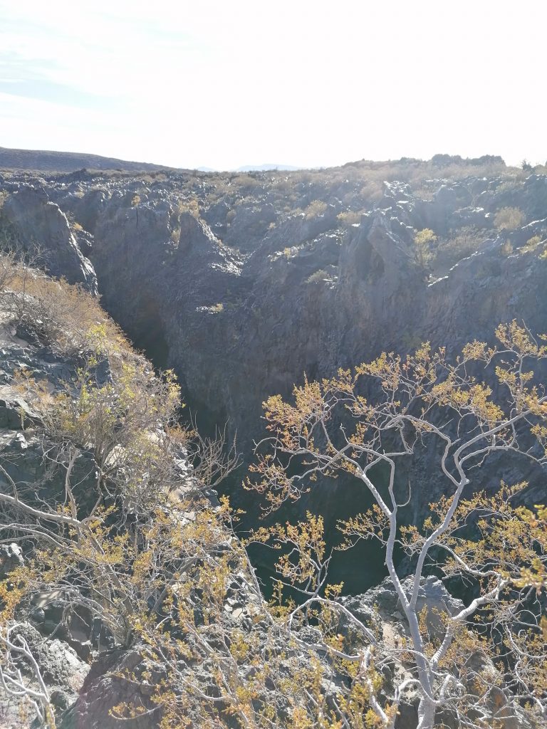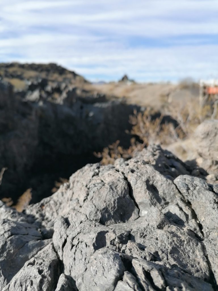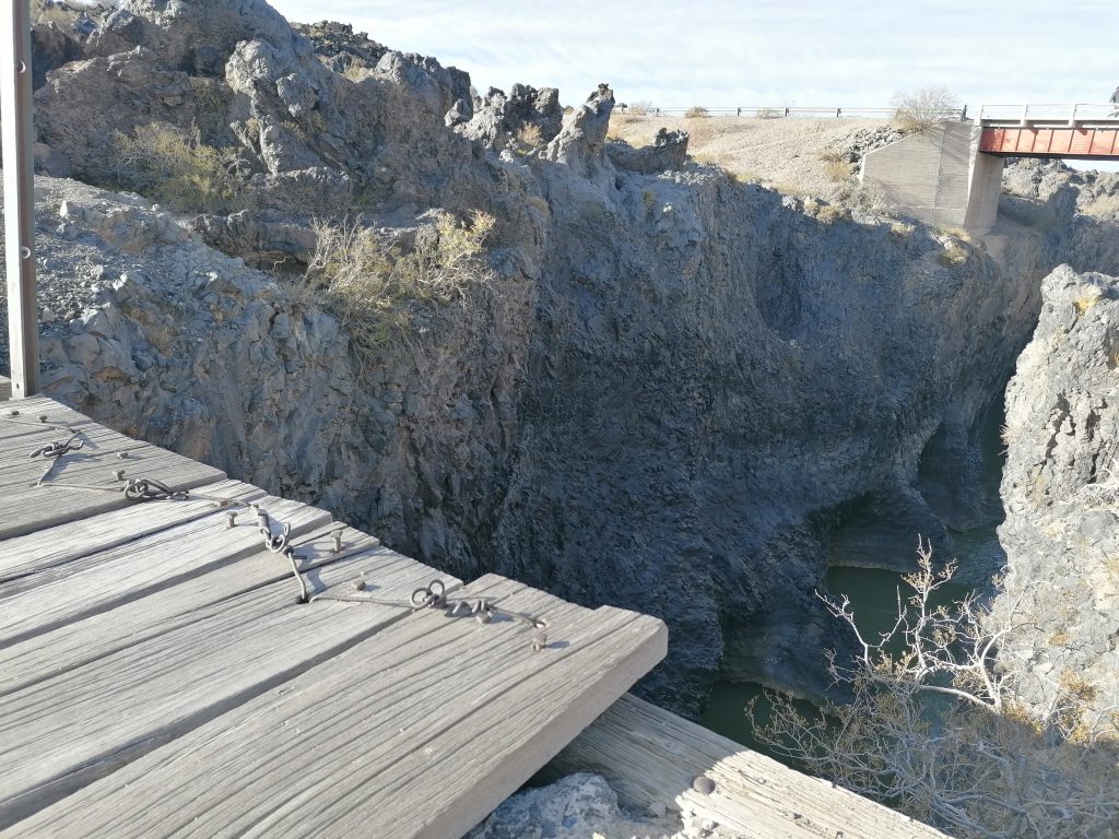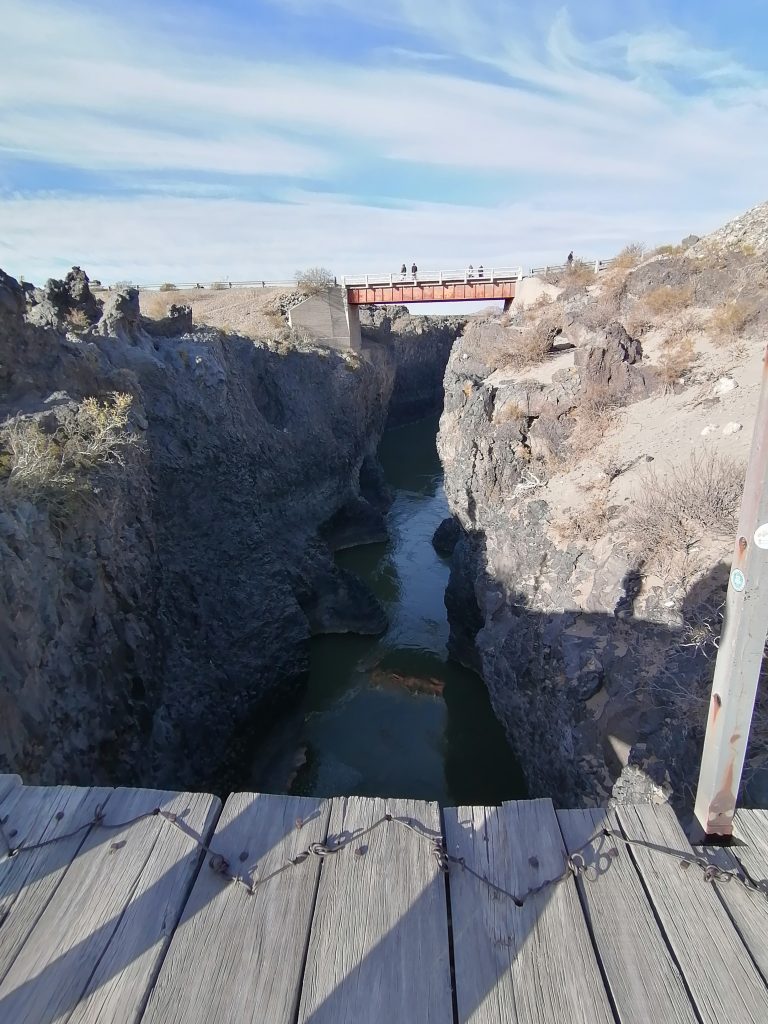 Um 8:30 Uhr holt mich das Shuttle für die Exkursion ab. Wir fahren erst ein dreiviertel Stunde zum ersten Stopp. Schon nach etwa 15 Minuten in der trockenen Luft bekomme ich einen furchtbaren Hustenanfall, versuche aber alles um es zu unterdrücken… wie unangenehm, alle vollzuhusten, während der Guide Infos zur Umgebung erklärt. Das passiert mir unterwegs einige Male. Während der langen Hinfahrt versuche ich wirklich zu zuhören, aber ich werde durch die Busfahrt so müde, dass ich kaum die Augen aufhalten kann und irgendwann gebe ich der Müdigkeit nach und schließe die Augen. Dann kommt der erste Stopp und die frische Luft weckt mich endgültig, außerdem ist sie Balsam für meinen Hals. Wir stehen auf der Brücke über einer Schlucht, durch die der Rio Grande (also einer, davon gibt’s viele) fließt… die Schlucht und die umliegenden Felsen sind Vulkangestein… es sieht surreal aus und wunderschön: