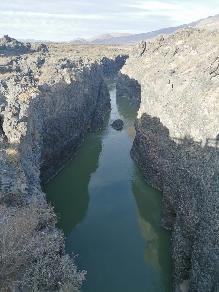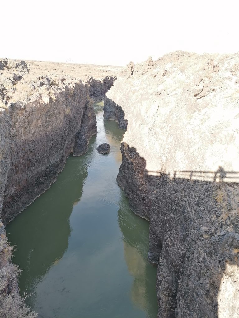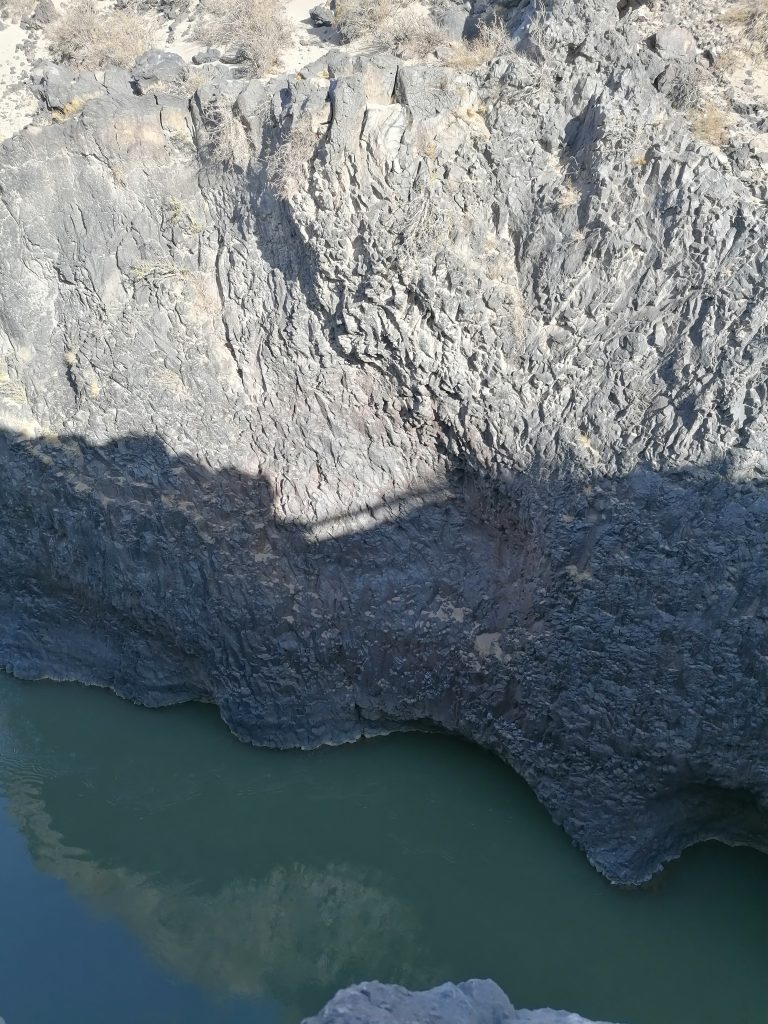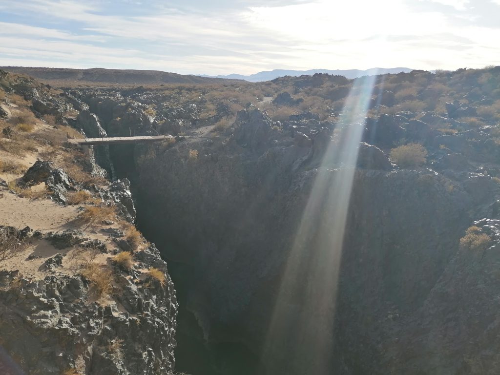 Um 8:30 Uhr holt mich das Shuttle für die Exkursion ab. Wir fahren erst ein dreiviertel Stunde zum ersten Stopp. Schon nach etwa 15 Minuten in der trockenen Luft bekomme ich einen furchtbaren Hustenanfall, versuche aber alles um es zu unterdrücken… wie unangenehm, alle vollzuhusten, während der Guide Infos zur Umgebung erklärt. Das passiert mir unterwegs einige Male. Während der langen Hinfahrt versuche ich wirklich zu zuhören, aber ich werde durch die Busfahrt so müde, dass ich kaum die Augen aufhalten kann und irgendwann gebe ich der Müdigkeit nach und schließe die Augen. Dann kommt der erste Stopp und die frische Luft weckt mich endgültig, außerdem ist sie Balsam für meinen Hals. Wir stehen auf der Brücke über einer Schlucht, durch die der Rio Grande (also einer, davon gibt’s viele) fließt… die Schlucht und die umliegenden Felsen sind Vulkangestein… es sieht surreal aus und wunderschön: