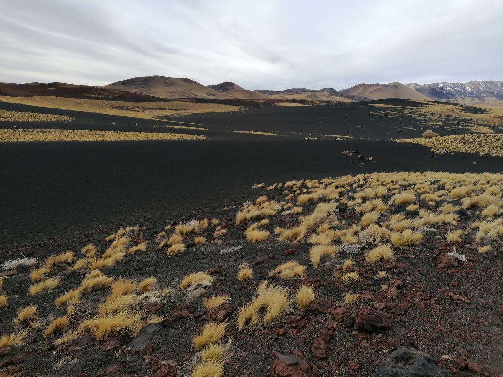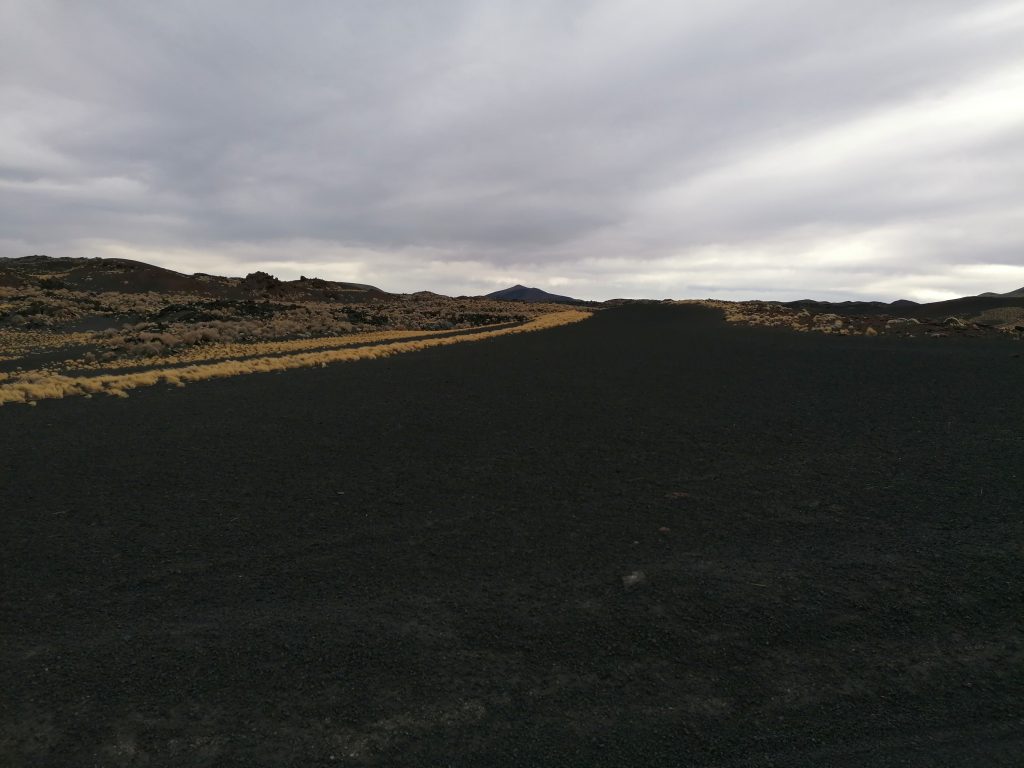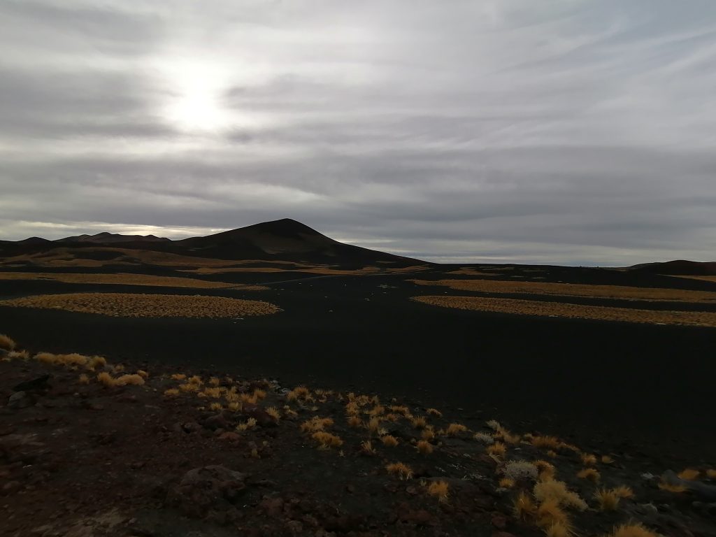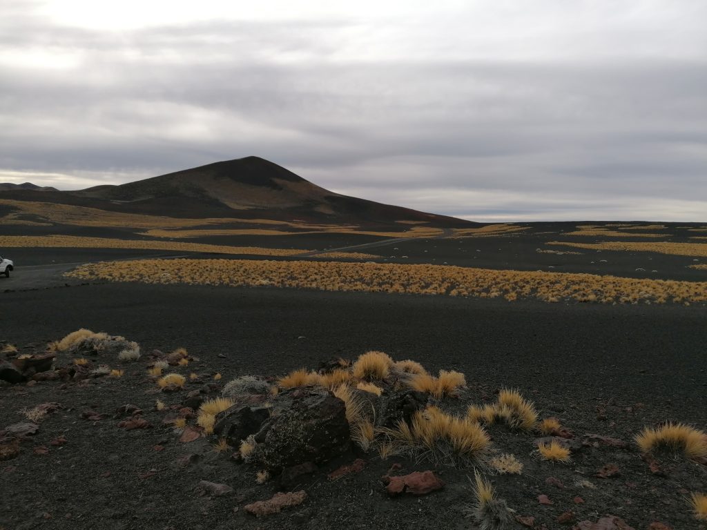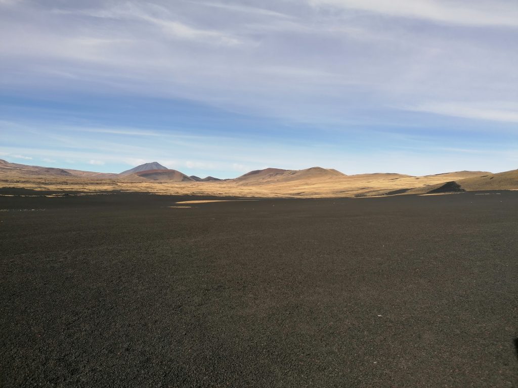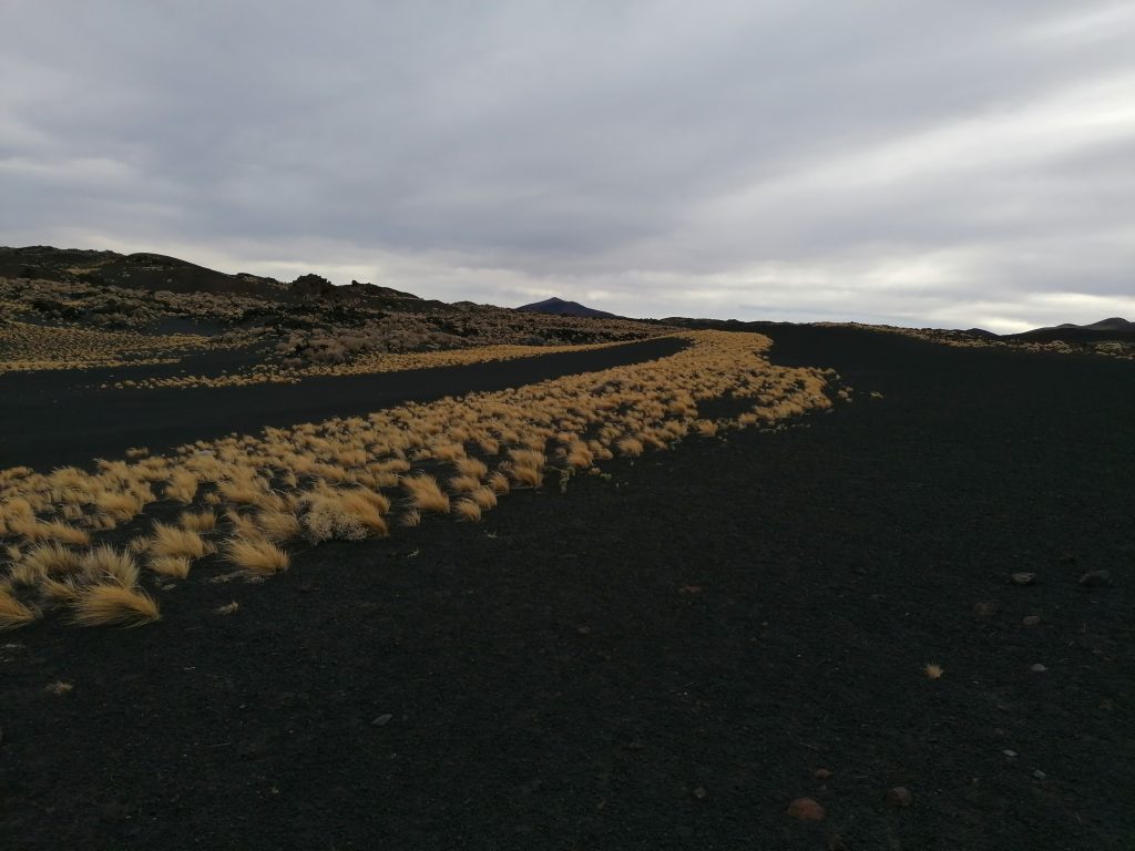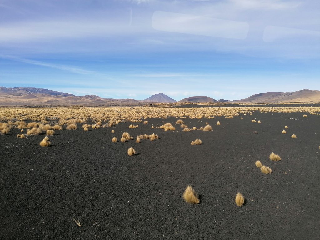 Die Fahrt ist holprig und kurvenreich, die Landschaft um uns herum wunderschön. Es ist bergig, aber keine hohen Berge. Zur rechten taucht ein höherer Komplex auf, der Guide erklärt, dort sind die meisten Vulkane… insgesamt 12? Die Gegend allgemein ist berühmt für eine hohe Vulkandichte… der Guide nennt ein paar Rekordszahlen, aber ich krieg’s nicht mehr zusammen, sorry… außerdem werde ich schnell abgelenkt… denn vor uns wird die Erde tatsächlich schwarz… tiefschwarz. Vereinzelte gelbe Büschel, später auch Steifen von gelben Pampasträuchern gesäumt und dann wieder reinschwarz… der Boden besteht aus Vulkansteinen… und ich hatte Charlie noch gefragt, was es noch gibt, was ich bis jetzt nicht gesehen hätte… naja, das hier!!!