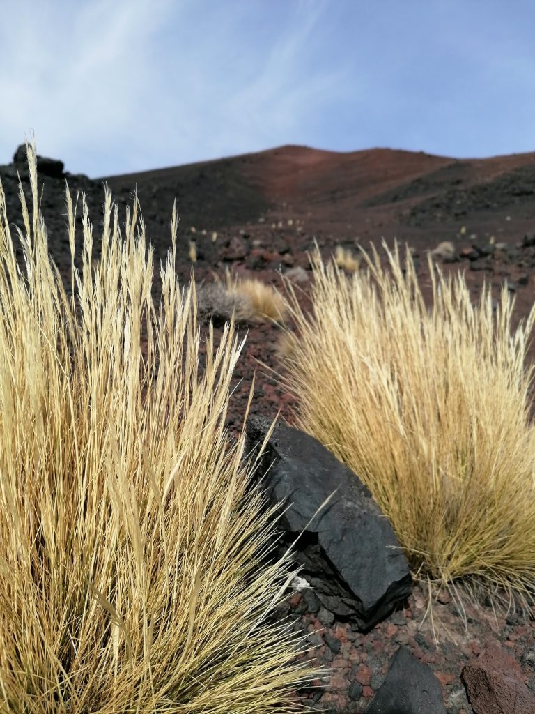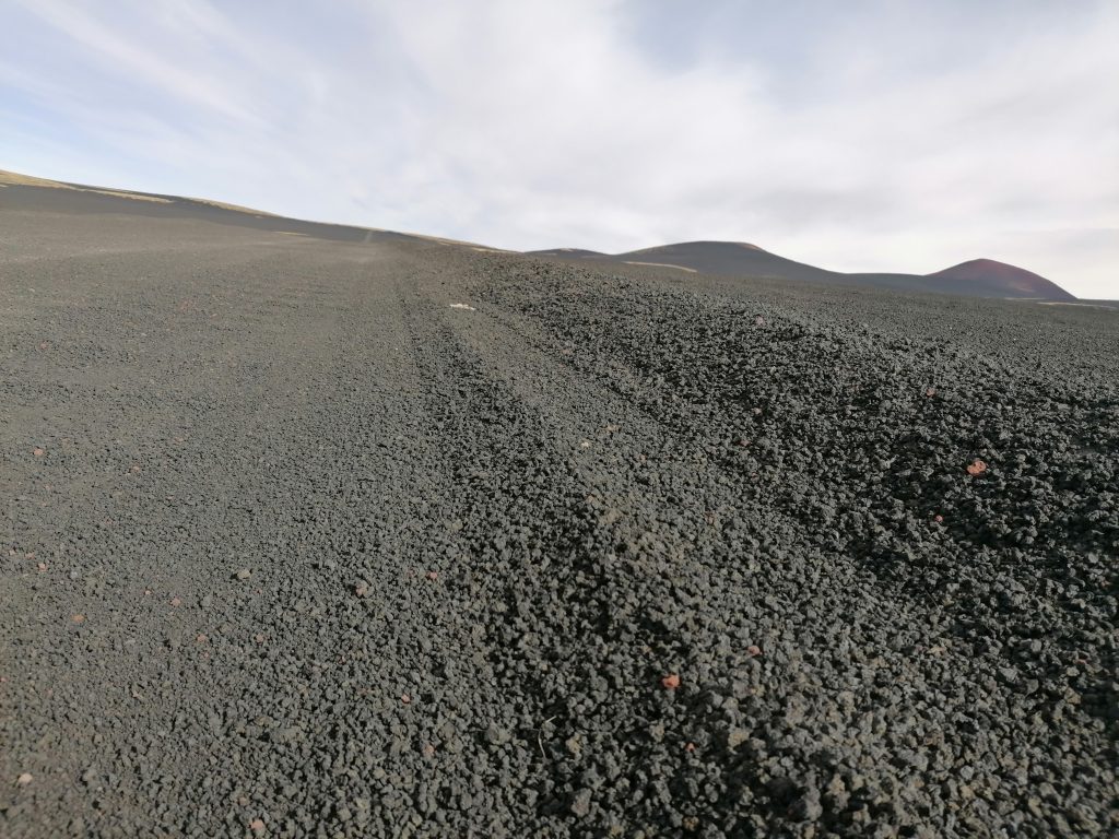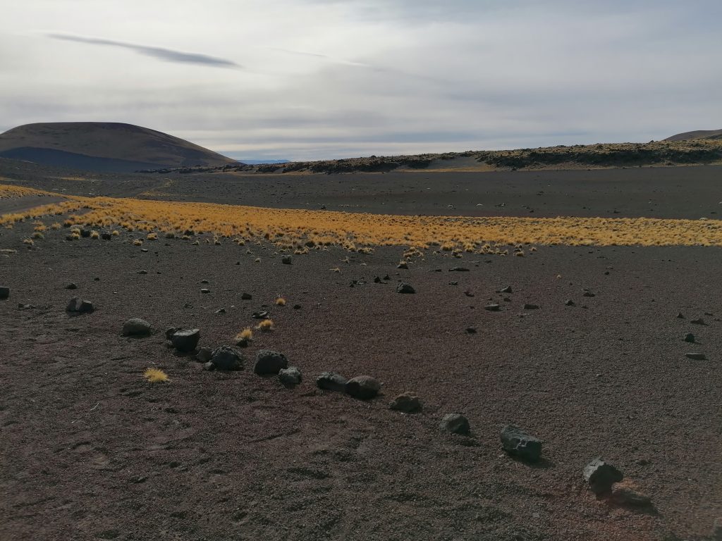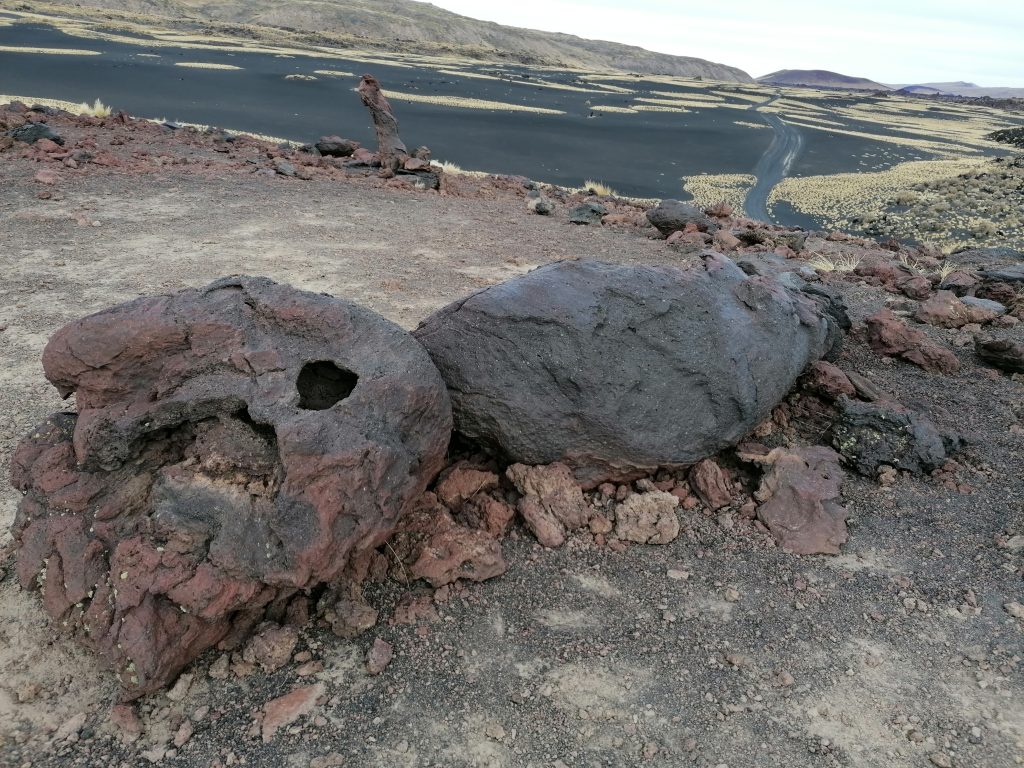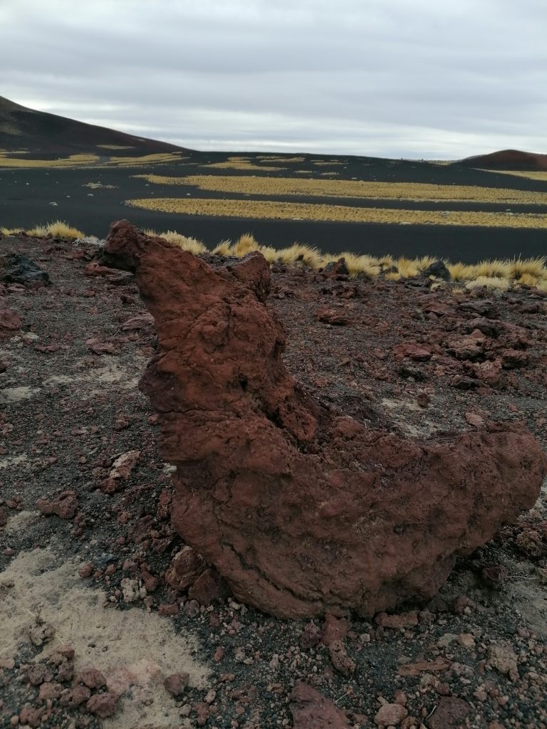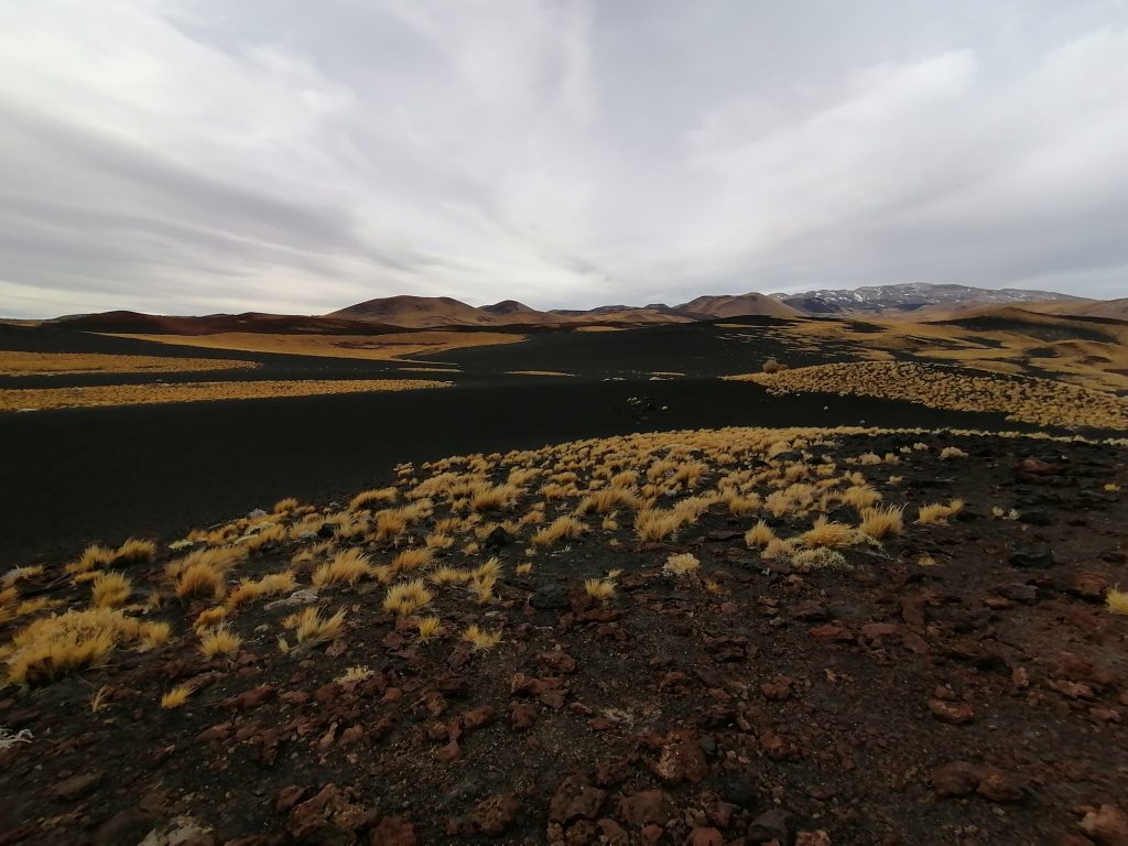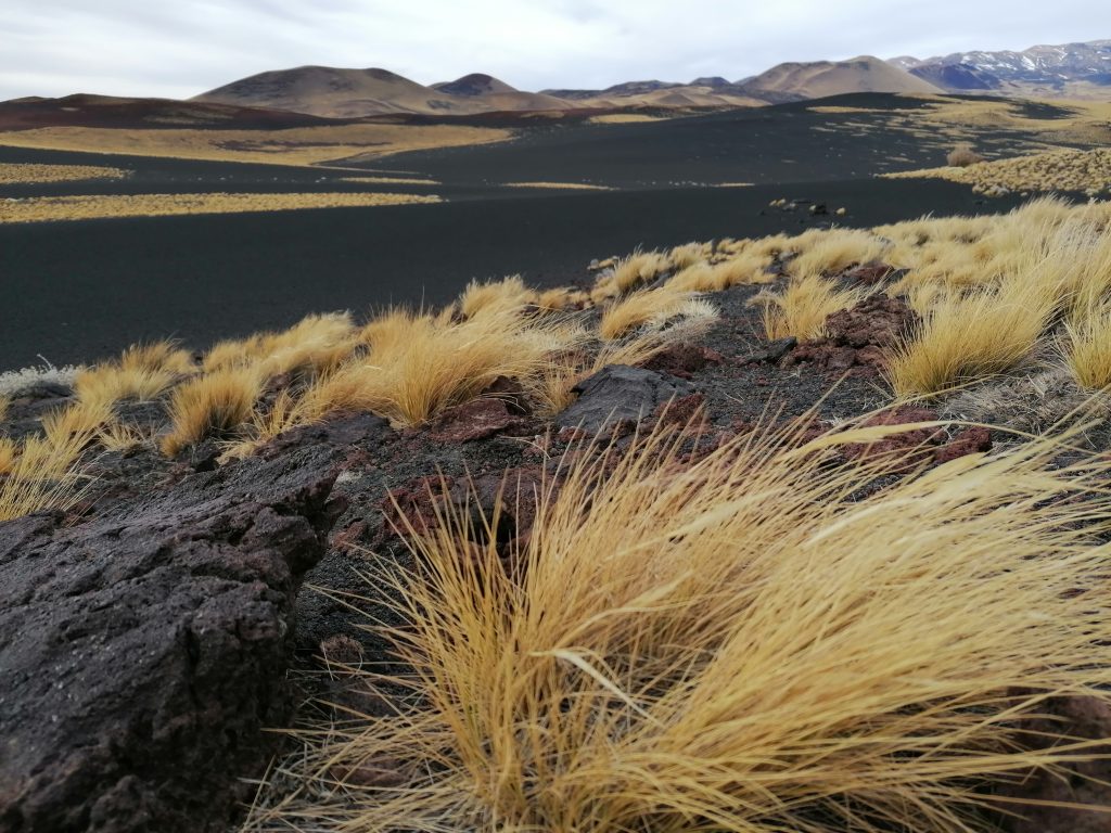 Die Fahrt ist holprig und kurvenreich, die Landschaft um uns herum wunderschön. Es ist bergig, aber keine hohen Berge. Zur rechten taucht ein höherer Komplex auf, der Guide erklärt, dort sind die meisten Vulkane… insgesamt 12? Die Gegend allgemein ist berühmt für eine hohe Vulkandichte… der Guide nennt ein paar Rekordszahlen, aber ich krieg’s nicht mehr zusammen, sorry… außerdem werde ich schnell abgelenkt… denn vor uns wird die Erde tatsächlich schwarz… tiefschwarz. Vereinzelte gelbe Büschel, später auch Steifen von gelben Pampasträuchern gesäumt und dann wieder reinschwarz… der Boden besteht aus Vulkansteinen… und ich hatte Charlie noch gefragt, was es noch gibt, was ich bis jetzt nicht gesehen hätte… naja, das hier!!!