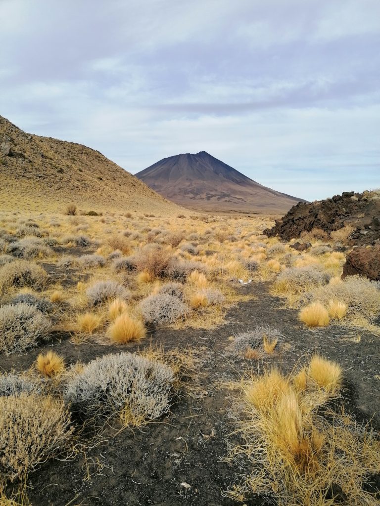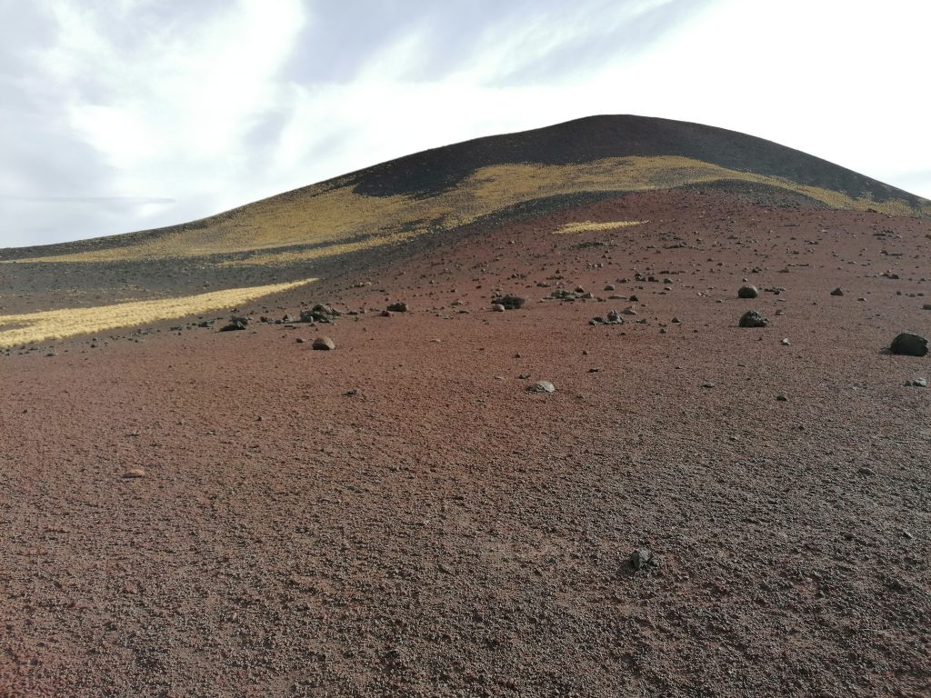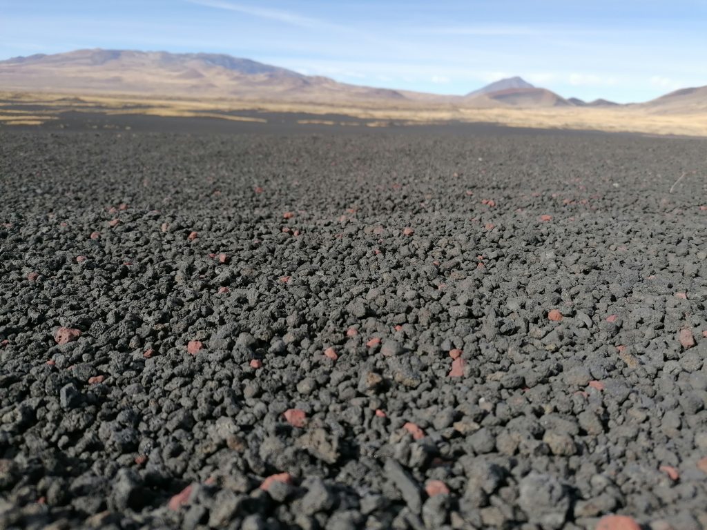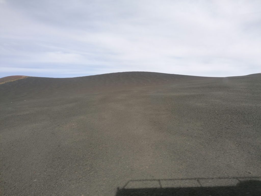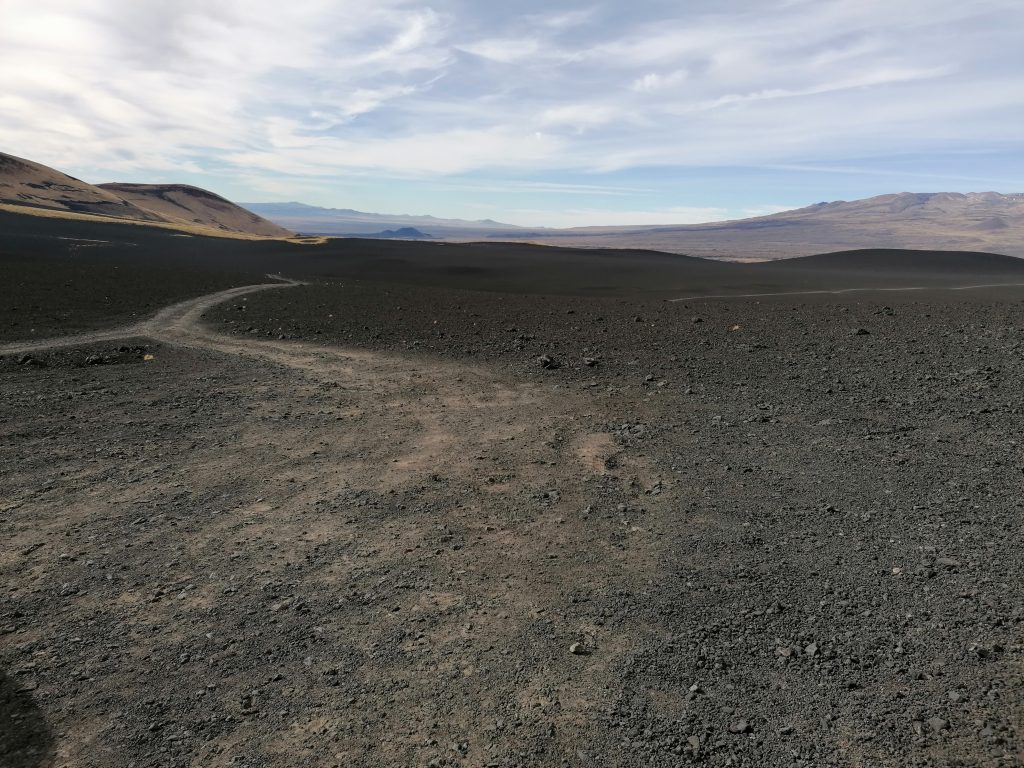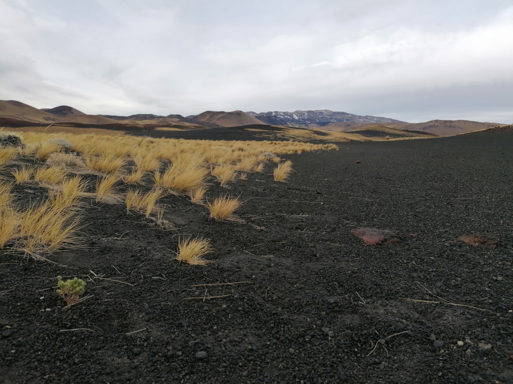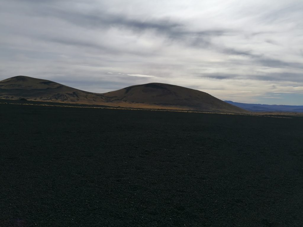 Die Fahrt ist holprig und kurvenreich, die Landschaft um uns herum wunderschön. Es ist bergig, aber keine hohen Berge. Zur rechten taucht ein höherer Komplex auf, der Guide erklärt, dort sind die meisten Vulkane… insgesamt 12? Die Gegend allgemein ist berühmt für eine hohe Vulkandichte… der Guide nennt ein paar Rekordszahlen, aber ich krieg’s nicht mehr zusammen, sorry… außerdem werde ich schnell abgelenkt… denn vor uns wird die Erde tatsächlich schwarz… tiefschwarz. Vereinzelte gelbe Büschel, später auch Steifen von gelben Pampasträuchern gesäumt und dann wieder reinschwarz… der Boden besteht aus Vulkansteinen… und ich hatte Charlie noch gefragt, was es noch gibt, was ich bis jetzt nicht gesehen hätte… naja, das hier!!!