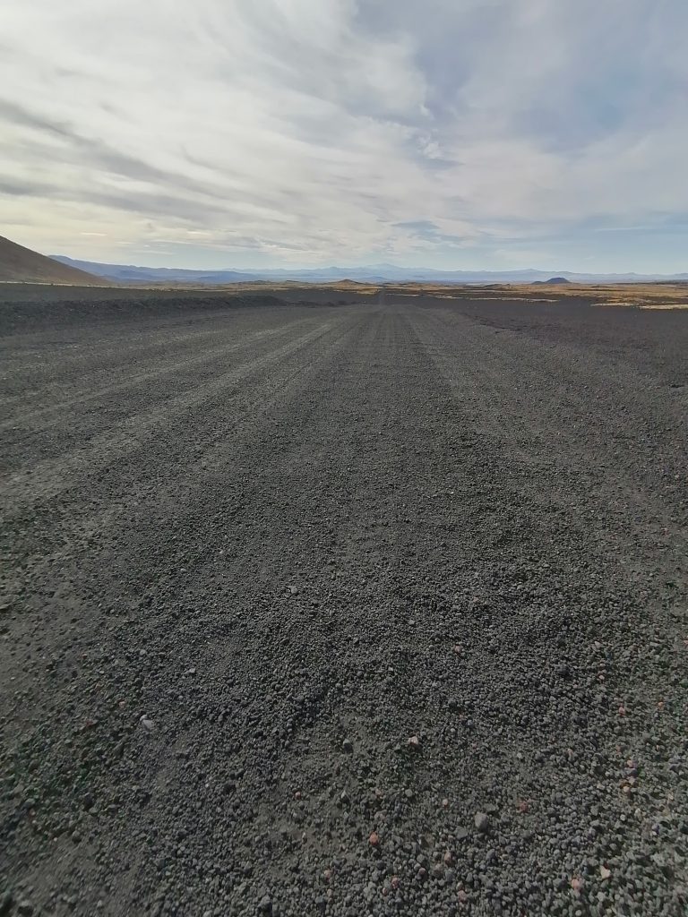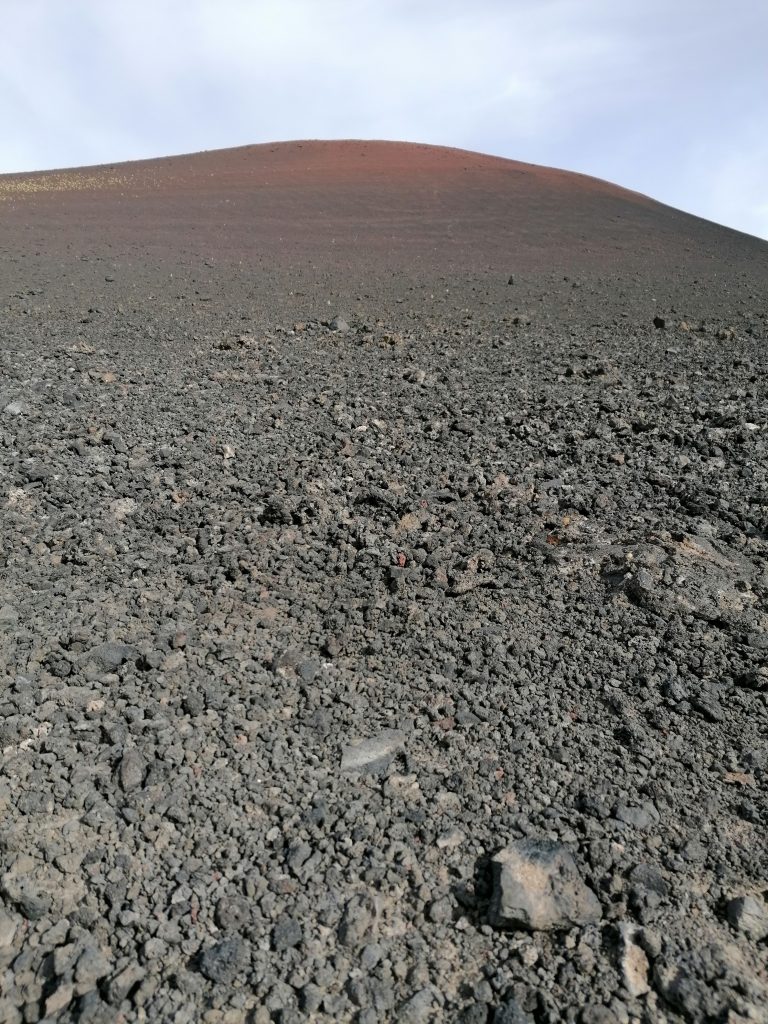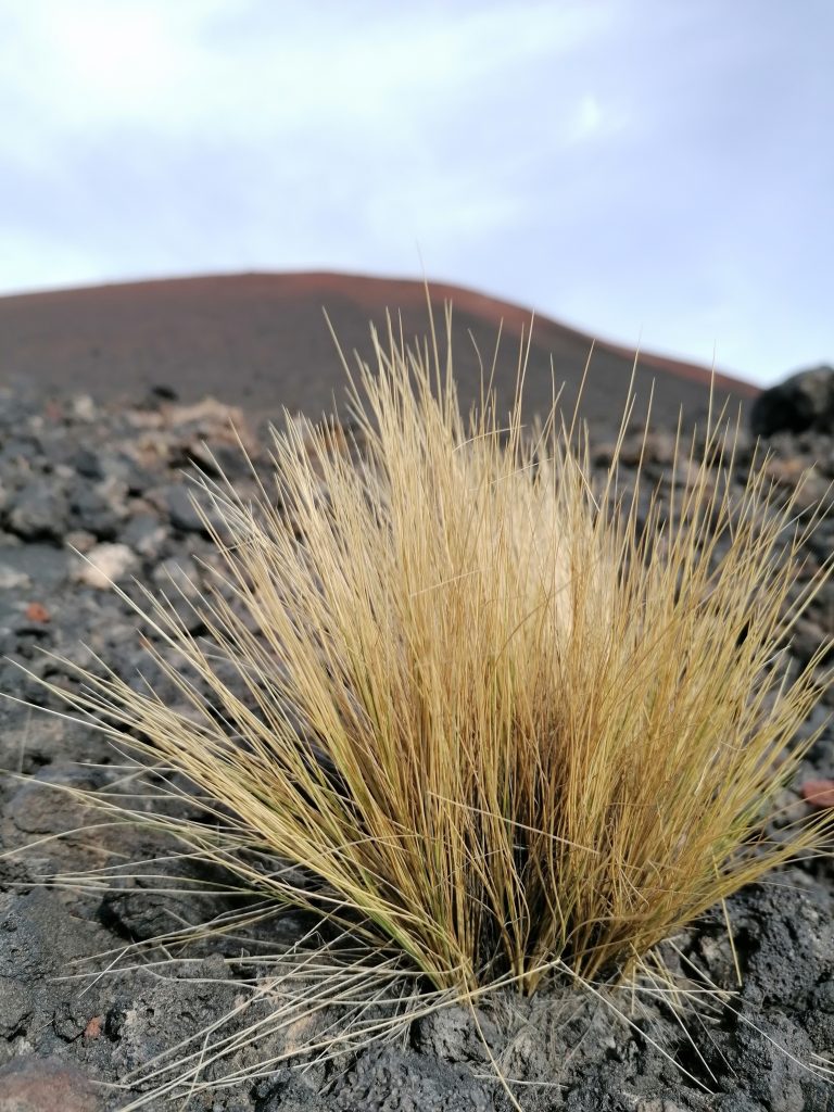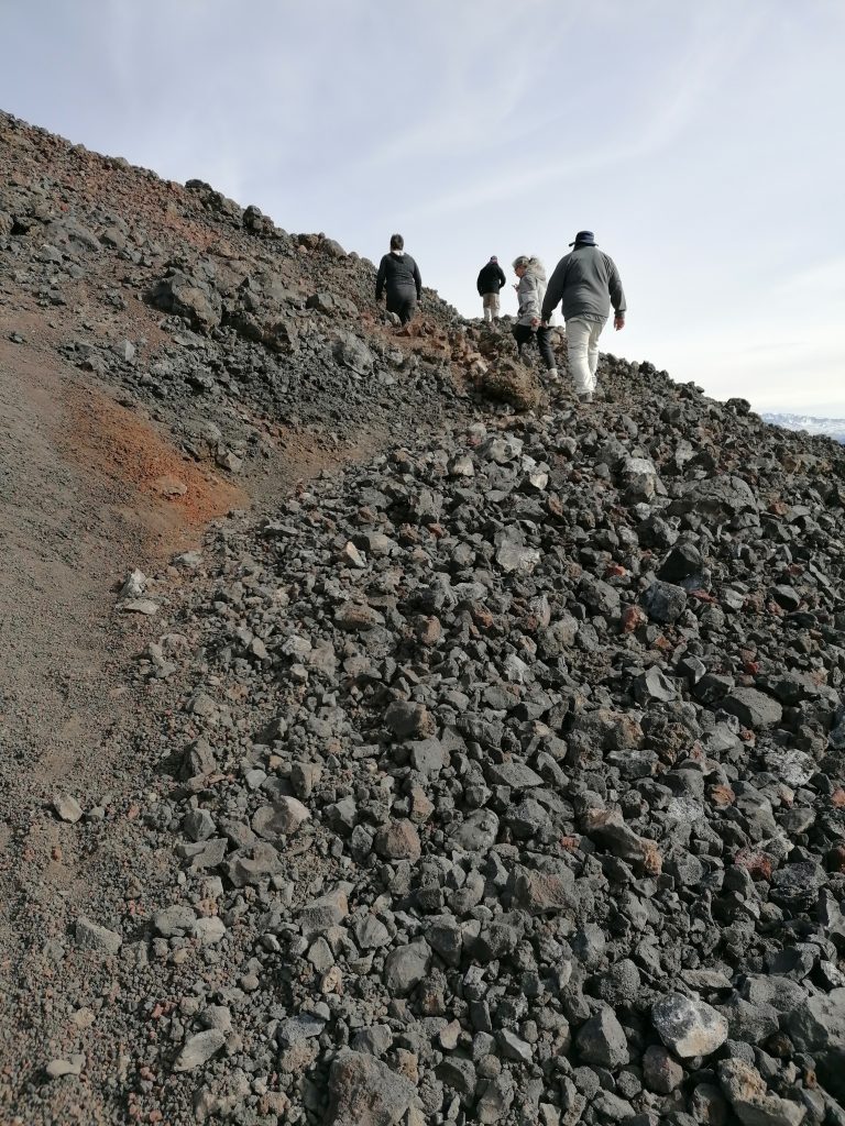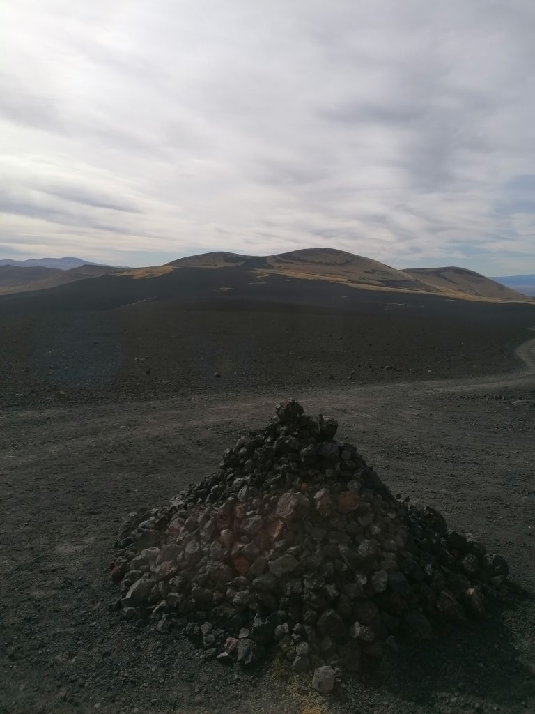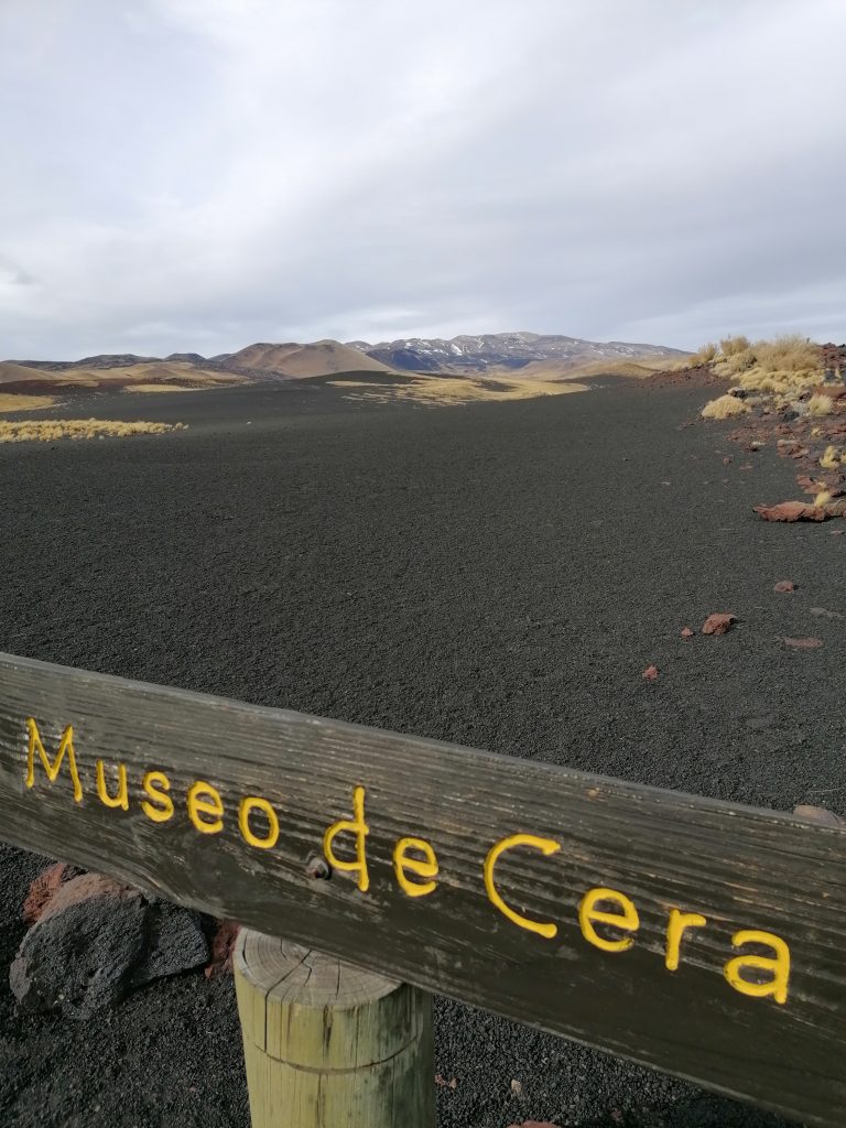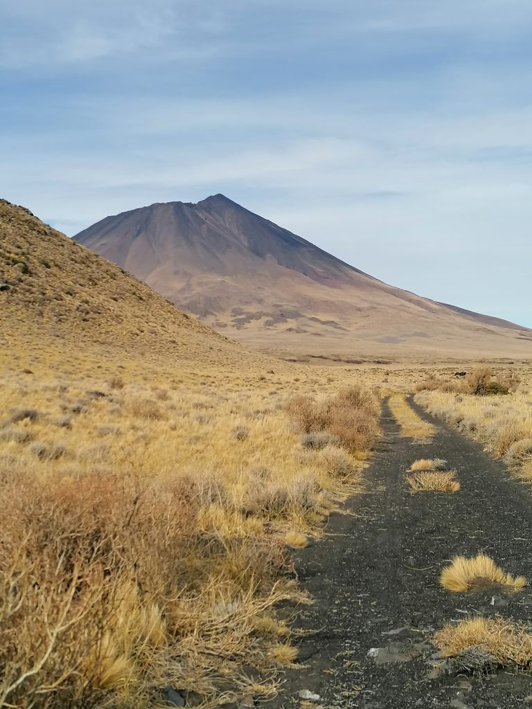 Die Fahrt ist holprig und kurvenreich, die Landschaft um uns herum wunderschön. Es ist bergig, aber keine hohen Berge. Zur rechten taucht ein höherer Komplex auf, der Guide erklärt, dort sind die meisten Vulkane… insgesamt 12? Die Gegend allgemein ist berühmt für eine hohe Vulkandichte… der Guide nennt ein paar Rekordszahlen, aber ich krieg’s nicht mehr zusammen, sorry… außerdem werde ich schnell abgelenkt… denn vor uns wird die Erde tatsächlich schwarz… tiefschwarz. Vereinzelte gelbe Büschel, später auch Steifen von gelben Pampasträuchern gesäumt und dann wieder reinschwarz… der Boden besteht aus Vulkansteinen… und ich hatte Charlie noch gefragt, was es noch gibt, was ich bis jetzt nicht gesehen hätte… naja, das hier!!!