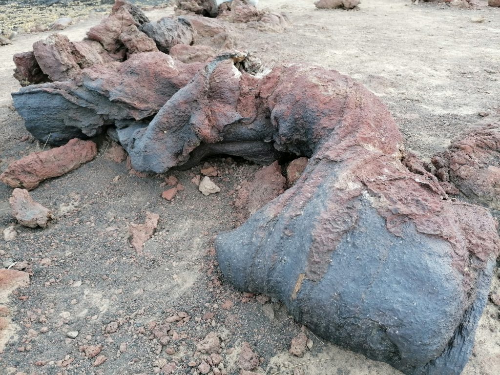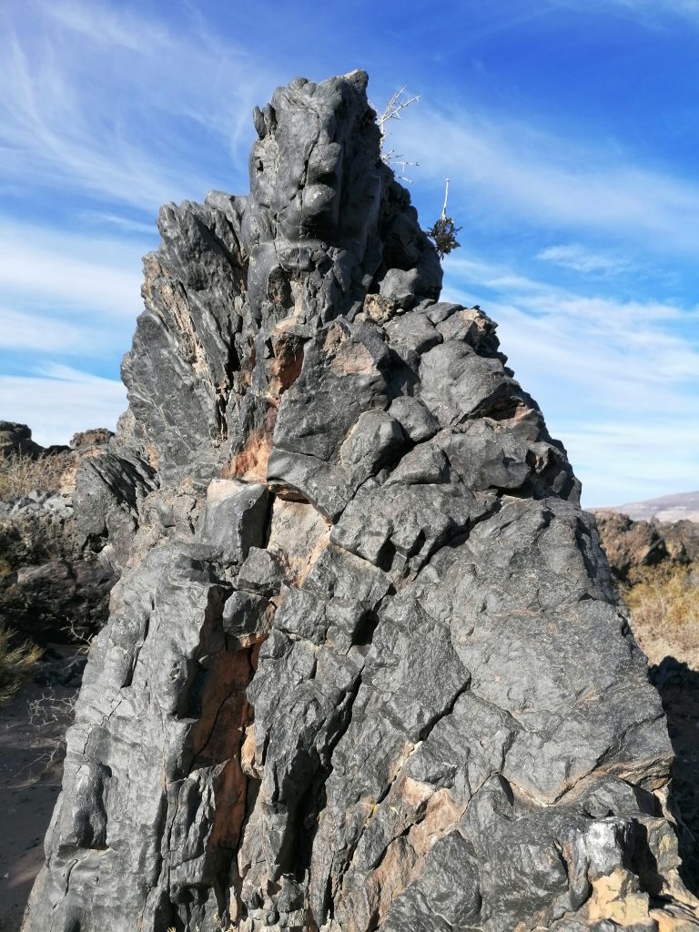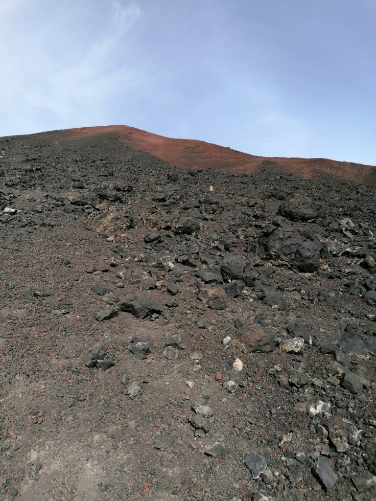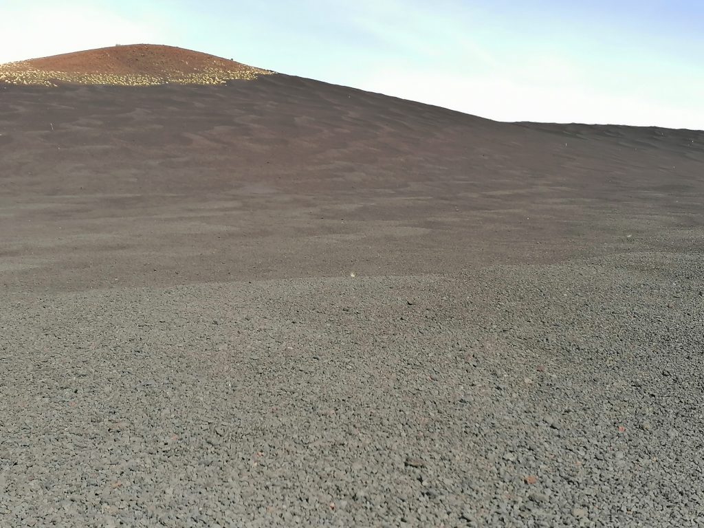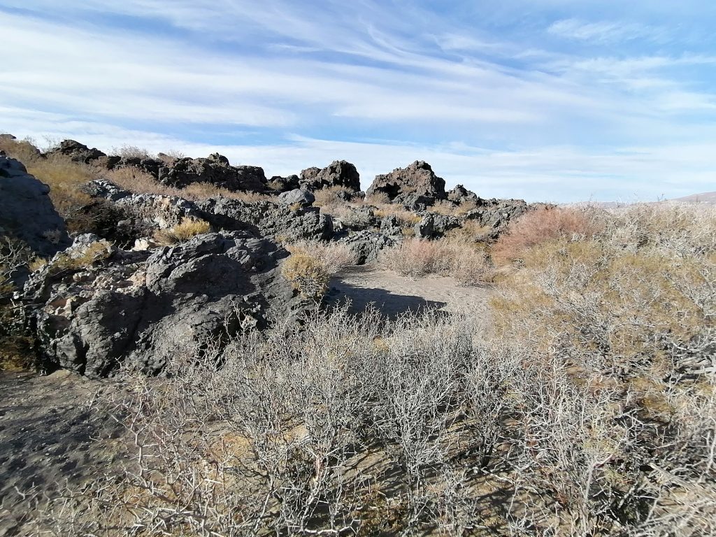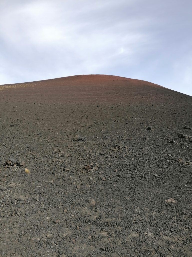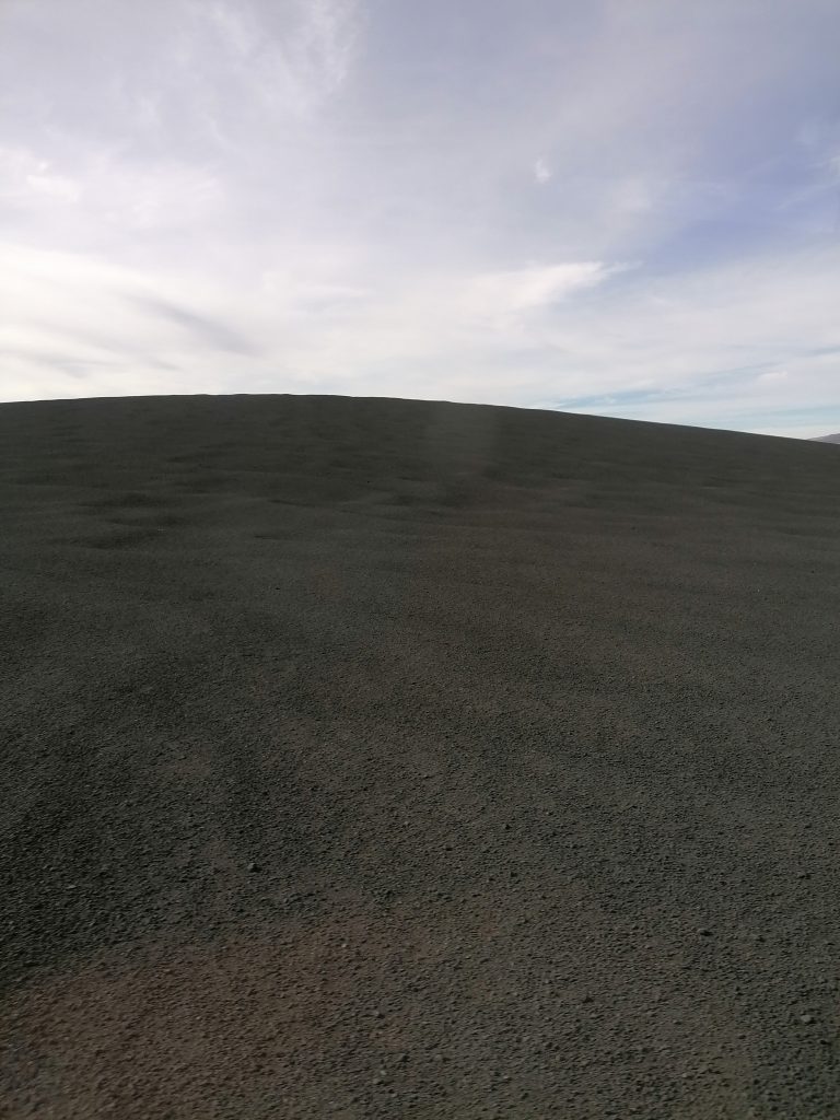Die Fahrt ist holprig und kurvenreich, die Landschaft um uns herum wunderschön. Es ist bergig, aber keine hohen Berge. Zur rechten taucht ein höherer Komplex auf, der Guide erklärt, dort sind die meisten Vulkane… insgesamt 12? Die Gegend allgemein ist berühmt für eine hohe Vulkandichte… der Guide nennt ein paar Rekordszahlen, aber ich krieg’s nicht mehr zusammen, sorry… außerdem werde ich schnell abgelenkt… denn vor uns wird die Erde tatsächlich schwarz… tiefschwarz. Vereinzelte gelbe Büschel, später auch Steifen von gelben Pampasträuchern gesäumt und dann wieder reinschwarz… der Boden besteht aus Vulkansteinen… und ich hatte Charlie noch gefragt, was es noch gibt, was ich bis jetzt nicht gesehen hätte… naja, das hier!!!