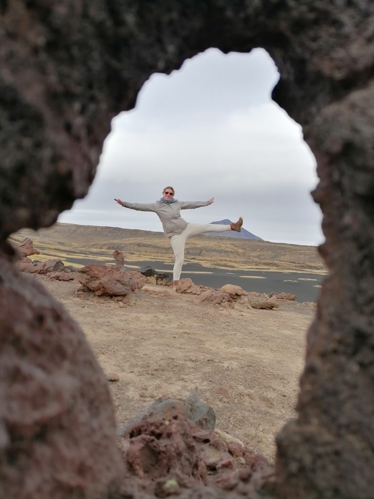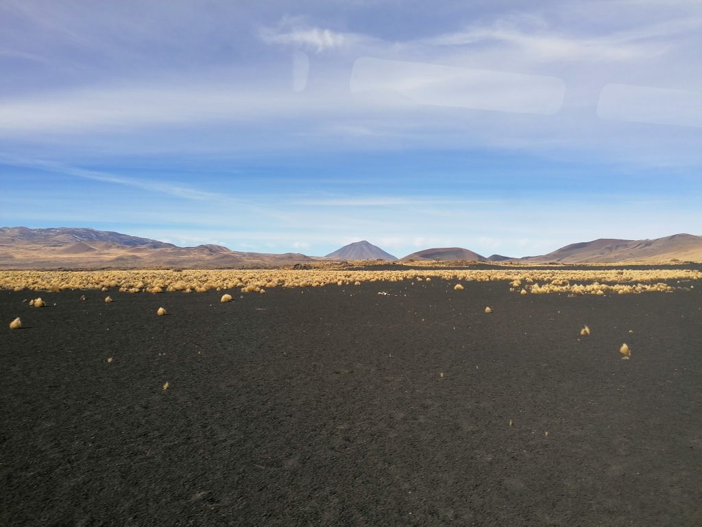 Ich bin ehrlich, ich hab keine Ahnung, wo ich grade bin und was ich sehen werde. Charlie meinte, die Tour ist gut, also bin ich dabei. Ich bin schon zufrieden, weil es gutes Essen gab. Und ich gebe zu, dass ich wenig aufnahmefähig bin und beim Guide nur Spanisch verstehe. Also… äh…ja, normalerweise, aber…in dem Fall kostet es mich viel Energie überhaupt was verstehen, weil er sehr schnell spricht und mein Kopf noch halb mit Watte und Schnodder gefüllt ist. Was ich verstehe sind Vulkane und Pampa Negra (Schwarze Pampa)… na das klingt doch ganz gut?!