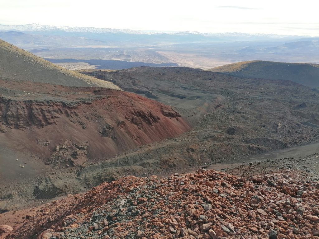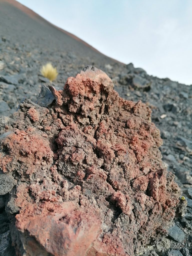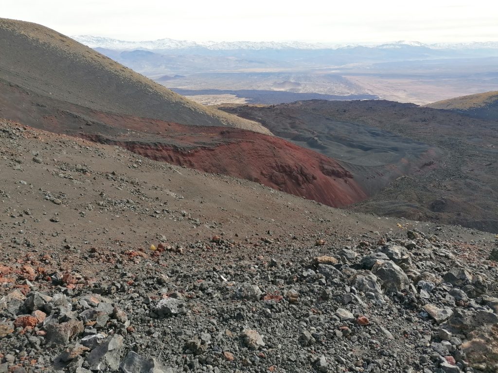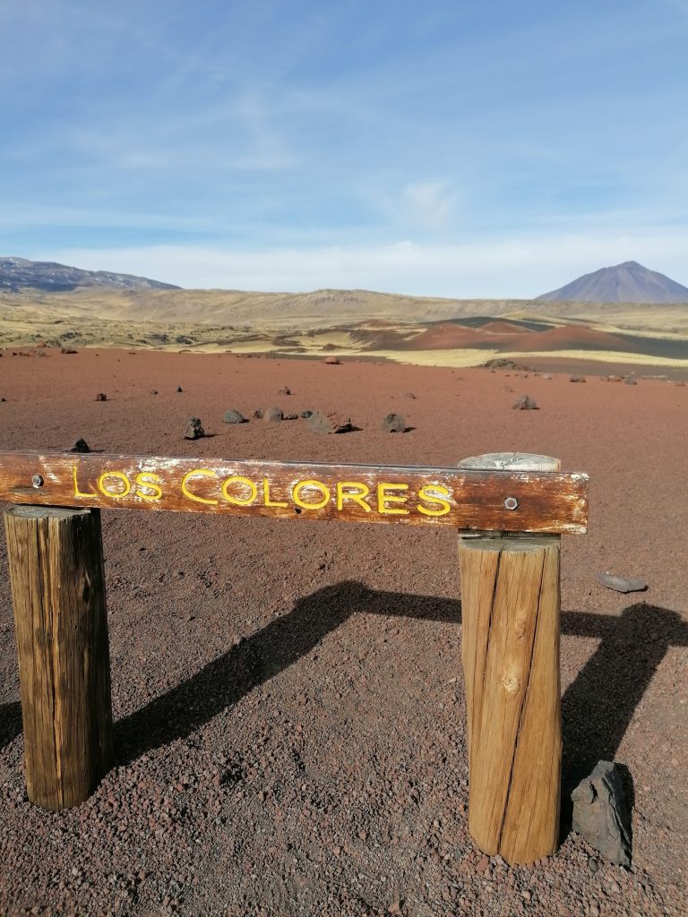 Danach geht es zu einem Ort, den ich schon kenne. Ach nee, heißt nur gleich, ist aber anders: die Tierra de Colores: Anders als die in Perito Moreno, aber nicht weniger spektakulär: Das schwarze Vulkangranulat, bedeckt von roten Steinchen aus oxidierten eisenhaltigen Steinen und die gelben Pampasträucher geben ein Meisterwerk der Natur ab: