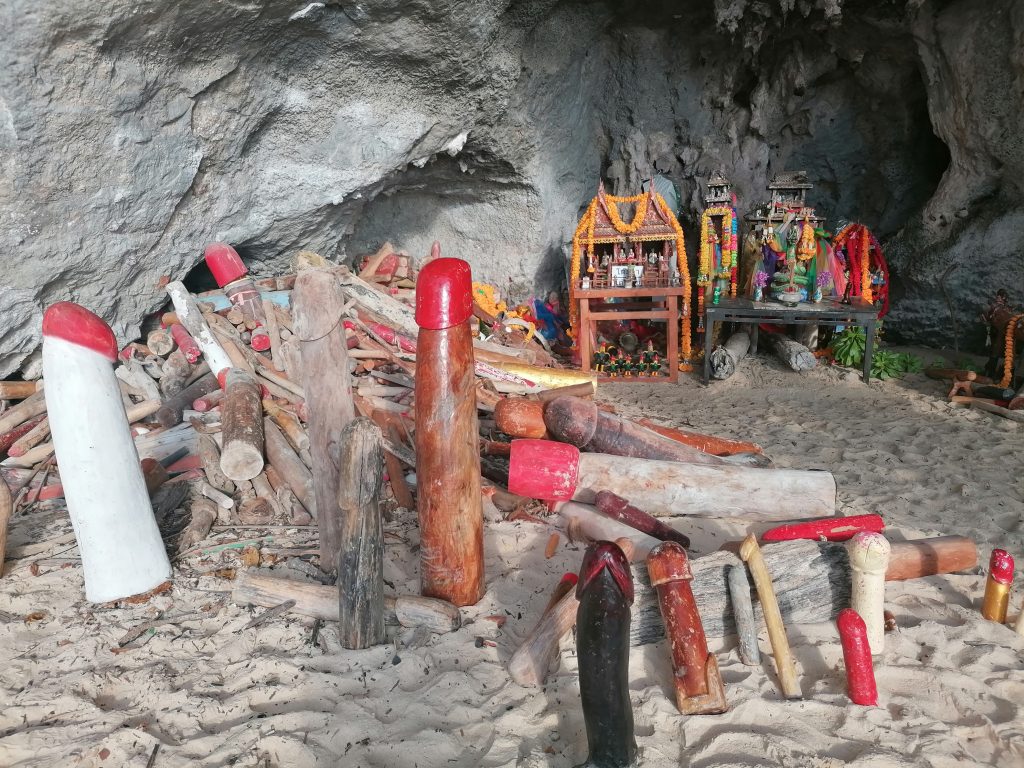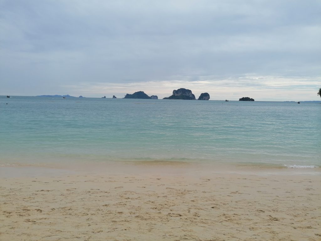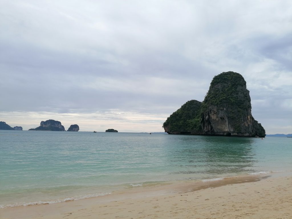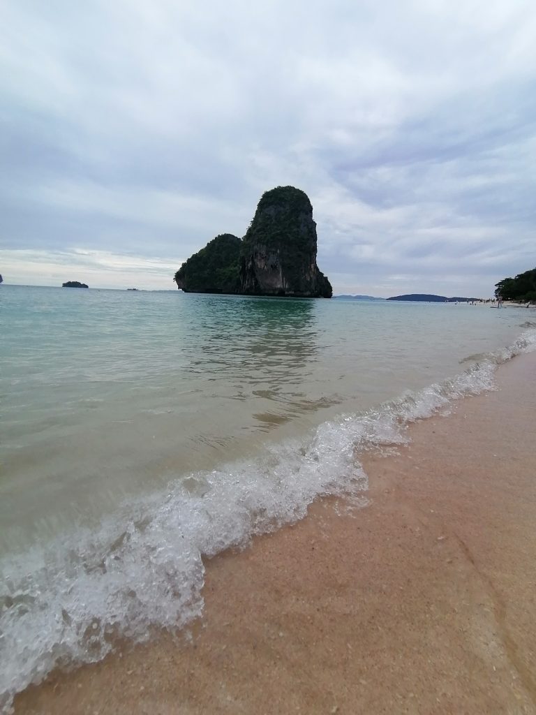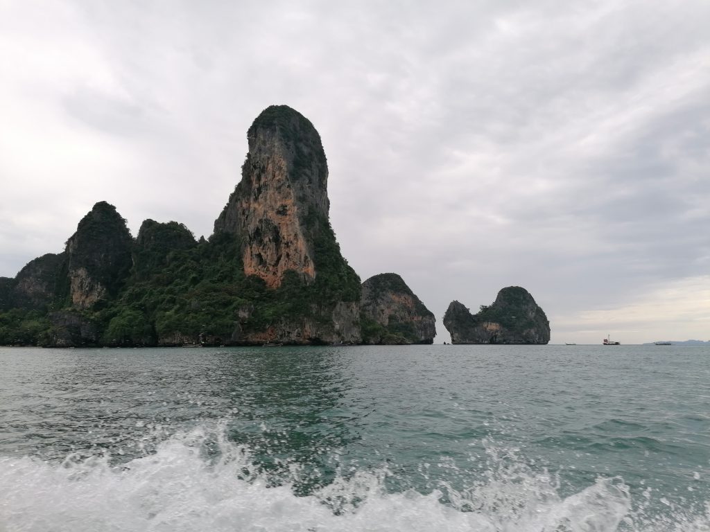 Gemeinsam mit anderen Passagieren wate ich ins Wasser und klettere dann über eine kleine Leiter ins das Holzboot. Diese pendeln regelmäßig zwischen den beiden Stränden hin und her, ich muss nur zusehen, dass ich pünktlich mit dem letzten zurückkomme. Das fährt in vier Stunden, sollte also gut machbar sein. Wir fahren los, immer an der Küste entlang, etwa zwanzig Minuten später kommen wir an einem anderen Strand an. Während der Fahrt beobachte ich begeistert die Felsen, die aus dem Meer ragen und die man so kennt aus den Werbeanzeigen für Thailand.