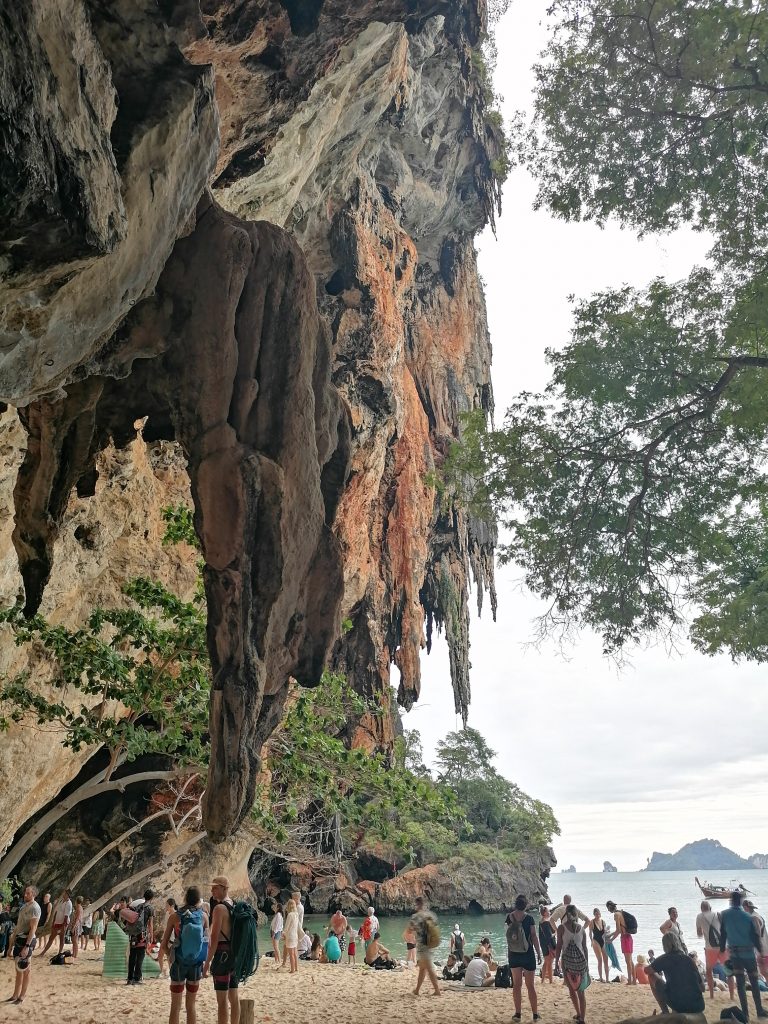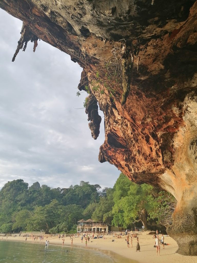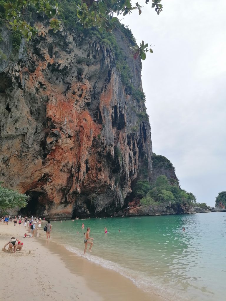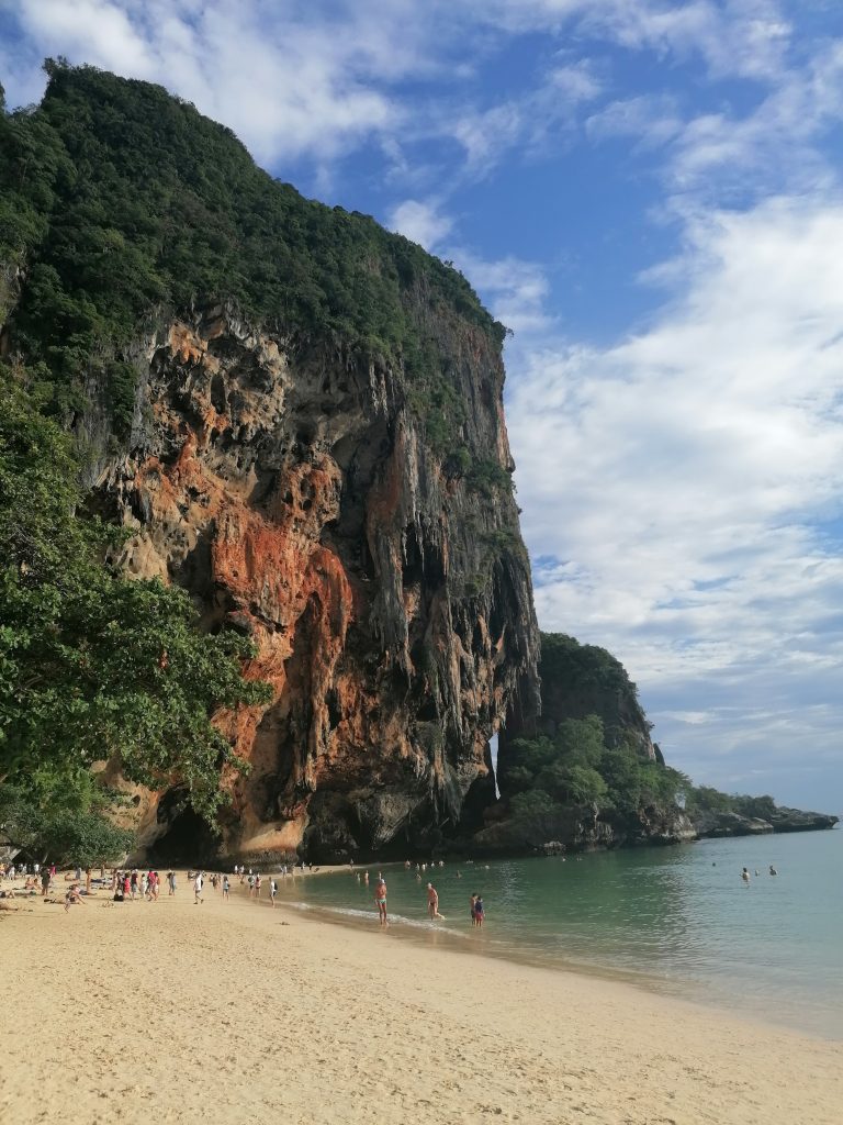 Am Ende des Weges liegt der zweite Strand. Wie man auf den Fotos sieht, ist es dort immer noch gut besucht… aber das wird in Thailand auch nie anders sein… versteckte Strände mit wenigen Touristen sind hier nur noch schwer zu finden. Aber ist schon okay, ich hatte nichts anderes erwartet. An den coolen Felswänden sehe ich ein paar Rockclimber, die sich hoch über uns allen entlang hangeln. Megakrass, aber ich hätte da viel zu viel Angst vor. Also gehe ich daran vorbei und spaziere am Strand entlang…