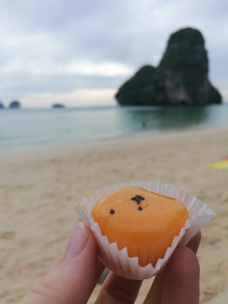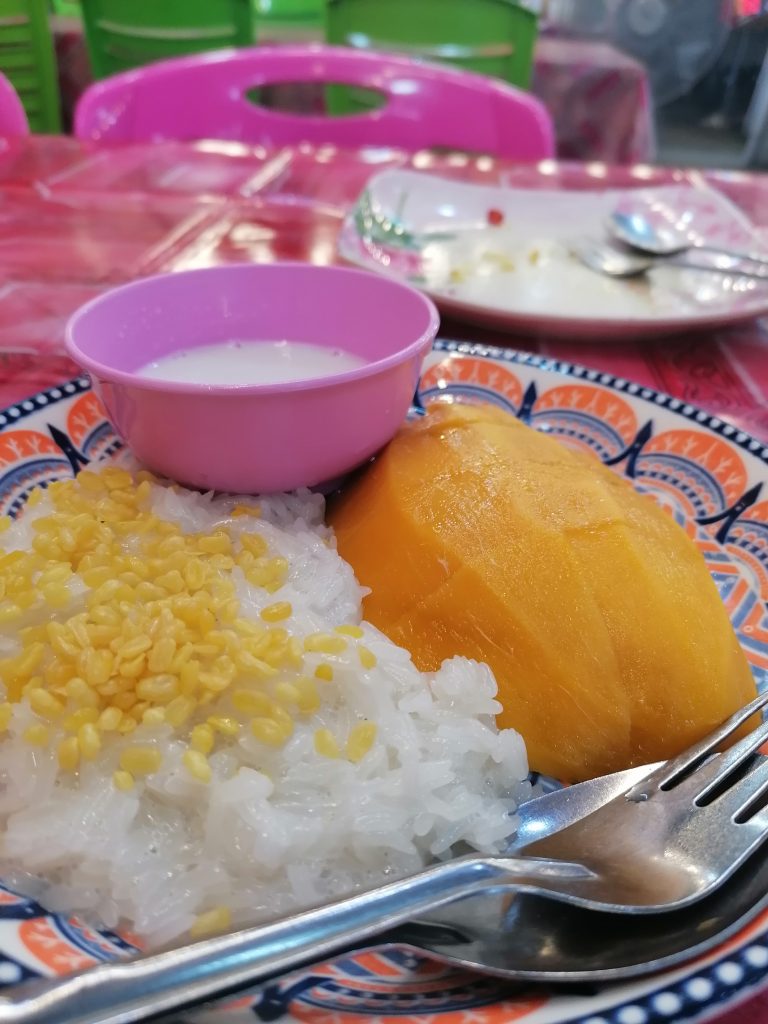 Schöner erster Strandtag! Abends gönne ich mir den berühmten thailändischen Nachtisch: Süßer „Milchreis“ mit Mango hmmmmlrlrlmmm: