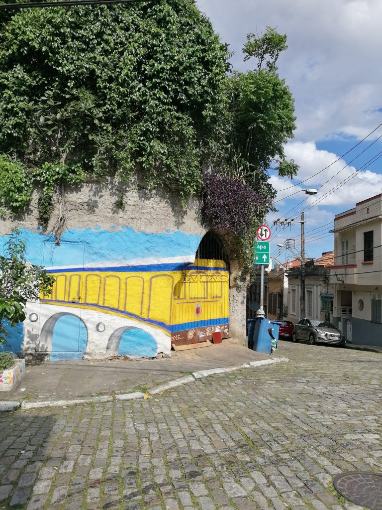 Ich spaziere noch ein bisschen durchs Viertel. Mit meiner Kokosnuss. Die für Santa Teresa typische gelbe Retro-Straßenbahn fährt heute nicht, es ist Feiertag. Aber ich finde es auch so super schön hier oben. Auch der Weg nach unten ist sehr schön: