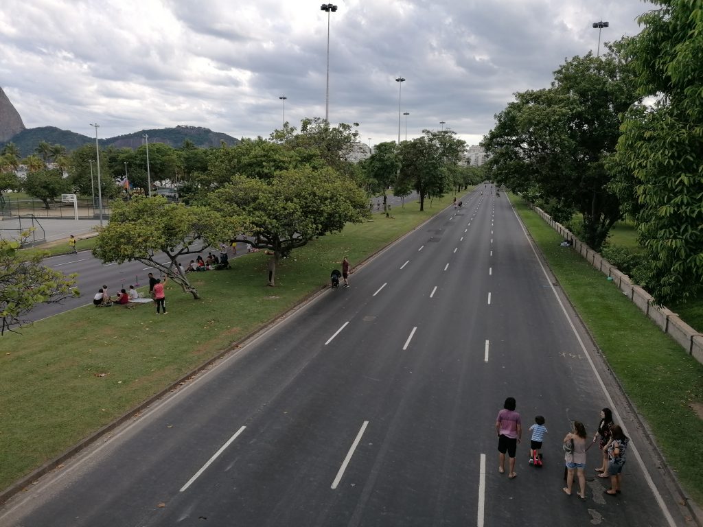 Ich beschließe noch ein bisschen weiter zu spazieren, der Strand „Flamengo“ ist nicht allzu weit entfernt. Kurz zuvor überquere ich eine Brücke, unter normalerweise eine große Straße entlangfährt. Aber nicht am Wochenende: Da ist die 8-spurige Teerlandschaft für Autos gesperrt und wird ausschließlich von Fußgängern, Joggern und Fahrradfahrern genutzt.